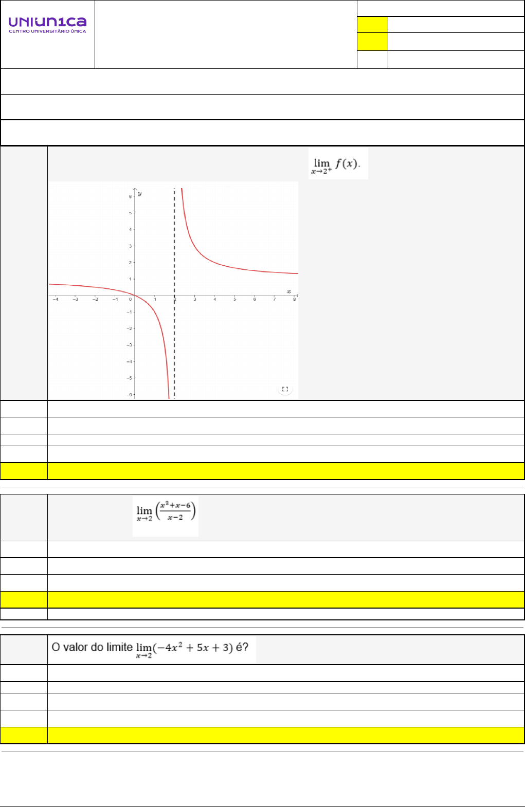 Pincel Atômico - 15/11/2024 16:50:14 1/3 VALDIENE COSTA SOARES Exercício Caminho do Conhecimento - Etapa 4 (38004) Atividade finalizada em 15/11/2024 16:49:48 (2504874 / 1) LEGENDA Resposta correta na questão # Resposta correta - Questão Anulada X Resposta selecionada pelo Aluno Disciplina: TEORIA DOS NÚMEROS [1044466] - Avaliação com 8 questões, com o peso total de 1,67 pontos [capítulos - 2] Turma: Segunda Graduação: Segunda Graduação 6 meses - Licenciatura em Matemática - Grupo: FPD-JANEIRO/2024 - SGegu0A130224 [115107] Aluno(a): 91572806 - VALDIENE COSTA SOARES - Respondeu 8 questões corretas, obtendo um total de 1,67 pontos como nota [370475_27] Questão 001 Observe o gráfico da função f(x) abaixo e determine - 2 +∞ Æ 2 X -∞ [370475_26] Questão 002 O valor do limite é? 3 0 - 5 X 5 Æ [370475_25] Questão 003 0 Æ 4 3 X - 3 Pincel Atômico - 15/11/2024 16:50:14 2/3 [370475_5] Questão 004 Dada a função , podemos afirmar que: A função f(x) não é contínua, pois o limite A função f(x) é descontínua pois não está definida para x=-2. A função f(x) é continua em x=-2, pois está definida nesse ponto do domínio. A função f(x) é contínua para qualquer valor de x pertencente ao domínio. X A função f(x) não é continua em -2, pois está definida para f(-2)=4, existe o limite [370475_30] Questão 005 X A função f(x) não é contínua, pois o limite f(x) não existe. A função f(x) é contínua para qualquer valor de x pertencente ao domínio. A função f(x) é continua em x=2, pois está definida nesse ponto do domínio. A função f(x) é descontínua pois não está definida para x=2. [370476_5] Questão 006 Para a função g, cujo gráfico é apresentado abaixo, encontre o limite 0 2 3 X 1 4 [370477_4] Questão 007 Pincel Atômico - 15/11/2024 16:50:14 3/3 1/4 5/4 X 7/4 3/4 2/3 [370475_4] Questão 008 Determine o valor do limite 7 -2 4 X -4 -16