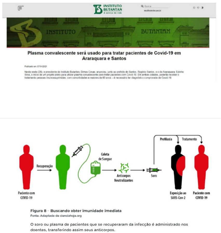 HEMATOLOGIA E BANCO DE SANGUE CASO CLÍNICO Contexto 1: A mãe de um grande amigo seu foi confirmada com infecção por COVID-19. Ela tem diversos agravantes diagnosticados que a colocam em classificação de grupo de risco em grau elevadíssimo. Muito preocupado, seu amigo que não é da área da saúde resolve pesquisar mais informações sobre a doença e sobre métodos de tratamento atuais. Lendo diversos sites, se depara com a seguinte notícia: Seu amigo não é da área da saúde e resolve te ligar para pedir auxílio para entender o que é plasma convalescente e como uma pessoa com COVID poderia ser tratada com esse “tal soro”. Pergunta 1 Para tornar mais fácil sua explicação, você envia a Figura 8 pelo aplicativo de mensagens ao seu amigo. E complementa o envio da foto com a explicação acerca do assunto. Qual a sua mensagem abaixo melhor explicaria o que é plasma convalescente e porquê pode ser um importante adjuvante no tratamento de pacientes infectados por SARS-CoV-2? ( ) O paciente em vermelho à esquerda, já foi infectado pelo vírus e se recuperou. Passando bem, entende-se que já desenvolveu anticorpos para o vírus. Com a coleta do sangue dessa pessoa, podemos processar o sangue para separar esses anticorpos e assim, doá-los para outras pessoas cujo próprio organismo está com dificuldade de combater a infecção. Seria um “transplante de imunidade”, que chamamos de imunização passiva. ( ) O plasma é a parte líquida do sangue, e é nele que estão contidas partículas virais mortas do paciente que já se recuperou da infecção. O objetivo de um tratamento utilizando plasma convalescente é transferir ao que está doente, de maneira passiva, vírus em fragmentos, para auxiliar na imunização do receptor e assim, na doença. ( ) O plasma é a parte líquida do sangue, e é nele que estão contidos os anticorpos. O objetivo de um tratamento utilizando plasma convalescente é transferir ao paciente, de maneira passiva, um quantitativo de anticorpos suficiente para auxiliar no combate ao vírus, bem como, partículas virais de cepas adicionais para aumentar a gama de resposta do receptor. ( ) Pode-se comparar o tratamento a uma vacina imediata: ele transfere anticorpos contra o coronavírus de forma passiva, e estudos mostram que em 3 dias o paciente já está recuperado da infecção do COVID, podendo inclusive ganhar alta se hospitalizado. ( ) O tratamento com plasma convalescente já está bem estabelecido e atualmente já é o tratamento de escolha para infectados agudos, vacinados ou não, de grupo de risco. Contexto 2: Auxiliando seu amigo a entender o que é e para que serve a doação de plasma convalescente, você decide enviar um vídeo da Universidade Federal de Minas Gerais, que explica mais sobre o assunto. Pergunta 2 Seu amigo entendeu o que é transfusão de plasma convalescente e para que serve. E cria um grupo no WhatsApp com você e outros familiares dele, para estimular a doação de pessoas de sua família para a mãe doente. Ele então, toma à frente e resolve explicar aos participantes do grupo sobre o assunto. Você, como participante do grupo, fica muito feliz em ver como seus conhecimentos em Biomedicina estão auxiliando em melhorias na sociedade e à família de seu amigo. Contudo, eis que durante as explicações, seu amigo faz uma afirmação incorreta. Qual das afirmações abaixo, você precisará responder, corrigindo-a (ou seja, qual está incorreta)? ( ) A transfusão de plasma convalescente de um doador infectado por SARS-CoV-2 e recuperado à uma pessoa com COVID-19 ativamente no organismo, por princípio teórico, haverá neutralização dos vírus SARS-CoV-2 na pessoa adoecida, a partir dos anticorpos doados. ( ) A técnica de doação de plasma convalescente, já foi utilizada para combate de outros coronavírus, como a Síndrome de Angústia Respiratória Grave no Oriente Médio em 2012 e 2003 (beta coronavírus muito semelhante ao SARS-CoV-2), e um outro, o SARS-CoV-1 que é o beta vírus mais próximo do SARS-CoV-2, genética e estruturalmente, que causou a Síndrome de Angústia Respiratória Grave na Ásia. Isso além da pandemia de H1N1. ( ) Como a transfusão se dá exclusivamente de plasma, sem qualquer elemento figurado do sangue, é totalmente segura para o receptor e isenta de potenciais efeitos adversos/reação transfusional. ( ) Como para doação de sangue, há restrições para a doação de plasma convalescente por algumas pessoas – as mulheres, por exemplo. Isso pois há risco de desenvolvimento de TRALI (Transfusion-related Acute Lung Injury = Injúria Pulmonar Aguda Relacionada à Transfusão), uma lesão pulmonar aguda grave que ocorre durante ou dentro de seis horas após a transfusão. Essa complicação é provocada por um anticorpo gerado durante a gestação chamado anti-HLA. As mulheres não são proibidas de doar o plasma, mas para evitar qualquer complicação, a preferência é pela doação por homens. ( ) Para mulheres que quiserem ajudar, mesmo que não haja indicação para a doação de plasma convalescente, a doação de sangue ainda é uma alternativa importante; pois na doação de sangue são aproveitados todos os seus componentes, inclusive plasma, plaquetas e hemácias, servindo à outras finalidades do Hemocentro. ( ) Contexto 3 Diversos familiares e amigos do grupo do WhatsApp decidem ser voluntários para a doação de plasma para uso como coadjuvante no tratamento da familiar acometida por COVID. Pergunta 3 Para esse caso, especificamente, de doar plasma convalescente, qual a condição sine qua non? ( ) Apresentar os critérios para ser doador de sangue, tão somente. ( ) Apresentar os critérios para ser doador de sangue, e ser do sexo masculino ou mulher sem filhos ou gestações prévias (para evitar risco de TRALI) são critérios para doação. ( ) Apresentar os critérios para ser doador de sangue, e ser do sexo masculino ou mulher sem filhos ou gestações p