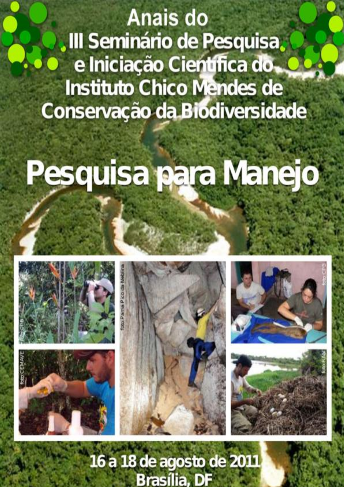Pesquisa para Manejo 1 III Seminário de Pesquisa e Iniciação Científica do Instituto Chico Mendes de Conservação da Biodiversidade 2 Ministério do Meio Ambiente Izabela Mônica Teixeira Instituto Chico Mendes de Conservação da Biodiversidade Rômulo José Fernandes Barreto Mello Diretoria de Pesquisa, Conservação e Monitoramento Marcelo Marcelino de Oliveira Coordenação Geral de Pesquisa Marília Marques Guimarães Marini Coordenação Geral de Pesquisa e Monitoramento da Biodiversidade Marília Marques Guimarães Marini Coordenação de Apoio à Pesquisa Katia Torres Ribeiro INSTITUTO CHICO MENDES DE CONSERVAÇÃO DA BIODIVERSIDADE Diretoria de Conservação da Biodiversidade Coordenação-Geral de Pesquisa EQSW 103/104 – Complexo Administrativo – Bloco D – 2º andar 70670-350 – Brasília – DF – Brasil Telefone: + 55 61 3341-9090 http://www.icmbio.gov.br Pesquisa para Manejo 3 Instituto Chico Mendes de Conservação da Biodiversidade Anais do III Seminário de Pesquisa e Iniciação Científica do Instituto Chico Mendes de Conservação da Biodiversidade Pesquisa para Manejo Brasília, 16 a 18 de agosto de 2011 Brasília – DF 2011 III Seminário de Pesquisa e Iniciação Científica do Instituto Chico Mendes de Conservação da Biodiversidade 4 Comissão organizadora Arthur Brant Pereira Caren Cristina Dalmolin Eurípia Maria da Silva Ivan Salzo Helena Krieg Boscolo Kátia Torres Ribeiro Marília Marques Guimarães Marini Comitê Institucional do Programa PIBIC – ICMBio Adriana Carvalhal Arthur Brant Pereira Kátia Torres Ribeiro Marília Marques Guimarães Marini Rosemary de Jesus Oliveira Comitê Externo do Programa PIBIC – ICMBio Carlos Eduardo Grelle – UFRJ Deborah Maria Faria – UESC – BA Mercedes Bustamante - UnB Rosana Tidon - UnB Organização do conteúdo Elizabeth M. M. de Albuquerque Martins Ivan Salzo Kátia Torres Ribeiro Capa e projeto gráfico Denys Márcio de Sousa Equipe de apoio Eglaísa Sousa Evany Jose Vilela Vieira Apoio - CNPq, MMA Catalogação na fonte – Biblioteca do ICMBio S471a Seminário de Pesquisa e Iniciação Científica do Instituto Chico Mendes de Conservação da Biodiversidade (3.: 2011: Brasília, DF) Anais do III Seminário de Pesquisa e Iniciação Científica do Instituto Chico Mendes de Conservação da Biodiversidade: pesquisa para manejo / Elizabeth Maria Maia de Albuquerque Martins, Ivan Salzo, Katia Torres Ribeiro (orgs.). -- Brasília: Instituto Chico Mendes de Conservação da Biodiversidade - ICMBio, 2011. 132 p. ISSN 2237-6488 1. Meio ambiente. 2. Biodiversidade. 3. Áreas Protegidas. 4. Manejo. I. Martins, Elizabeth Maria Maia de Albuquerque. II. Salzo, Ivan. III. Ribeiro, Katia Torres. IV. Título. CDU: 574 Pesquisa para Manejo 5 Apresentação Às vésperas de completar o quarto ano de existência, pode-se afirmar que o Instituto Chico Mendes investiu fortemente na criação de uma estrutura física e gerencial que, juntamente com o planejamento estratégico, tem lhe permitido firmar a própria identidade no panorama do serviço público brasileiro. É inegável que ainda temos muitos desafios, porém várias conquistas foram alcançadas. Contamos hoje, por exemplo, com um sistema arrojado de formação continuada de pessoas. A publicação de planos de manejo e a formação de conselhos das unidades de conservação têm alcançado taxas recordes. Avaliamos o estado de conservação de cada vez mais espécies, tendo inclusive lançado uma publicação – a revista Biodiversidade Brasileira – para auxiliar nesse processo, e elaboramos e eimplementamos mais e mais planos de ação para as espécies sob risco de extinção, com ampla participação da sociedade. Entre tantas conquistas, consideramos motivo de destaque a realização do III Seminário de Pesquisa e Iniciação Científica. Este evento estimula uma integração cada vez maior da pesquisa, da avaliação e do monitoramento à cultura institucional do Instituto Chico Mendes. Da pesquisa para o manejo, e o manejo gerando conhecimento. Prova disso é o crescimento no número de resumos publicados nos Anais dos Seminários. Em 2009, foram 55 resumos; no ano seguinte, 62; e em 2011, houve um salto para 115 resumos publicados neste volume. Uma apreciação dos números anteriores permite também visualizar que cada vez mais temas estão sendo integrados à discussão sobre pesquisa. O aumento da produção científica observada neste Seminário e a crescente integração entre pesquisa, manejo e gestão devem-se, em parte, à estratégia da DIBIO de planejar e selecionar as pesquisas a serem financiadas por meio da Chamada Interna de projetos; mecanismo este que visa o aperfeiçoamento da capacidade de elaborar projetos relacionados à gestão, cobrança de resultados e otimização dos recursos. Por outro lado, tem-se a crescente percepção de que muito do que fazemos cotidianamente é base de pesquisa e geração de conhecimento, e que o fazer pesquisa é uma ferramenta poderosa de compreensão de nossa ação, e de compartilhamento de nossa visão. É uma ferramenta que nos auxilia a agir com clareza e orienta as tomadas de decisão. A atividade científica do Instituto deve ter sua própria identidade, e esta identidade deve estar sempre em discussão e aprimoramento. O tema do III Seminário de Pesquisa e Iniciação Científica, “Pesquisa para o Manejo”, revela essa preocupação e tem o propósito de promover o debate sobre o papel da pesquisa no Instituto e a importância de sua integração com o manejo da biodiversidade. Nossos desafios em tratar adequadamente e amplamente as questões ambientais, voltadas para as ações efetivas de conservação, de forma que a sociedade compreenda e se solidarize com nossa missão, e de entender nossas ações como parte da gestão territorial do País, requerem uma pesquisa atuante, fortemente integrada à tomada de decisão, seja na sua elaboração, seja na análise de seus efeitos. O 