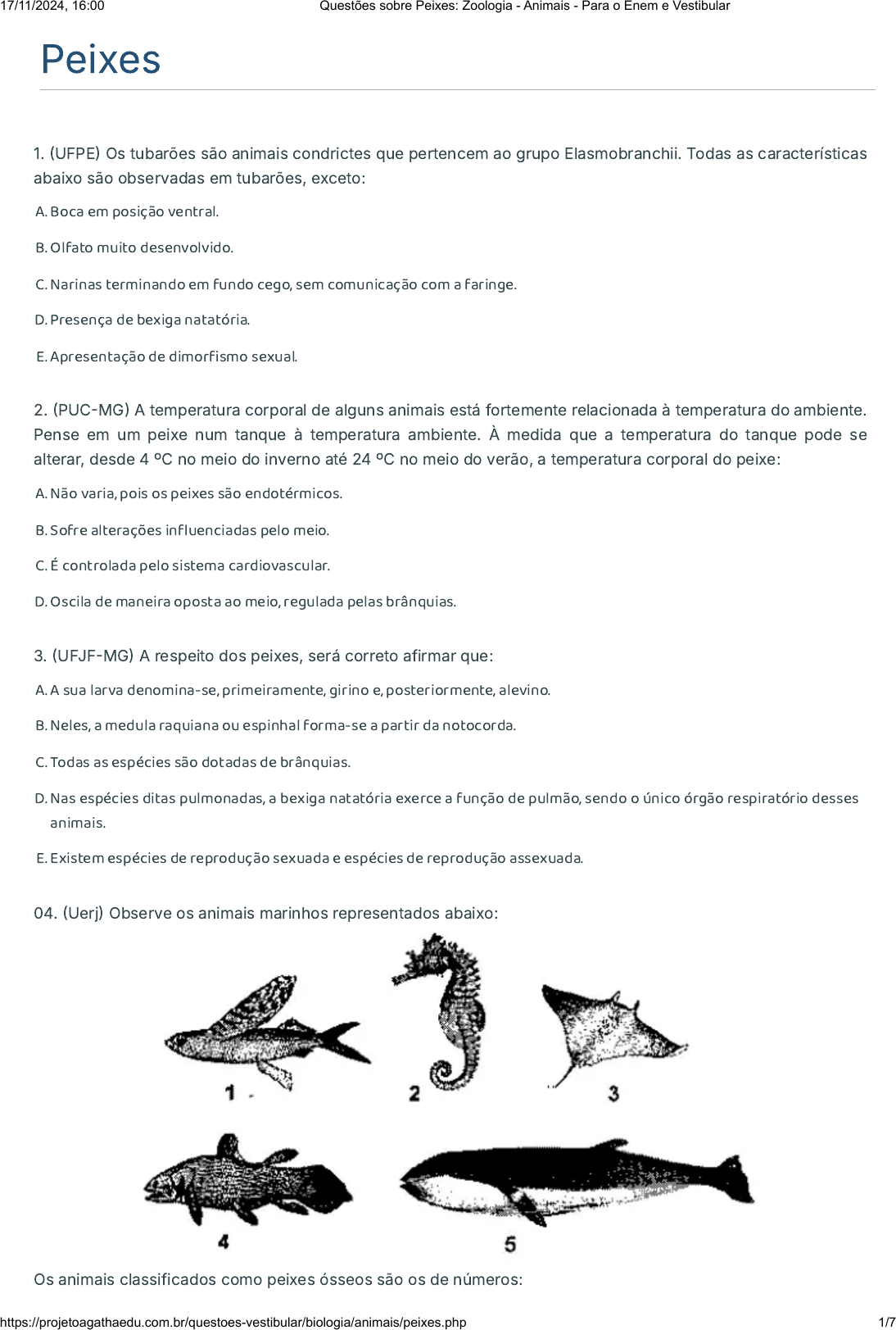 Peixes 1. �UFPE� Os tubarões são animais condrictes que pertencem ao grupo Elasmobranchii. Todas as características abaixo são observadas em tubarões, exceto: A. Boca em posição ventral. B. Olfato muito desenvolvido. C. Narinas terminando em fundo cego, sem comunicação com a faringe. D. Presença de bexiga natatória. E. Apresentação de dimor�smo sexual. 2. �PUC�MG� A temperatura corporal de alguns animais está fortemente relacionada à temperatura do ambiente. Pense em um peixe num tanque à temperatura ambiente. À medida que a temperatura do tanque pode se alterar, desde 4 ºC no meio do inverno até 24 ºC no meio do verão, a temperatura corporal do peixe: A. Não varia, pois os peixes são endotérmicos. B. Sofre alterações in�uenciadas pelo meio. C. É controlada pelo sistema cardiovascular. D. Oscila de maneira oposta ao meio, regulada pelas brânquias. 3. �UFJF�MG� A respeito dos peixes, será correto afirmar que: A. A sua larva denomina-se, primeiramente, girino e, posteriormente, alevino. B. Neles, a medula raquiana ou espinhal forma-se a partir da notocorda. C. Todas as espécies são dotadas de brânquias. D. Nas espécies ditas pulmonadas, a bexiga natatória exerce a função de pulmão, sendo o único órgão respiratório desses animais. E. Existem espécies de reprodução sexuada e espécies de reprodução assexuada. 04. �Uerj� Observe os animais marinhos representados abaixo: Os animais classificados como peixes ósseos são os de números: 17/11/2024, 16:00 Questões sobre Peixes: Zoologia - Animais - Para o Enem e Vestibular https://projetoagathaedu.com.br/questoes-vestibular/biologia/animais/peixes.php 1/7 A. 1, 3 e 5. B. 1, 2 e 4. C. 2, 3 e 4. D. 2, 4 e 5. 05. �Ufscar-SP� Assinale a alternativa que associa corretamente os números às estruturas por eles indicadas no esquema abaixo: A. 1 - opérculo; 4 - nadadeira caudal. B. 4 - nadadeira anal; 5 - linha lateral. C. 5 - linha lateral; 2 - nadadeira pélvica. D. 3 - nadadeira pélvica; 2 - nadadeira dorsal. E. 4 - nadadeira pélvica; 1 - linha lateral. 06. �Santa Casa) Osteíctes e condrictes são dois grupos de vertebrados que chamamos genericamente de peixes. Ao se analisar a anatomia e a fisiologia desses animais, uma semelhança encontrada entre osteíctes e condrictes é A. A presença da linha lateral. B. O embrião envolto pelo âmnion. C. A presença de bexiga natatória. D. A origem dermoepidérmica das escamas. E. A mistura de sangue no ventrículo cardíaco. 07. �UECE� Sobre a maioria dos peixes ósseos, é correto afirmar que A. Possuem um coração com duas cavidades (aurícula e ventrículo) por onde circula sangue venoso e arterial, de cor vermelha bastante intensa. B. Possuem estruturas denominadas Ampolas de Lorenzini, que funcionam como canais sensitivos capazes de detectar as correntes elétricas dos músculos de outros organismos. C. Sua bexiga natatória compreende um grande saco de paredes �nas e irrigadas, preenchido por gases que permitem o ajuste do peso do corpo do peixe de acordo com a profundidade em que ele se encontra. D. Apresentam escamas placoides, compostas de esmalte, dentina, vasos e nervos. 08. �UFRR� Ao longo do processo evolutivo, os animais desenvolveram diversos mecanismos para regular o processo osmótico a que estão sujeitos. Esses mecanismos constituem o que se denomina osmorregulação. Os 17/11/2024, 16:00 Questões sobre Peixes: Zoologia - Animais - Para o Enem e Vestibular https://projetoagathaedu.com.br/questoes-vestibular/biologia/animais/peixes.php 2/7 peixes teleósteos marinhos vivem em um ambiente hipertônico e estão em constante risco de perder água para o meio e, por isso, apresentam os mecanismos de osmorregulação bem desenvolvidos. Sobre esses mecanismos nos telósteos é CORRETO afirmar que: A. A concentração de sais em seus �uidos corpóreos permite que o sangue se mantenha isotônico em relação à água do mar. B. O baixo nível de solutos no sangue diminui os problemas de regulação osmótica, pois reduz a saída de água por osmose. C. A ingestão de água do mar e o transporte ativo de sais pelas brânquias compensam a perda osmótica de água para o meio. D. A produção de urina diluída, produzida em grandes quantidades, garante que os problemas de regulação osmótica sejam resolvidos. E. A absorção de sais através de suas escamas permeáveis se constitui em um mecanismo e�ciente para garantir a osmorregulação dessas espécies. 09. �EMESCAM� Nos peixes elasmobrânquios, como o tubarão, à boca, em localização ventral, segue-se a faringe. Desta estrutura, o alimento atravessa um esôfago curto que leva ao estômago onde tem início o fenômeno da digestão. A massa em transformação passa para o intestino onde tem o seu trânsito retardado e é exposta a uma maior área de superfície de absorção. Essas duas últimas propriedades descritas são desenvolvidas pelo (a) A. Válvula espiral. B. Ti�ossole. C. Ceco gástrico. D. Secreção pancreática. E. Clásper. 10. �Albert Einstein) Os peixes cartilaginosos são animais ureotélicos, uma vez que produzem ureia como excreta nitrogenada. Entretanto, os rins desses peixes reabsorvem a ureia em vez de eliminá-la na urina, como fazem os mamíferos. Dessa forma, a concentração de ureia no sangue de tubarões e raias chega a ser 100 vezes maior que a observada no sangue de mamíferos. Isso explica o fato de os fluídos corporais desses peixes serem ligeiramente mais concentrados que a própria água do mar. Assim, é correto afirmar que os peixes cartilaginosos A. Reutilizam a ureia retida no corpo para fabricar novos aminoácidos e, por isso, requerem menos alimentos proteicos que os mamíferos. B. Convertem a ureia retida no corpo em ácido úrico, um tipo de excreta mais facilmente eliminado em ambientes aquáticos. C. Por osmose, ganham água do meio e, para evitar o excesso de água em seus �uidos corporais, 