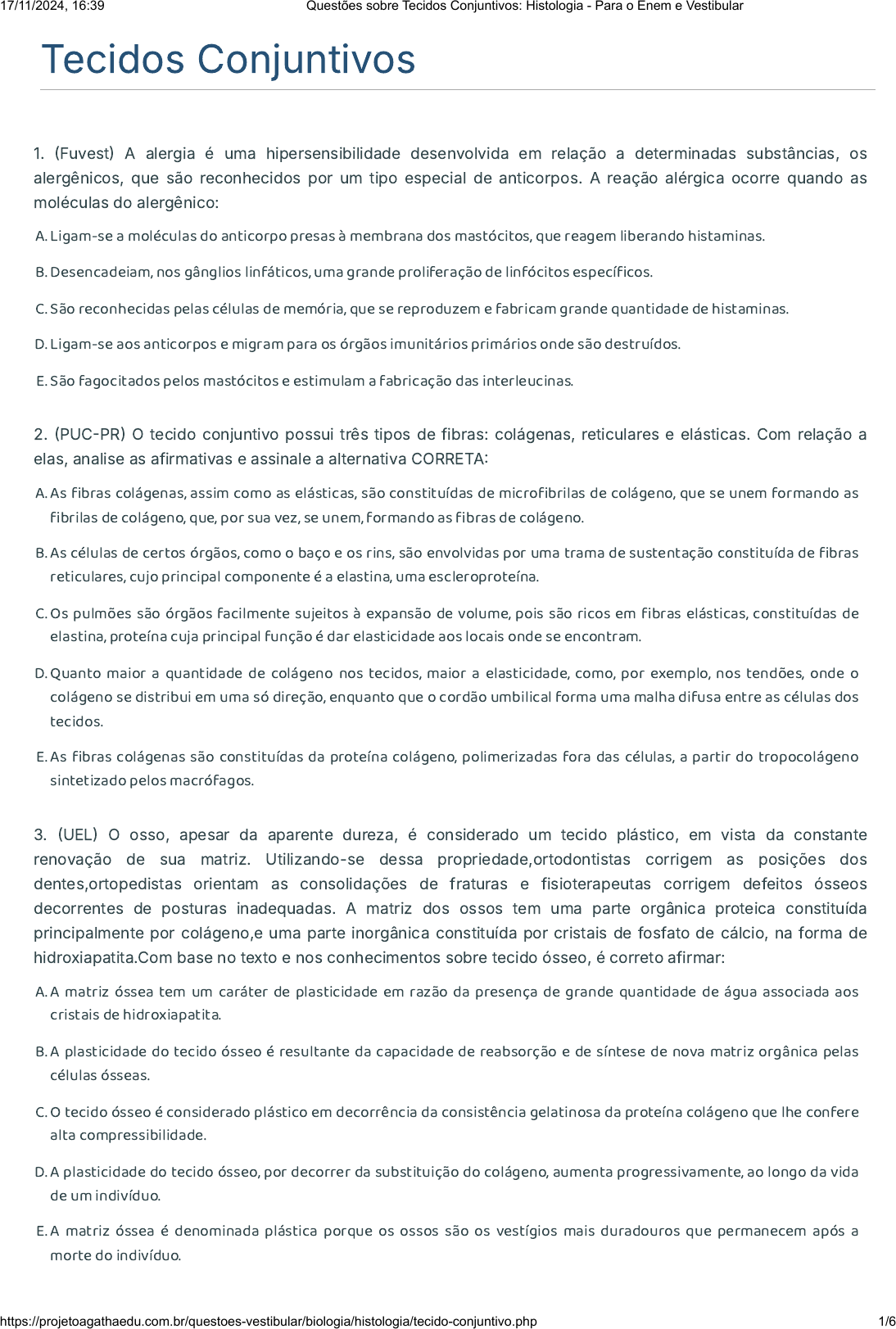 Tecidos Conjuntivos 1. �Fuvest� A alergia é uma hipersensibilidade desenvolvida em relação a determinadas substâncias, os alergênicos, que são reconhecidos por um tipo especial de anticorpos. A reação alérgica ocorre quando as moléculas do alergênico: A. Ligam-se a moléculas do anticorpo presas à membrana dos mastócitos, que reagem liberando histaminas. B. Desencadeiam, nos gânglios linfáticos, uma grande proliferação de linfócitos especí�cos. C. São reconhecidas pelas células de memória, que se reproduzem e fabricam grande quantidade de histaminas. D. Ligam-se aos anticorpos e migram para os órgãos imunitários primários onde são destruídos. E. São fagocitados pelos mastócitos e estimulam a fabricação das interleucinas. 2. �PUC�PR� O tecido conjuntivo possui três tipos de fibras: colágenas, reticulares e elásticas. Com relação a elas, analise as afirmativas e assinale a alternativa CORRETA� A. As �bras colágenas, assim como as elásticas, são constituídas de micro�brilas de colágeno, que se unem formando as �brilas de colágeno, que, por sua vez, se unem, formando as �bras de colágeno. B. As células de certos órgãos, como o baço e os rins, são envolvidas por uma trama de sustentação constituída de �bras reticulares, cujo principal componente é a elastina, uma escleroproteína. C. Os pulmões são órgãos facilmente sujeitos à expansão de volume, pois são ricos em �bras elásticas, constituídas de elastina, proteína cuja principal função é dar elasticidade aos locais onde se encontram. D. Quanto maior a quantidade de colágeno nos tecidos, maior a elasticidade, como, por exemplo, nos tendões, onde o colágeno se distribui em uma só direção, enquanto que o cordão umbilical forma uma malha difusa entre as células dos tecidos. E. As �bras colágenas são constituídas da proteína colágeno, polimerizadas fora das células, a partir do tropocolágeno sintetizado pelos macrófagos. 3. �UEL� O osso, apesar da aparente dureza, é considerado um tecido plástico, em vista da constante renovação de sua matriz. Utilizando-se dessa propriedade,ortodontistas corrigem as posições dos dentes,ortopedistas orientam as consolidações de fraturas e fisioterapeutas corrigem defeitos ósseos decorrentes de posturas inadequadas. A matriz dos ossos tem uma parte orgânica proteica constituída principalmente por colágeno,e uma parte inorgânica constituída por cristais de fosfato de cálcio, na forma de hidroxiapatita.Com base no texto e nos conhecimentos sobre tecido ósseo, é correto afirmar: A. A matriz óssea tem um caráter de plasticidade em razão da presença de grande quantidade de água associada aos cristais de hidroxiapatita. B. A plasticidade do tecido ósseo é resultante da capacidade de reabsorção e de síntese de nova matriz orgânica pelas células ósseas. C. O tecido ósseo é considerado plástico em decorrência da consistência gelatinosa da proteína colágeno que lhe confere alta compressibilidade. D. A plasticidade do tecido ósseo, por decorrer da substituição do colágeno, aumenta progressivamente, ao longo da vida de um indivíduo. E. A matriz óssea é denominada plástica porque os ossos são os vestígios mais duradouros que permanecem após a morte do indivíduo. 17/11/2024, 16:39 Questões sobre Tecidos Conjuntivos: Histologia - Para o Enem e Vestibular https://projetoagathaedu.com.br/questoes-vestibular/biologia/histologia/tecido-conjuntivo.php 1/6 04. �UFPI� Fazem parte dos tecidos conjuntivos, exceto: A. Tecido ósseo B. Tecido muscular C. Tecido adiposo D. Tecido cartilaginoso E. Tecido sanguíneo 05. �Unirio-RJ� A osteoporose é a mais comum de todas as doenças ósseas em adultos, especialmente na velhice. Estima-se que 5,5 milhões de brasileiros sofram dessa doença, responsável por 1 milhão dos casos registrados de fraturas, dos quais 50%, na coluna vertebral.Até novembro de 2003, os medicamentos usados no Brasil no combate à osteoporose tinham como objetivo reduzir a atividade das células responsáveis pela destruição da matriz óssea. A partir desta data, foi colocado à disposição do doente um novo medicamento que age estimulando a reconstituição óssea.�Adaptado: Revista Veja, 2003� Este novo medicamento tem como função: A. Aumentar o número de osteoblastos, diminuindo a desproporção metabólica entre osteoblastos e osteoclastos. B. Estimular a produção do paratormônio, diminuindo a ação dos osteoblastos. C. Aumentar o metabolismo dos osteoclastos, diminuindo a desmineralização do osso. D. Inibir a produção de calcitonina, hormônio responsável pela deposição de cálcio na matriz óssea. E. Diminuir o metabolismo dos osteoblastos responsáveis pela destruição da matriz óssea. 06. �UFSC� No tecido conjuntivo, cada um dos elementos realiza funções específicas. Assim, as fibras colágenas orientadas paralelamente e a substância fundamental intensamente mineralizada se caracterizam, respectivamente, pelas funções de: A. Dureza e armazenamento. B. Tração e resistência. C. Defesa e preenchimento. D. Elasticidade e reserva. E. Flexibilidade e tenacidade 07. �UFRGS�RS� Deixando um osso de galinha imerso em uma solução fraca de ácido clorídrico, depois de três dias, ao retirá-lo, constata-se que ele: A. Adquire maior consistência, porque o ácido clorídrico reage com o cálcio do osso, formando cloreto de cálcio, que se solidi�ca. B. Permanece totalmente escuro pela deposição de uma camada de cloreto de cálcio. C. Reveste-se de uma membrana �brosa de osseína. D. Torna-se �exível, porque o ácido clorídrico destrói os sais de cálcio. E. Destrói-se completamente, corroído pelo ácido. 08. �Unicamp-SP� A osteoporose, principal causa de quedas entre idosos, é resultado da perda gradual da densidade da matriz óssea, que é remodelada por osteoblastos e osteoclastos. Segundo os
