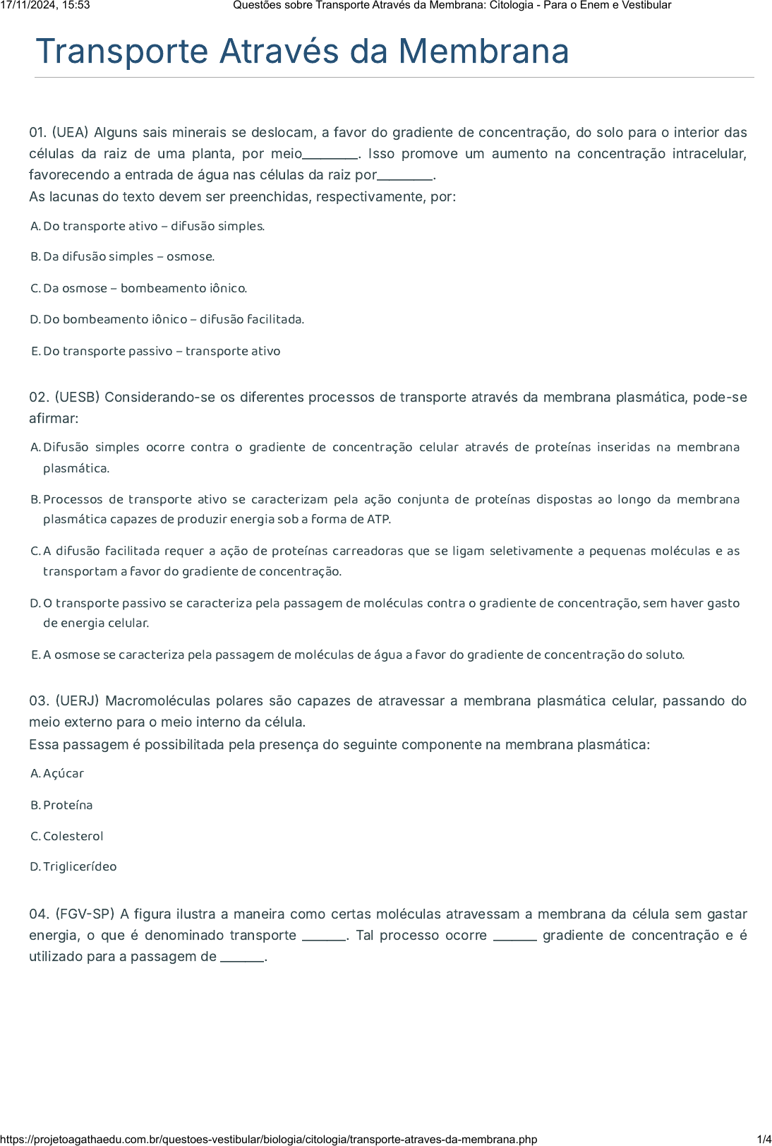 Transporte Através da Membrana 01. �UEA� Alguns sais minerais se deslocam, a favor do gradiente de concentração, do solo para o interior das células da raiz de uma planta, por meio_________. Isso promove um aumento na concentração intracelular, favorecendo a entrada de água nas células da raiz por_________. As lacunas do texto devem ser preenchidas, respectivamente, por: A. Do transporte ativo – difusão simples. B. Da difusão simples – osmose. C. Da osmose – bombeamento iônico. D. Do bombeamento iônico – difusão facilitada. E. Do transporte passivo – transporte ativo 02. �UESB� Considerando-se os diferentes processos de transporte através da membrana plasmática, pode-se afirmar: A. Difusão simples ocorre contra o gradiente de concentração celular através de proteínas inseridas na membrana plasmática. B. Processos de transporte ativo se caracterizam pela ação conjunta de proteínas dispostas ao longo da membrana plasmática capazes de produzir energia sob a forma de ATP. C. A difusão facilitada requer a ação de proteínas carreadoras que se ligam seletivamente a pequenas moléculas e as transportam a favor do gradiente de concentração. D. O transporte passivo se caracteriza pela passagem de moléculas contra o gradiente de concentração, sem haver gasto de energia celular. E. A osmose se caracteriza pela passagem de moléculas de água a favor do gradiente de concentração do soluto. 03. �UERJ� Macromoléculas polares são capazes de atravessar a membrana plasmática celular, passando do meio externo para o meio interno da célula. Essa passagem é possibilitada pela presença do seguinte componente na membrana plasmática: A. Açúcar B. Proteína C. Colesterol D. Triglicerídeo 04. �FGV�SP� A figura ilustra a maneira como certas moléculas atravessam a membrana da célula sem gastar energia, o que é denominado transporte _______. Tal processo ocorre _______ gradiente de concentração e é utilizado para a passagem de _______. 17/11/2024, 15:53 Questões sobre Transporte Através da Membrana: Citologia - Para o Enem e Vestibular https://projetoagathaedu.com.br/questoes-vestibular/biologia/citologia/transporte-atraves-da-membrana.php 1/4 Assinale a alternativa que completa, correta e respectivamente, as lacunas da oração. A. Facilitado … independentemente do … micromoléculas B. Passivo … a favor do … aminoácidos e monossacarídeos C. Ativo … contra o … íons D. Fagocitário… na presença de … polissacarídeos E. Celular … na ausência de … peptídeos 05. �PUC�RS� A conservação de alimentos exige que se iniba a proliferação microbiana. Há uma variedade de técnicas capazes de atingir esse objetivo, entre elas a salga de carnes e a produção de conservas e compotas por meio de soluções concentradas de sal ou açúcar. Com relação a isso, é correto afirmar que, A. No processo da salga de carnes, há entrada de sal nas células por osmose. B. No charque, a salga impede o crescimento de fungos como o Clostridium botulinum. C. Ao armazenar uma lata de pêssegos em calda à temperatura de 0°C, haverá congelamento. D. Numa salmoura concentrada, as células de microorganismos perdem água, �cando murchas ou desidratadas. 06. �UECE� Em uma aula de Biologia Geral, o Professor mostrou, por meio de um experimento comparativo, que quando glóbulos vermelhos são colocados em uma solução hipotônica, podem se romper devido à excessiva entrada de água por osmose, mas quando o mesmo é feito com uma célula de origem vegetal, apesar de ficar túrgida, ela não se rompe. A estrutura responsável por esse resultado é denominada A. Membrana plasmática. B. Parede celular. C. Vacúolo vegetal. D. Vacúolo contrátil. 07. �UEFS� 17/11/2024, 15:53 Questões sobre Transporte Através da Membrana: Citologia - Para o Enem e Vestibular https://projetoagathaedu.com.br/questoes-vestibular/biologia/citologia/transporte-atraves-da-membrana.php 2/4 A partir da análise da ilustração que destaca um dos mecanismos de transporte de substâncias através da membrana, podese afirmar que se trata de: A. Mecanismo denominado difusão facilitada no qual se realiza por meio de permeases intermembranas. B. Mecanismo denominado osmose em meio hipertônico no qual os íons difundem livremente pela bicamada lipídica. C. Mecanismo denominado difusão simples, pelo qual a proteína transportadora de íons está a favor do gradiente de concentração. D. Mecanismo denominado transporte ativo no qual ocorre gasto de energia, pois atua em sentido contrário à difusão. E. Mecanismo denominado transporte por poros da membrana plasmática que envolve um sistema enzimático complexo que necessita de gasto de energia. 08. �UFRGS� Considere o enunciado abaixo e as quatro propostas para completá-lo. No processo de transporte, através da membrana, pode ocorrer 1 - a difusão facilitada, um tipo de transporte passivo. 2 - o transporte passivo, a favor do gradiente de concentração. 3 - o transporte ativo, feito com gasto de energia. 4 - a difusão simples, independemente do gradiente de concentração. Quais propostas estão corretas? A. Apenas 2. B. Apenas 2 e 4. C. Apenas 1, 2 e 3. D. Apenas 1, 2 e 4. E. Apenas 1, 3 e 4. 09. �UEMG� Nos autos de condenação de revoltosos do Brasil Colônia, como Tiradentes, era comum constar que, além da pena de morte e do esquartejamento dos corpos, seus bens seriam confiscados e suas terras seriam salgadas, para que nada mais ali nascesse. O ato de salgar a terra realmente provoca a morte das plantas porque o excesso de sal na terra A. Di�culta a absorção de íons minerais pelas raízes, por transporte ativo. B. Impede a ação das proteínas transportadoras das membranas das células da raiz. C. Estimula maior absorção de água pelas células da raiz, provocando turgescência e lise celular. 17/11/2024, 15:53 Questões sobre Transporte Através da Membrana: Citologia - 