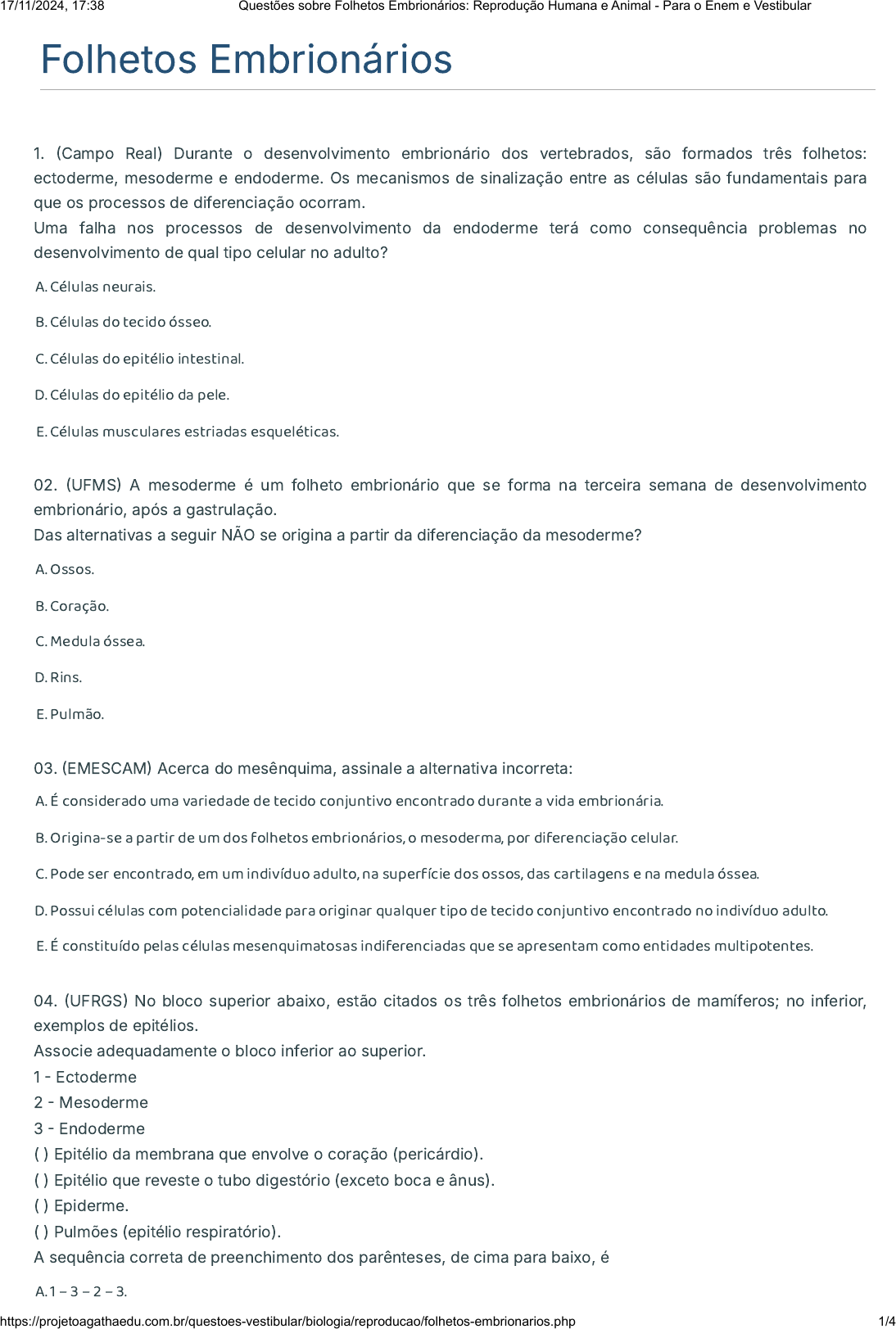 Folhetos Embrionários 1. �Campo Real) Durante o desenvolvimento embrionário dos vertebrados, são formados três folhetos: ectoderme, mesoderme e endoderme. Os mecanismos de sinalização entre as células são fundamentais para que os processos de diferenciação ocorram. Uma falha nos processos de desenvolvimento da endoderme terá como consequência problemas no desenvolvimento de qual tipo celular no adulto? A. Células neurais. B. Células do tecido ósseo. C. Células do epitélio intestinal. D. Células do epitélio da pele. E. Células musculares estriadas esqueléticas. 02. �UFMS� A mesoderme é um folheto embrionário que se forma na terceira semana de desenvolvimento embrionário, após a gastrulação. Das alternativas a seguir NÃO se origina a partir da diferenciação da mesoderme? A. Ossos. B. Coração. C. Medula óssea. D. Rins. E. Pulmão. 03. �EMESCAM� Acerca do mesênquima, assinale a alternativa incorreta: A. É considerado uma variedade de tecido conjuntivo encontrado durante a vida embrionária. B. Origina-se a partir de um dos folhetos embrionários, o mesoderma, por diferenciação celular. C. Pode ser encontrado, em um indivíduo adulto, na superfície dos ossos, das cartilagens e na medula óssea. D. Possui células com potencialidade para originar qualquer tipo de tecido conjuntivo encontrado no indivíduo adulto. E. É constituído pelas células mesenquimatosas indiferenciadas que se apresentam como entidades multipotentes. 04. �UFRGS� No bloco superior abaixo, estão citados os três folhetos embrionários de mamíferos; no inferior, exemplos de epitélios. Associe adequadamente o bloco inferior ao superior. 1 � Ectoderme 2 � Mesoderme 3 � Endoderme ( ) Epitélio da membrana que envolve o coração (pericárdio). ( ) Epitélio que reveste o tubo digestório (exceto boca e ânus). ( ) Epiderme. ( ) Pulmões (epitélio respiratório). A sequência correta de preenchimento dos parênteses, de cima para baixo, é A. 1 – 3 – 2 – 3. 17/11/2024, 17:38 Questões sobre Folhetos Embrionários: Reprodução Humana e Animal - Para o Enem e Vestibular https://projetoagathaedu.com.br/questoes-vestibular/biologia/reproducao/folhetos-embrionarios.php 1/4 B. 3 – 1 – 2 – 3. C. 2 – 1 – 3 – 3. D. 3 – 3 – 1 – 2. E. 2 – 3 – 1 – 3. 05. �EMESCAM� Existem fortes evidências de que o zika vírus seja responsável por malformações do sistema nervoso em embriões no primeiro trimestre de vida intrauterina. Se devidamente comprovado, o vírus seria o responsável pelo nascimento de bebês com microcefalia, uma anomalia caracterizada por um perímetro cefálico inferior a 32 cm. Havendo comprometimento do crescimento do encéfalo da criança, o folheto embrionário, a partir do qual se originou o órgão acometido pela anomalia, é o A. Endoderma. B. Ectoderma. C. Mesoderma. D. Mesênquima. E. Hipoblasto. 06. �Faculdades Pequeno Príncipe) Durante o processo de diferenciação tecidual, os folhetos embrionários ou germinativos do ser humano darão origem aos demais tecidos humanos. Os seres humanos são seres triblásticos e, portanto, possuem três folhetos embrionários. O único tecido adulto que pode vir dos três folhetos embrionários é o A. Conjuntivo. B. Epitelial. C. Muscular. D. Nervoso. E. Cartilaginoso. 07. �UERN� A organogênese é uma fase embrionária responsável pela formação dos órgãos e sistemas, na qual os movimentos de células e as dobras dos folhetos embrionários originam os diversos órgãos do embrião. Em relação à organização dos folhetos embrionários, relacione o folheto embrionário ao respectivo órgão formado no animal adulto. 1. Endoderme. 2. Mesoderme. 3. Ectoderme. ( ) Musculatura esquelética. ( ) Fígado e pâncreas. ( ) Medula e nervos. ( ) Derme. ( ) Bexiga urinária. A sequência está correta em A. 2, 1, 1, 3, 2. B. 2, 1, 3, 2, 1. C. 1, 3, 3, 1, 2. 17/11/2024, 17:38 Questões sobre Folhetos Embrionários: Reprodução Humana e Animal - Para o Enem e Vestibular https://projetoagathaedu.com.br/questoes-vestibular/biologia/reproducao/folhetos-embrionarios.php 2/4 D. 3, 2, 2, 3, 1. 08. �Unaerp� A tireoide e as adrenais são glândulas endócrinas extremamente importantes para o corpo humano. Sabe-se também que as adrenais são divididas em região medular e cortical. Os folhetos embrionários primordiais responsáveis por originar a tireoide, a região medular da adrenal e a região cortical da adrenal são, respectivamente, A. Endoderma, ectoderma e mesoderma. B. Ectoderma, endoderma e mesoderma. C. Endoderma, mesoderma e ectoderma. D. Mesoderma, ectoderma e endoderma. E. Mesoderma, mesoderma e ectoderma. 09. �EMESCAM� Durante a vida intrauterina, os três folhetos embrionários: o ectoderma, o mesoderma e o endoderma serão capazes de originar as quatro variedades de tecidos encontrados em um indivíduo adulto. Destes, o único que pode ter a sua origem a partir dos três folhetos é o A. Muscular. B. Nervoso. C. Adiposo. D. Epitelial. E. Conjuntivo. 10. �Faculdade de Ciências Médicas da Paraíba) Na maioria das espécies, os blastômeros se diferenciam em três conjuntos de células, denominados ectoderma, mesoderma e endoderma, esses conjuntos celulares são chamados folhetos germinativos, por representarem lâminas celulares e por gerarem todos os tecidos do corpo. Com relação aos folhetos embrionários e as estruturas formadas a partir deles, pode-se afirmar: I. Ectoderma folheto germinativo mais externo, origina todas as estruturas do sistema nervoso, epiderme da pele e estruturas associadas tais como pelos, unhas, glândulas sebáceas e sudoríparas. II. Endoderma folheto germinativo mais interno, origina o revestimento interno do tubo digestório, forma as estruturas glandulares associadas à digestão, tais como pâncreas, fígado e glândulas estomacais e origina o sistema respiratório. III. Mesoderma localizado entre o ectoderma e o endoderma, or