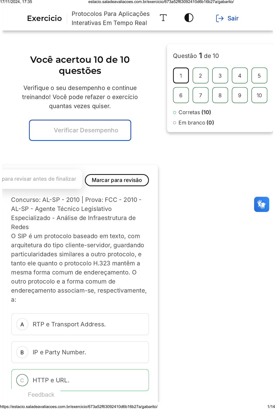 Você acertou 10 de 10 questões Verifique o seu desempenho e continue treinando! Você pode refazer o exercício quantas vezes quiser. Verificar Desempenho A B C 1 Marcar para revisãopara revisar antes de finalizar Concurso: AL�SP � 2010 | Prova: FCC � 2010 � AL�SP � Agente Técnico Legislativo Especializado - Análise de Infraestrutura de Redes O SIP é um protocolo baseado em texto, com arquitetura do tipo cliente-servidor, guardando particularidades similares a outro protocolo, e tanto ele quanto o protocolo H.323 mantêm a mesma forma comum de endereçamento. O outro protocolo e a forma comum de endereçamento associam-se, respectivamente, a: RTP e Transport Address. IP e Party Number. HTTP e URL. Questão 1 de 10 Corretas �10� Em branco �0� 1 2 3 4 5 6 7 8 9 10 Exercicio Protocolos Para Aplicações Interativas Em Tempo Real Sair Feedback 17/11/2024, 17:35 estacio.saladeavaliacoes.com.br/exercicio/673a52f63092410d6b16b27a/gabarito/ https://estacio.saladeavaliacoes.com.br/exercicio/673a52f63092410d6b16b27a/gabarito/ 1/14 D E HTTP e numeração E.164. ICMP e numeração E.164. Resposta correta Parabéns, você selecionou a alternativa correta. Confira o gabarito comentado! Gabarito Comentado O protocolo SIP �Session Initiation Protocol) é um protocolo baseado em texto, com arquitetura do tipo cliente-servidor, que guarda particularidades similares ao protocolo HTTP �Hypertext Transfer Protocol). Ambos os protocolos, SIP e H.323, utilizam a mesma forma comum de endereçamento, que é a URL �Uniform Resource Locator). Portanto, a alternativa correta é a letra C� HTTP e URL. 2 Marcar para revisão COPEVE UFMG � Engenheiro �UFMG�/Telecomunicações/2016 O protocolo RTP possui no cabeçalho o campo "SSRC identifier", com 32 bits, utilizado para identificar 17/11/2024, 17:35 estacio.saladeavaliacoes.com.br/exercicio/673a52f63092410d6b16b27a/gabarito/ https://estacio.saladeavaliacoes.com.br/exercicio/673a52f63092410d6b16b27a/gabarito/ 2/14 A B C D E As várias fontes geradoras multiplexadas. A ordem do pacote na sequência global. Unicamente a fonte geradora do pacote. Os receptores autorizados do pacote. A estampa de tempo do pacote. Resposta correta Parabéns, você selecionou a alternativa correta. Confira o gabarito comentado! Gabarito Comentado O campo "SSRC identifier" no cabeçalho do protocolo RTP, que possui 32 bits, é utilizado para identificar unicamente a fonte geradora do pacote. Isso significa que cada pacote transmitido tem um identificador único que aponta para a sua fonte original. Essa característica é fundamental para garantir a correta entrega e processamento dos pacotes em sistemas de telecomunicações. 3 Marcar para revisão 17/11/2024, 17:35 estacio.saladeavaliacoes.com.br/exercicio/673a52f63092410d6b16b27a/gabarito/ https://estacio.saladeavaliacoes.com.br/exercicio/673a52f63092410d6b16b27a/gabarito/ 3/14 A B C D E Ano: 2014 Banca: FAURGS Órgão: TJ�RS Prova: FAURGS � 2014 � TJ�RS � Técnico em Informática - Classe O Em uma arquitetura VoIP baseada em SIP, os telefones IP e softfones implantam, obrigatoriamente, a funcionalidade do servidor Registrar. Redirect Server. User Agent Server. Proxy Server. Security Server. Resposta correta Parabéns, você selecionou a alternativa correta. Confira o gabarito comentado! Gabarito Comentado A alternativa correta é a "User Agent Server". Na arquitetura VoIP baseada em SIP, os telefones IP e softfones precisam implementar a funcionalidade do servidor User Agent. Este servidor é responsável por iniciar pedidos SIP e responder a pedidos recebidos. Portanto, é uma parte essencial da comunicação VoIP. 17/11/2024, 17:35 estacio.saladeavaliacoes.com.br/exercicio/673a52f63092410d6b16b27a/gabarito/ https://estacio.saladeavaliacoes.com.br/exercicio/673a52f63092410d6b16b27a/gabarito/ 4/14 A B C D E 4 Marcar para revisão Concurso: AL�SP � 2010 | Prova: FCC � 2010 � AL�SP � Agente Técnico Legislativo Especializado - Análise de Infraestrutura de Redes Nos protocolos definidos pelo padrão H.323, o RTP �Real Time Transport Protocol) tem como função codificar e decodificar voz. determinar quais serão os protocolos de compactação utilizados em uma conferência. determinar quais as taxas máximas de transmissão suportadas. trocar dados entre os componentes do padrão. permitir a comunicação de voz entre as redes de computador e as redes de telefonia. Resposta correta Parabéns, você selecionou a alternativa correta. Confira o gabarito comentado! Gabarito Comentado O RTP �Real Time Transport Protocol) é um protocolo de internet padrão que permite a transmissão de áudio e vídeo em tempo real. No contexto dos protocolos definidos 17/11/2024, 17:35 estacio.saladeavaliacoes.com.br/exercicio/673a52f63092410d6b16b27a/gabarito/ https://estacio.saladeavaliacoes.com.br/exercicio/673a52f63092410d6b16b27a/gabarito/ 5/14 A B C D E pelo padrão H.323, o RTP tem como principal função a troca de dados entre os componentes do padrão. Portanto, a alternativa D é a correta, pois afirma que a função do RTP é "trocar dados entre os componentes do padrão". 5 Marcar para revisão Concurso: BNDES � 2007 | Prova: CESGRANRIO - 2008 � BNDES � Profissional Básico - Especialidade - Análise de Sistemas - Suporte O usuário A deseja estabelecer uma chamada com o usuário B utilizando o protocolo SIP �Session Initiation Protocol). Supondo que B esteja disponível para atender a ligação de A, a sequência de requisições e respostas na criação da chamada é A envia INVITE, B responde ACK, A envia ACK, B envia OK 200. A envia INVITE, B responde OK 200, A envia ACK. A envia INVITE, B responde OK 200. A envia CONNECT, B responde ACK. A envia CONNECT, B responde CONNECT�ACK, A envia ACK. Resposta correta 17/11/2024, 17:35 estacio.saladeavaliacoes.com.br/exercicio/673a52f63092410d6b16b27a/gabarito/ https://estacio.saladeavaliacoes.com.br/exercicio/673a52f63092410d6b1