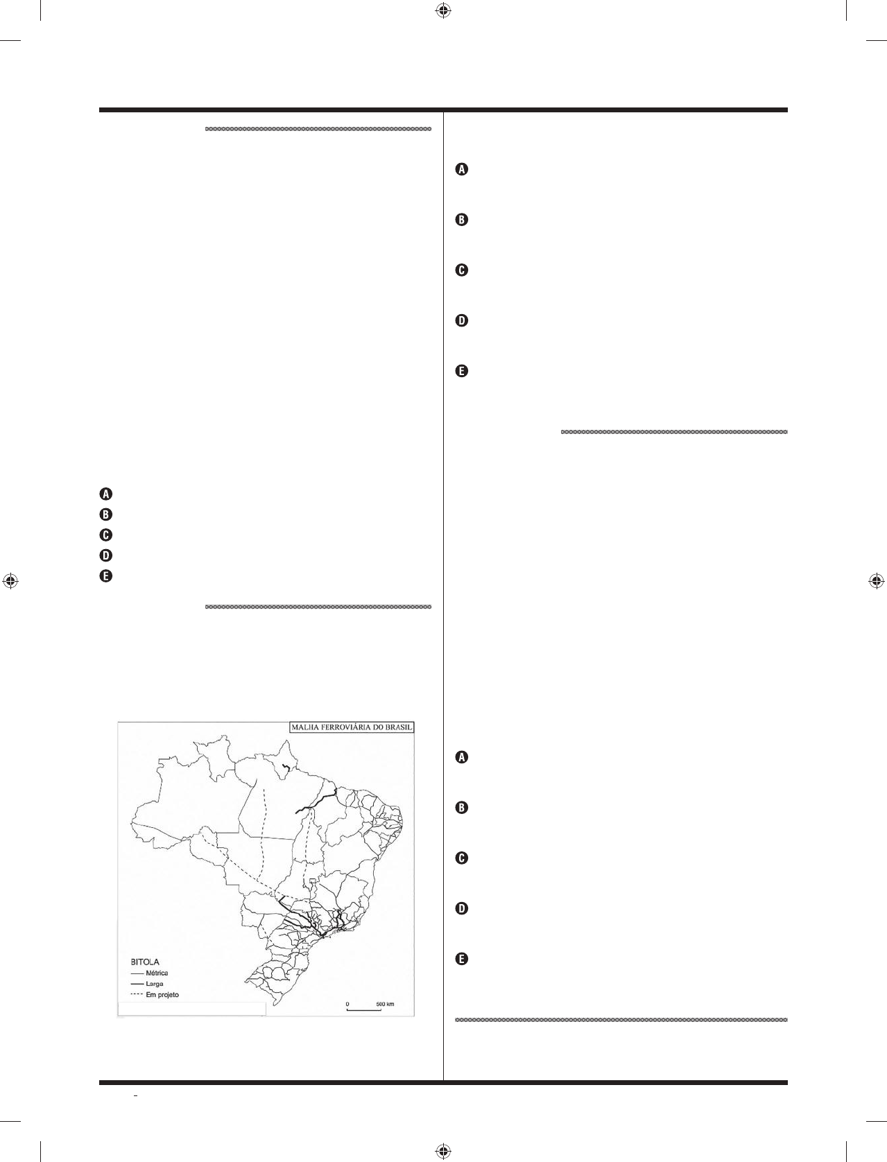 CH – 1o dia | Caderno 1 - Azul - Página 8 QUESTÃO 21 No dia seguinte, os poucos francos que escaparam ao massacre manquejaram até o acampamento de Carlos Magno, muitos feridos, todos sujos e cobertos de sangue, os olhos expressando, eloquentes, o horror que haviam visto e suportado. Muitos também se mostravam envergonhados porque sobreviveram, enquanto seus companheiros jaziam mortos. Mas, na realidade, não tinham motivo para a vergonha, pois haviam lutado para sobreviver ao combate, e não fugido. Quando Carlos Magno soube o que sucedera a Rolando e seus pares, a resplandecente nata da cavalaria franca, ele chorou. Allan Massie. Carlos Magno. A vida do imperador do Sacro Império Romano. O texto trata da Batalha de Roncesvales, episódio em que Rolando, sobrinho de Carlos Magno, morreu heroicamente. O episódio inspirou poemas intitulados “Canções de Gesta”; especialmente a “Canção de Rolando”, poema que foi, para os homens da Idade Média, o que a Ilíada tinha sido para os helenos. A derrota dos francos, em Roncesvales, deve ser relacionada com as campanhas militares de Carlos Magno contra os saxões. a heresia dos albigenses. os sarracenos na Espanha. os lombardos no norte da Itália. os bizantinos do Império Romano do Oriente. QUESTÃO 22 As estradas de ferro brasileiras nunca constituíram uma rede nacional. Mesmo durante seu tempo de (modesto) esplendor, resumiam-se a uma coleção de linhas de exportação de minerais e produtos agrícolas, que raramente tomavam a forma de uma rede regional, exceto, parcialmente, no Nordeste ou no estado de São Paulo. Hervé Théry e Neli Aparecida de Mello, Atlas do Brasil: disparidades e dinâmicas do território. São Paulo: EDUSP/Imprensa Oficial, 2005, p. 204 e 205 (adaptado). A malha ferroviária no Brasil nunca constituiu uma rede nacional porque possui uma malha com diferentes bitolas e interliga especialmente áreas do interior do país, visando a integração regional. apesar de apresentar grande integração das malhas, liga preferencialmente o interior aos portos, visando a exportação. possui uma malha com diferentes bitolas e interliga especialmente áreas do interior aos portos, visando a exportação. apesar de caracterizar-se por elevada integração das malhas, liga preferencialmente as regiões interiores do país. o incremento estatal na infraestrutura aérea possibilitou o escoamento significativo da exportação dos produtos agrícolas. QUESTÃO 23 Em um dos diálogos da peça intitulada Henrique VIII, de William Shakespeare, encenada em 1613, a rainha católica Catarina, primeira esposa do rei, desabafava: Mesmo aqui poderemos falar, pois, em consciência, até hoje nada fiz que não pudesse revelar francamente em qualquer parte. Prouvera ao céu que todas as mulheres pudessem declarar a mesma coisa com igual liberdade. Meus senhores, uma felicidade sempre tive: isso de não ligar nunca importância ao fato de meus gestos comentados serem por toda a gente, de ficarem sob a vista de todos, e como alvo dos ataques da inveja e da calúnia, tão certa me acho de ter vida limpa. Se vindes para examinar a minha conduta como esposa, sede francos. Sempre a verdade ama linguagem rude. Disponível em: www.ebooksbrasil.org. O monarca Henrique VIII governou a Inglaterra entre 1509 e 1547. Durante esse turbulento período, o catolicismo foi consolidado na Inglaterra, por ação direta do rei, que se manteve aliado a Roma contra os monarcas ibéricos. a liberdade de culto foi implementada, favorecendo a constituição de diversos grupos religiosos após a Reforma Protestante. o casamento civil, desvinculado da cerimônia religiosa, foi estabelecido como alternativa para os diversos matrimônios do rei. uma nova religião se formou, marcada por uma estrutura sacerdotal ligada diretamente ao Estado inglês e aos interesses do rei. medidas legais foram criadas para impedir as mulheres de participarem da linha sucessória na monarquia inglesa.