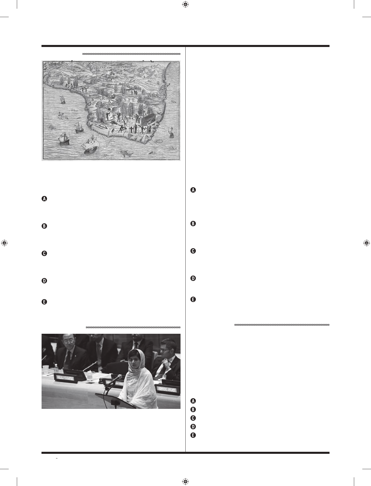 CH – 1o dia | Caderno 1 - Azul - Página 4 QUESTÃO 9 Acervo cedido pela Justiça Federal para a Universidade de São Paulo Esse mapa foi executado por Giacomo Gastaldi, em 1556 e editado na República de Veneza no ano de 1565. A partir da análise do mapa, percebe-se que havia um bom conhecimento da fauna e da flora brasileiras, o que pode ser observado nas figuras desenhadas e na localização e distribuição dos animais e das formações vegetais. não é certo representar indígenas e brancos em interação, trocando bens florestais na zona litorânea, pois esse tipo de relação ocorreu no interior, onde se situavam as florestas. a representação do relevo e da hidrografia nas terras interiores revelava as ações de exploração do terreno, que estava preparando a ocupação das terras pelo colonizador. os detalhes do litoral revelam um maior conhecimento dessa parte do território, enquanto o interior representado era mais fruto de imaginação do que de conhecimento. no limite do trecho conhecido (no poente), há um vulcão em atividade, atualmente inativo, porém bastante útil para a economia da população local. QUESTÃO 10 Disponível em: www.educacao.uol.com.br. A imagem retrata a jovem paquistanesa Malala Yousafzai em discurso na ONU, em julho de 2013, trajando o véu e o xale da ex-premiê do Paquistão Benazir Bhutto, assassinada em 2007 em um atentado político. Leia trechos do discurso de Malala: Queridos amigos, em 09 de outubro de 2012, o Talibã atirou no lado esquerdo da minha testa. Atiraram nos meus amigos também. Eles acharam que aquelas balas nos silenciariam. Mas falharam e, então, do silêncio vieram milhares de vozes. (...) O sábio ditado que diz A caneta é mais poderosa que a espada é verdadeiro. Os extremistas têm medo dos livros e das canetas. O poder da educação os assusta e eles têm medo das mulheres. (...) É por isto que eles mataram 14 estudantes inocentes no recente ataque em Quetta. E é por isto que eles matam professoras. É por isto que eles atacam escolas todos os dias: porque tiveram e têm medo da mudança, da igualdade que vamos trazer para a nossa sociedade. (...) Deixem-nos pegar nossos livros e canetas porque estas são as nossas armas mais poderosas. Uma criança, um professor, um livro e uma caneta podem mudar o mundo. Disponível em: www.ikmr.org.br. Com base no texto, o apelo lançado por Malala simboliza a luta das meninas para frequentarem a escola em países com restrições religiosas, culturais e políticas à instrução feminina, como no caso do Paquistão, sob domínio Talibã, e da Índia, submetida à lei oficial da Sharia. advoga o princípio da educação como arma contra a discriminação muçulmana das minorias étnico-religiosas curda e pachtun e como meio para pacificar a guerra civil em seu país. apoia a formação militar feminina, inspirando-se no programa de Benazir Bhutto, a primeira mulher a ocupar um cargo de chefe de governo de um Estado muçulmano moderno. defende a educação como um dos direitos humanos básicos e como um meio para a libertação dos indivíduos de regimes e crenças excludentes e discriminatórios. sustenta o protagonismo feminino de todas as mulheres e condena todas as religiões, em nome da adoção de um sistema de educação laico e igualitário no Paquistão. QUESTÃO 11 A vegetação varia de local para local baseada, sobretudo, nas características climáticas e de relevo, que acabam por influenciar outros fatores naturais, como a rede hidrográfica e a distribuição dos solos, criando os denominados “biomas”. Nesse sentido, no norte da Europa, Ásia e América do Norte predomina uma vegetação rasteira, de crescimento lento e adaptada ao clima frio e de altas montanhas, que se desenvolve sobre o solo congelado, denominado permafrost. O bioma ao qual essa passagem se refere é denominado de Estepe. Taiga. Floresta Boreal. Floresta Tropical. Tundra.