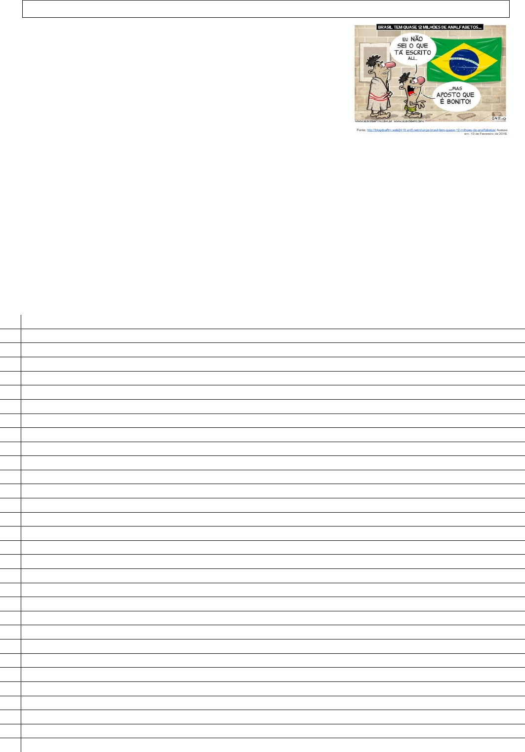 PRODUÇÃO DE TEXTO Brasil ainda tem 11,8 milhões de analfabetos, segundo IBGE (2017) O Brasil ainda tem cerca de 11,8 milhões de analfabetos, o que corresponde a 7,2% da população de 15 anos ou mais. Os dados, divulgados nesta quinta-feira pelo Instituto Brasileiro de Geografia e Estatística (IBGE), fazem parte da Pesquisa Nacional por Amostra de Domicílios Contínua (Pnad Contínua) e se referem ao ano de 2016. A taxa indica que o Brasil não conseguiu alcançar uma das metas intermediárias estabelecidas pelo Plano Nacional de Educação (PNE) em relação à alfabetização da população com 15 anos ou mais. A meta 9 do PNE determinava a redução do analfabetismo a 6,5% até 2015, o que não aconteceu. A Lei diz ainda que em 2024 o analfabetismo deve estar erradicado do país. [...] - Há uma questão estrutural do analfabetismo. Ele está muito mais presente entre a população idosa. O que vemos é algo histórico, mais concentrado em uma população mais velha. Vamos diminuir o analfabetismo è medida que essa população mais velha for morrendo, porque atualmente há mais crianças na escola. Basta olhar os percentuais por faixa etária para comparar isso - avalia a pesquisadora do IBGE, Marina Águas. Redija texto dissertativo argumentativo sobre o tema “Caminhos para combater o analfabetismo no Brasil”. 1. 2. 3. 4. 5. 6. 7. 8. 9. 10. 11. 12. 13. 14. 15. 16. 17. 18. 19. 20. 21. 22. 23. 24. 25. 26. 27. 28. 29. 30.