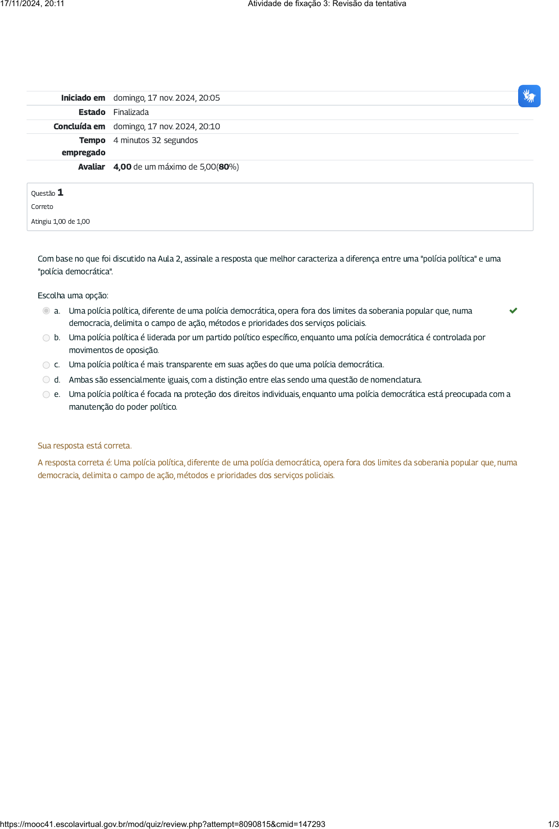 Iniciado em domingo, 17 nov. 2024, 20:05 Estado Finalizada Concluída em domingo, 17 nov. 2024, 20:10 Tempo empregado 4 minutos 32 segundos Avaliar 4,00 de um máximo de 5,00(80%) Questão 1 Correto Atingiu 1,00 de 1,00 Com base no que foi discutido na Aula 2, assinale a resposta que melhor caracteriza a diferença entre uma "polícia política" e uma "polícia democrática". Escolha uma opção: a. Uma polícia política, diferente de uma polícia democrática, opera fora dos limites da soberania popular que, numa democracia, delimita o campo de ação, métodos e prioridades dos serviços policiais. b. Uma polícia política é liderada por um partido político especí�co, enquanto uma polícia democrática é controlada por movimentos de oposição. c. Uma polícia política é mais transparente em suas ações do que uma polícia democrática. d. Ambas são essencialmente iguais, com a distinção entre elas sendo uma questão de nomenclatura. e. Uma polícia política é focada na proteção dos direitos individuais, enquanto uma polícia democrática está preocupada com a manutenção do poder político. Sua resposta está correta. A resposta correta é: Uma polícia política, diferente de uma polícia democrática, opera fora dos limites da soberania popular que, numa democracia, delimita o campo de ação, métodos e prioridades dos serviços policiais. 17/11/2024, 20:11 Atividade de fixação 3: Revisão da tentativa https://mooc41.escolavirtual.gov.br/mod/quiz/review.php?attempt=8090815&cmid=147293 1/3 Questão 2 Correto Atingiu 1,00 de 1,00 Questão 3 Correto Atingiu 1,00 de 1,00 A pesquisa de Stephen Rushin, “Police Union Contracts” (2017), que analisou um total de 178 contratos �rmados entre sindicatos policiais e governos de cidades por todos os Estados Unidos, identi�cou alguns perigos importantes nos processos de acordos coletivos entre a polícia e diversos governos no país. Com base no que foi discutido na Aula 4, assinale as respostas que melhor caracterizam os resultados da pesquisa. I - A grande maioria das cidades norte-americanas analisadas tinha �rmado contratos que concediam proteções processuais que di�cultavam a responsabilização de policiais acusados de desvios de conduta. II - A pesquisa mostrou a responsabilidade dos governos na supervisão, não apenas de aspectos técnicos do trabalho da polícia, mas principalmente políticos, no sentido de de�nir e defender os meios aceitáveis para se obter resultados em uma democracia. III - Os resultados con�rmaram a percepção dos pesquisadores de que os contratos coletivos assinados pelos sindicatos não representam um perigo para a democracia. Escolha uma opção: a. As opções I e III são verdadeiras. b. Todas as opções são verdadeiras. c. As opções I e II são verdadeiras. d. As opções II e III são verdadeiras. e. Nenhuma das opções é verdadeira. Sua resposta está correta. A resposta correta é: As opções I e II são verdadeiras. Segundo a discussão de “core policing” de Bayley e Perito (2017), mesmo em contextos altamente militarizados - como os “contextos pós-con�ito” - a polícia deve buscar reencontrar as suas funções civis essenciais de prevenção do crime, investigação e garantia da ordem pública. Entretanto, não basta treinar a polícia para promover esse “reencontro”. Assinale a resposta que melhor caracteriza as medidas sugeridas pelos autores para que isso aconteça. I - Faz-se necessário um esforço simultâneo de reformulação e fortalecimento das estruturas de governança do sistema de justiça e segurança de forma ampla, uma vez que a ausência de um sistema judiciário e penitenciário funcional podem comprometer o processo de restauro da ordem pública e de estabilização no longo prazo em razão da proliferação de formas de justiça sumária. II - Sem segurança não há Governo e sem Governo não há política de segurança pública. Em contextos pós-con�ito, o dilema da construção da paz seria, portanto, o de fazer com que estas duas coisas caminhem juntas, o provimento de segurança e o desenvolvimento de um governo civil e�caz. III - O trabalho policial é essencial para promover a adesão e respeito às leis. Entretanto, não é qualquer forma de desenvolver o policiamento que tem o potencial de reparar a ordem social e reabilitar a autoridade do Estado. As características do policiamento que realiza esse potencial, segundo Baylay e Perito (2017), são a disponibilidade a pronta resposta e a imparcialidade. Escolha uma opção: a. Todas as opções são verdadeiras. b. Nenhuma das opções é verdadeira. c. As opções I e II são verdadeiras. d. As opções I e III são verdadeiras. e. As opções II e III são verdadeiras. Sua resposta está correta. A resposta correta é: Todas as opções são verdadeiras. 17/11/2024, 20:11 Atividade de fixação 3: Revisão da tentativa https://mooc41.escolavirtual.gov.br/mod/quiz/review.php?attempt=8090815&cmid=147293 2/3 Questão 4 Correto Atingiu 1,00 de 1,00 Questão 5 Incorreto Atingiu 0,00 de 1,00 Com base no que foi discutido na Aula 2, assinale a resposta que melhor caracteriza as dimensões políticas do trabalho da polícia. Escolha uma opção: a. A ação da polícia interfere diretamente na política por meio da participação dos policiais em conselhos e outros espaços de participação social. b. A polícia impacta a distribuição de poder na sociedade por meio de sua ação ao contribuir para garantir ou limitar o acesso de determinados grupos a direitos e recursos e na mediação e negociação da ordem social. c. A ação policial não tem impacto na distribuição de poder, pois as forças policiais não estão envolvidas em questões políticas. d. A polícia se concentra na aplicação da lei em casos de corrupção política e à proteção de políticos e líderes do governo. e. A ação policial geralmente promove a redistribuição equitativa de pod