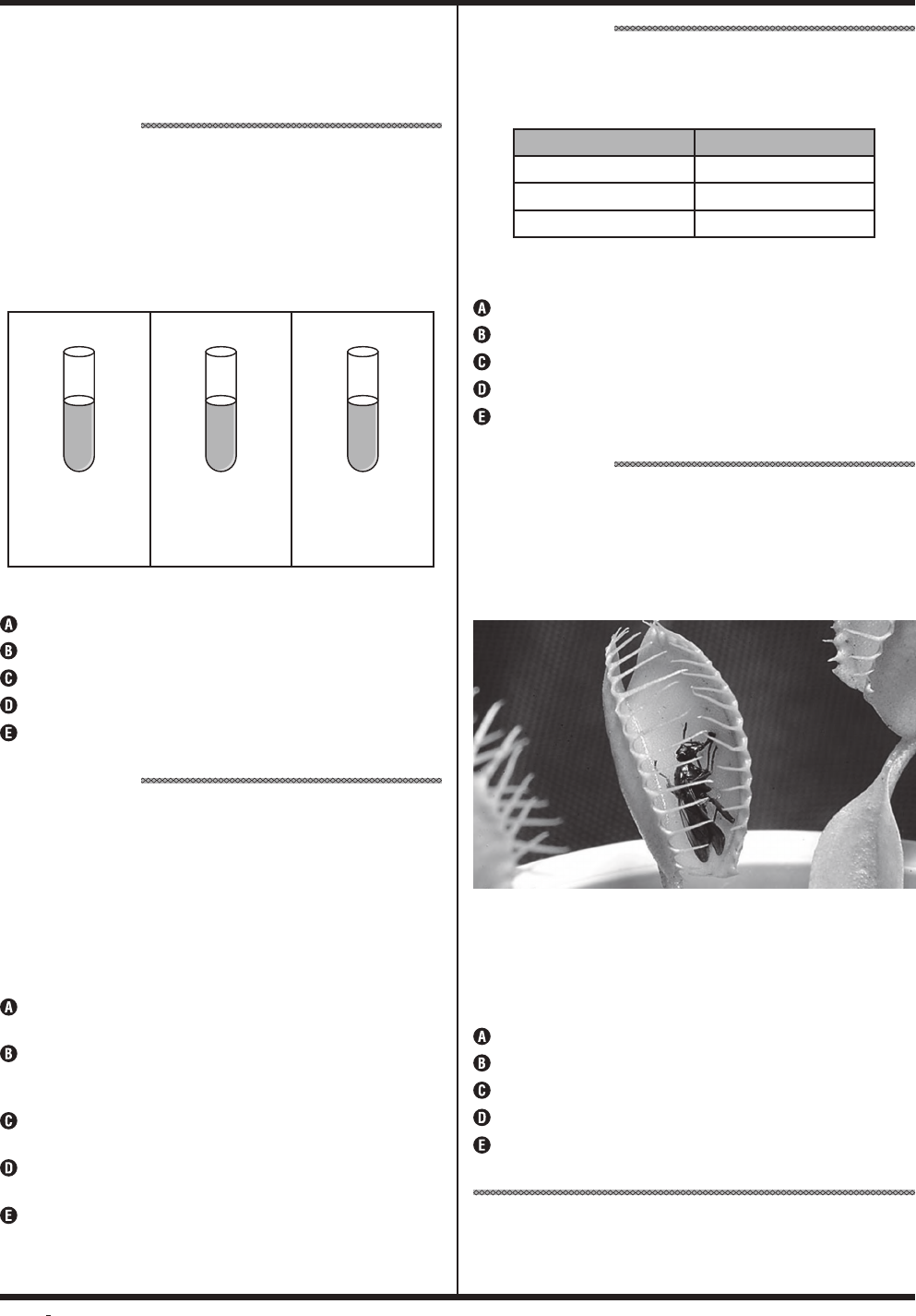 CN – 2o dia | Caderno 1 - Cinza - Página 14 CIÊNCIAS DA NATUREZA E SUAS TECNOLOGIAS Questões de 46 a 90 QUESTÃO 46 Considere que a substância A inibe a formação da enzima RNA polimerase e a substância B inibe o funcionamento correto dos ribossomos. Uma cultura de bactérias da espécie Escherichia coli foi colocada em três tubos de ensaio, enumerados como I, II e III. As substâncias A e B foram aplicadas nos tubos I e II, respectivamente. Não foi aplicada nenhuma substância no tubo III, que serviu de controle. I II III substância A + cultura de bactérias substância B + cultura de bactérias cultura de bactérias Após dois dias de experimento, seria possível detectar a presença de peptídios novos no tubo I. a presença de proteínas novas no tubo II. a ausência de peptídios novos no tubo III. a presença de fi tas de RNAm novos no tubo II. a presença de fi tas de RNAm novos nos tubos I e II. QUESTÃO 47 Radares são emissores e receptores de ondas de rádio e têm aplicações, por exemplo, na determinação de velocidades de veículos nas ruas e rodovias. Já os sonares são emissores e receptores de ondas sonoras, sendo utilizados no meio aquático para determinação da profundidade dos oceanos, localização de cardumes, entre outras aplicações. Comparando-se as ondas emitidas pelos radares e pelos sonares, infere-se que as ondas emitidas pelos radares são mecânicas e as ondas emitidas pelos sonares são eletromagnéticas. ambas as ondas exigem um meio material para se propagarem e, quanto mais denso for esse meio, menores serão suas velocidades de propagação. as ondas de rádio têm oscilações longitudinais e as ondas sonoras têm oscilações transversais. as frequências de oscilação de ambas as ondas não dependem do meio em que se propagam. a velocidade de propagação das ondas dos radares pela atmosfera é menor do que a velocidade de propagação das ondas dos sonares pela água. QUESTÃO 48 Um estudante recebeu uma tabela, reproduzida a seguir, em que constam os pontos de ebulição de três compostos diferentes, a 1 atm. Composto PE (°C) X –135 Y 37 Z 118 Segundo os dados anteriores, os possíveis compostos X, Y e Z são, respectivamente, butan-1-ol, butano e éter etílico. éter etílico, butan-1-ol e butano. butano, éter etílico e butan-1-ol. butano, butan-1-ol e éter etílico. butan-1-ol, éter etílico e butano. QUESTÃO 49 As plantas “carnívoras”, por habitarem solos pobres em minerais, desenvolveram a característica de digerir pequenos animais para complementar a absorção de nutrientes, especialmente os compostos nitrogenados. Ao absorverem a energia luminosa, elas conseguem elaborar as moléculas orgânicas fundamentais para a sua sobrevivência. Disponível em: www.mundodastribos.com. Acesso em: 25 nov. 2015. A imagem em questão apresenta uma planta carnívora capturando formigas herbívoras. Em uma cadeia alimentar, os níveis trófi cos ocupados pela planta “carnívora” na obtenção de seus nutrientes energéticos são os de produtor e consumidor primário. produtor e consumidor secundário. consumidor primário e consumidor secundário. consumidor primário e decompositor. consumidor secundário e decompositor.