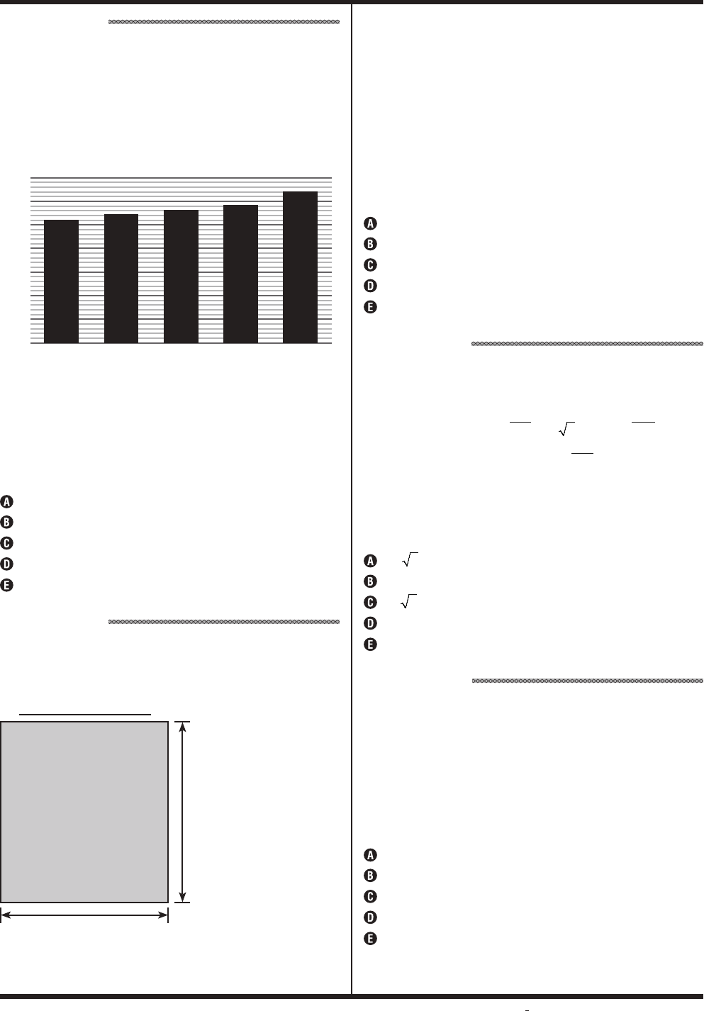 MT – 2o dia | Caderno 1 - Cinza - Página 5 QUESTÃO 09 Considerando as informações do gráfico abaixo, de 2010 a 2014 o número de turistas que chegaram ao Brasil cresceu ano após ano. Por exemplo, em 2010 chegaram 5,2 milhões de turistas e, em 2011, 5,4 milhões. Portanto, houve aumento de 200 mil chegadas de turistas ao país. Chegada de turistas ao Brasil Ano Tu ris ta s (m ilh õe s de c he ga da s) 7 6 5 4 3 2 1 0 20142012 201320112010 Ministério do Turismo. Estatística básica do turismo. Disponível em: www.turismo.gov.br. Acesso em: 6 set. 2016. O aumento percentual de turistas que chegaram ao Brasil em 2014, comparado com o ano anterior, foi de aproximadamente 9,1%. 10,3%. 12,5%. 13,2%. 15%. QUESTÃO 10 Dispondo de um grande terreno, uma empresa de entretenimento pretende construir um espaço retangular para shows e eventos, conforme a figura: Palco Área para público y (metro) x (metro) A área para o público será cercada com dois tipos de materiais: – nos lados paralelos ao palco, será usada uma tela do tipo A, mais resistente, cujo valor do metro linear é R$20,00; – nos outros dois lados, será usada uma tela do tipo B, comum, cujo metro linear custa R$5,00. A empresa dispõe de R$5.000,00 para comprar todas as telas, mas quer fazer de tal maneira que obtenha a maior área possível para o público. A quantidade de cada tipo de tela que a empresa deve comprar é 50,0 m da tela tipo A e 800,0 m da tela tipo B. 62,5 m da tela tipo A e 250,0 m da tela tipo B. 100,0 m da tela tipo A e 600,0 m da tela tipo B. 125,0 m da tela tipo A e 500,0 m da tela tipo B. 200,0 m da tela tipo A e 200,0 m da tela tipo B. QUESTÃO 11 No famoso jogo para celular Pokémon Go, três pokémons, P1, P2 e P3, estão posicionados, respectivamente, nos vértices de um triângulo retângulo em P1. Sabe-se que a distância =1 2 12 3 mPP e que 2 3P P mede o dobro desta. Nesse momento do jogo, o treinador T está posicionado em um ponto do lado 1 3,PP de forma que ele equidista de P2 e P3. Considerando que o pokémon P3 permanecerá imóvel, a menor distância que o treinador deverá percorrer para alcançá-lo será igual a 24 3 m. 24 m. 12 3 m. 12 m. 15 m. QUESTÃO 12 Um nadador vai disputar duas provas nas Olimpíadas. Primeiro, os 100 metros borboleta e, depois, os 100 metros nado livre. A probabilidade de ele vencer a prova dos 100 metros borboleta é de 70%, ao passo que a de vencer ambas é de 60%. Se o nadador vencer a prova dos 100 metros borboleta, a probabilidade de ele vencer a prova dos 100 metros nado livre é de aproximadamente 0,42. 0,50. 0,60. 0,70. 0,86.