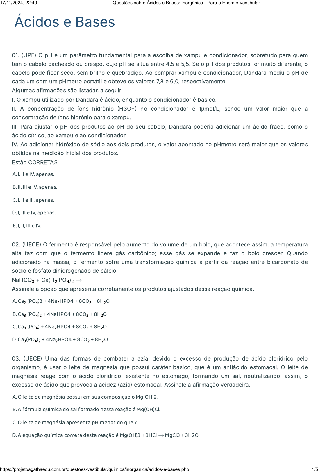 Ácidos e Bases 01. �UPE� O pH é um parâmetro fundamental para a escolha de xampu e condicionador, sobretudo para quem tem o cabelo cacheado ou crespo, cujo pH se situa entre 4,5 e 5,5. Se o pH dos produtos for muito diferente, o cabelo pode ficar seco, sem brilho e quebradiço. Ao comprar xampu e condicionador, Dandara mediu o pH de cada um com um pHmetro portátil e obteve os valores 7,8 e 6,0, respectivamente. Algumas afirmações são listadas a seguir: I. O xampu utilizado por Dandara é ácido, enquanto o condicionador é básico. II. A concentração de íons hidrônio �H3O�� no condicionador é 1μmol/L, sendo um valor maior que a concentração de íons hidrônio para o xampu. III. Para ajustar o pH dos produtos ao pH do seu cabelo, Dandara poderia adicionar um ácido fraco, como o ácido cítrico, ao xampu e ao condicionador. IV. Ao adicionar hidróxido de sódio aos dois produtos, o valor apontado no pHmetro será maior que os valores obtidos na medição inicial dos produtos. Estão CORRETAS A. I, II e IV, apenas. B. II, III e IV, apenas. C. I, II e III, apenas. D. I, III e IV, apenas. E. I, II, III e IV. 02. �UECE� O fermento é responsável pelo aumento do volume de um bolo, que acontece assim: a temperatura alta faz com que o fermento libere gás carbônico; esse gás se expande e faz o bolo crescer. Quando adicionado na massa, o fermento sofre uma transformação química a partir da reação entre bicarbonato de sódio e fosfato dihidrogenado de cálcio: NaHCO + Ca(H PO ) ⟶ Assinale a opção que apresenta corretamente os produtos ajustados dessa reação química. A. Ca (PO )3 + 4Na HPO4 + 8CO + 8H O B. Ca (PO ) + 4NaHPO4 + 8CO + 8H O C. Ca (PO ) + 4Na HPO4 + 8CO + 8H O D. Ca (PO ) + 4Na HPO4 + 8CO + 8H O 03. �UECE� Uma das formas de combater a azia, devido o excesso de produção de ácido clorídrico pelo organismo, é usar o leite de magnésia que possui caráter básico, que é um antiácido estomacal. O leite de magnésia reage com o ácido clorídrico, existente no estômago, formando um sal, neutralizando, assim, o excesso de ácido que provoca a acidez (azia) estomacal. Assinale a afirmação verdadeira. A. O leite de magnésia possui em sua composição o Mg(OH)2. B. A fórmula química do sal formado nesta reação é Mg(OH)Cl. C. O leite de magnésia apresenta pH menor do que 7. D. A equação química correta desta reação é Mg(OH)3 + 3HCl → MgCl3 + 3H2O. 3 2 4 2 2 4 2 2 2 3 4 2 2 2 3 4 2 2 2 3 4 2 2 2 2 17/11/2024, 22:49 Questões sobre Ácidos e Bases: Inorgânica - Para o Enem e Vestibular https://projetoagathaedu.com.br/questoes-vestibular/quimica/inorganica/acidos-e-bases.php 1/5 04. �URCA� Ao se fazer contato de água destilada com pedaços de sódio metálico e adição de gotas de solução de fenolftaleína em um tubo de ensaio, observase uma reação violenta do sódio com a água, resultando numa chama nasuperfície exposta do metal e coloração rósea na solução. A chama e a coloração resultam, respectivamente: A. Da queima de gás oxigênio produzido na reação e aumento de pH do meio. B. Da queima de gás nitrogênio produzido na reação e aumento de pH do meio. C. Da queima de gás hidrogênio produzido na reação e aumento de pH do meio. D. Da queima de gás oxigênio produzido na reação e diminuição de pH do meio. E. Da queima de gás hidrogênio produzido na reação e diminuição de pH do meio. 05. �UEMG� Os reveladores fotográficos apresentam outros constituintes. Cada um tem, evidentemente, um papel importante no comportamento do revelador, na medida em que criam as condições ambientais adequadas para que possam atuar. Destacam-se, pela sua importância, os alcalinizantes, uma vez que o pH é determinante no vigor da revelação. Quando conduzida em meio mais alcalino, a revelação é mais enérgica e os contrastes são favorecidos. Todas as substâncias abaixo poderiam, em tese, ser utilizadas como alcalinizantes, EXCETO� A. Carbonato de sódio. B. Hidróxido de potássio. C. Hidróxido de sódio. D. Ácido acético. 06. �UEFS� O ácido sulfúrico, H2SO4(aq), o óxido de cálcio, CaO(s), o etileno, C2H4(g) e o cloro, Cl2(g), estão entre as substâncias mais produzidas pela indústria química porque são intermediários para a produção de fertilizantes, detergentes, plásticos e desinfetantes. Considerando-se as informações, a estrutura e as propriedades dessas substâncias químicas, é correto afirmar: A. O óxido de cálcio é um composto molecular solúvel em água. B. A produção do etileno envolve hidrogenação catalítica do etano, um derivado do petróleo. C. O hidrocarboneto de fórmula C2H4 tem cadeia carbônica saturada e é constituído por moléculas polares. D. O ácido sulfúrico é um ácido diprótico utilizado na produção do sulfato de amônio, (NH4)2SO4(s). E. A ação bactericida do cloro, quando dissolvido em água, está associada ao ácido clorídrico produzido na reação entre o gás e a água. 07. �UEMG� Em relação às propriedades de ácidos e bases e às possíveis reações entre eles, assinale a alternativa correta. A. O hidróxido de alumínio, Al(OH)3, é uma base fraca, porém muito solúvel em água. B. A reação entre o ácido fosfórico e o hidróxido de cálcio forma o sal fosfato de cálcio, de fórmula Ca2(PO4)3. C. O hidróxido férrico possui a fórmula molecular Fe(OH)2. D. A reação entre hidróxido de potássio com hidróxido de sódio e ácido sulfúrico forma o sulfato duplo de potássio e sódio (KNaSO4) 08. �ITA� Os óxidos de metais de transição podem ter caráter ácido, básico ou anfótero. Assinale a opção que apresenta o caráter dos seguintes óxidos: CrO, Cr2O3 e CrO3. 17/11/2024, 22:49 Questões sobre Ácidos e Bases: Inorgânica - Para o Enem e Vestibular https://projetoagathaedu.com.br/questoes-vestibular/quimica/inorganica/acidos-e-bases.php 2/5 A. Ácido, anfótero, básico B. Ácido, básico, an
