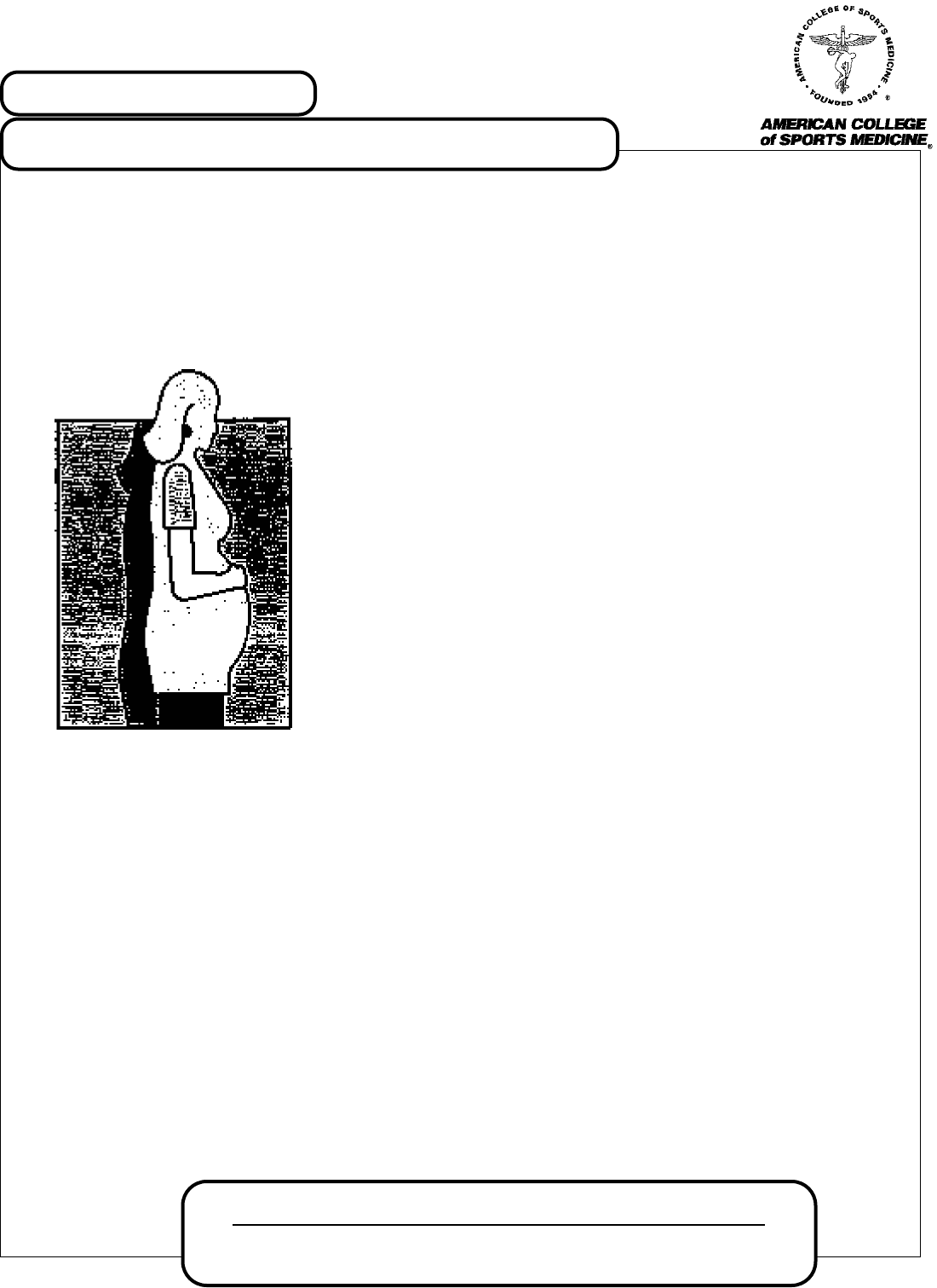 currentcomment Street Address: 401 W. Michigan St. • Indianapolis, IN 46202-3233 USA Mailing Address: P.O. Box 1440 • Indianapolis, IN 46206-1440 USA Telephone: (317) 637-9200 • FAX: (317) 634-7817 Current Comments are official statements by the American College of Sports Medicine concerning topics of interest to the public at large. AUGUST 2000 EXERCISE DURING PREGNANCY from the Exercise and physical fitness have dramatically gained in popularity over the past several years, and have assumed important roles in the lives of many women. Physical activity and reproduction are normal parts of life, and for normal healthy women, combining regular exercise and pregnancy appears to benefit both mother and baby in many ways. Thus, a healthy woman with a normal pregnancy may either continue her regular exercise regimen, or begin a new exercise program. The American College of Obstetrics and Gynecology (ACOG), as well as the American Society for Obstetrics and Gynecology (ASOG), recommends that normally healthy pregnant women may continue an already-established exercise regimen. Pregnancy is a normal physiological state characterized by growth of both mother and fetus. From conception onward, the fetus develops into a baby, and the mother experiences both physical and psychological growth. All mothers want the best possible health for themselves and their babies, but some women and physicians are concerned that regular maternal physical activity during pregnancy may cause miscarriage, premature delivery, poor fetal growth, or musculoskeletal injury. For normal pregnan- cies, these concerns have not been substantiated. Indeed, participation in regular weight-bearing exercise has been shown to improve maternal fitness, restrict weight gain without compromising fetal growth, and hasten postpartum recovery. In addition, the psychological benefits of exercise are undeniable, and should be nurtured by all who care for pregnant women. During the first trimester, major physiological changes are taking place, even though maternal body changes are few. During low-level exercise, blood pressure and pulse responses are not dramatically different from those in the non-pregnant woman, but fatigue may be noticed earlier during exercise. As early pregnancy progresses, blood volume expands and the uterus continues to enlarge. Weight gain is usually small but can range from zero to ten pounds. During this time, the fetus is undergoing its most important growth, including development of organs and limbs. For this reason, a proper balance of nutrition, hydration, exercise and rest assume great importance. It is important for the pregnant woman to avoid large increases in her body temperature during exercise. Fortunately, adequate hydration, regular exercise, and pregnancy all improve a woman’s capacity to dissipate heat. The individual effects of these on heat dissipation appear to complement one another when combined. Thus, well hydrated, fit pregnant women regulate their core body temperatures more efficiently than sedentary people, and undergo less temperature variation during exercise. Loose fitting clothing and a cool environment are also important in protecting against heat stress. Other environmental conditions to consider are very high and very low air pressure. Exposure to the decreased oxygen of high altitudes, as well as the high pressures experienced during deep sea diving, should be avoided during pregnancy. PREGNANCY currentcomment Page 2 Current Comments are official statements by the American College of Sports Medicine concerning topics of interest to the public at large. from the The second and third trimesters are accompanied by dramatic changes in a woman’s body. Normal weight gain ranges between 22 and 35 pounds and is centered around the abdomen and pelvis, which alters both posture and the center of gravity. During this time, exercises requiring balance and agility may become more difficult due to the change in the pregnant woman’s weight distribution. The use of properly adjusted exercise equipment, a smooth floor surface, and/or aquatic exercises are extremely helpful. The extra caloric demands of pregnancy are extremely variable; no fixed equation accurately estimates the amount of increased caloric need. The best measure of sufficient caloric intake is adequate weight gain. Small, frequent meals and regular fluid intake throughout the day are most desirable in maintaining a steady flow of nutrients while minimizing the discomfort of exercising on a full stomach, and avoiding dehydration and low blood sugar. Pregnant, sedentary women commonly require approximately 3000 calories per day during the second and third trimesters to ensure adequate stores of nutrients. A physically active expectant mother would therefore have a higher caloric need, in order to compensate for calories burned off during strenuous exercise. For pregnant women who wish to exercise during pregnancy, the American College of Sports Medicine provides the following recommendations: * Safety: As changes in weight distribution occur, balance and coordination may be affected. Exercise programs should be modified if they pose a significant risk of abdominal injury or fatigue as opposed to relaxation and an enhanced sense of well being. Until more information is available, exercising in the supine or prone positions should be avoided after the first trimester. * Environment: Temperature regulation is highly dependent on hydration and environmental conditions. Exercising pregnant women should ensure adequate fluid intake before, during and after exercise, wear loose-fitting clothing, and avoid high heat and humidity to protect against heat stress, especially during the first trimester. * Growth and Development: The pregnant woman should monitor her level of exercise and adjust her dietary intake to ensure proper weight gain. If pregnancy is not progressing normally or if vaginal bleeding, membrane rupture, persistent