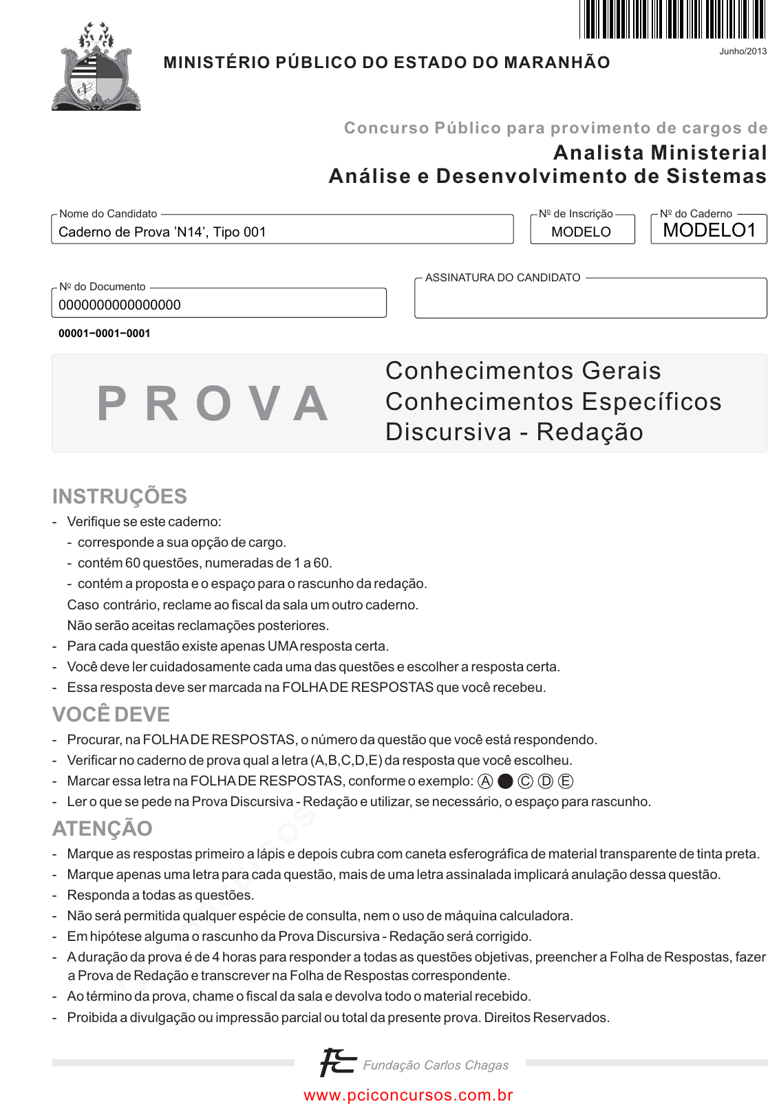 Caderno de Prova ’N14’, Tipo 001 MODELO