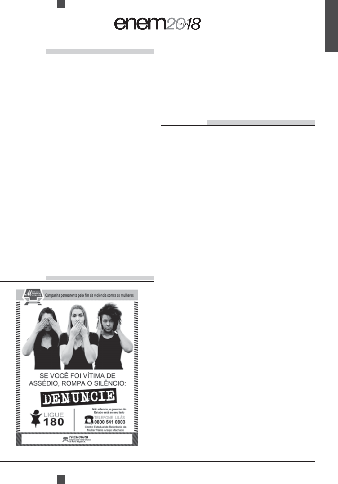 QUESTÃO 40 ABL lança novo concurso cultural: “Conte o conto sem aumentar um ponto” Em razão da grande repercussão do concurso de Microcontos do Twitter da ABL, o Abletras, a Academia Brasileira de Letras lançou no dia do seu aniversário de 113 anos um novo concurso cultural intitulado “Conte o conto sem aumentar um ponto”, baseado na obra A cartomante, de Machado de Assis. “Conte o conto sem aumentar um ponto” tem A cartomante mesmo número de caracteres – ou inferior – que Machado Vale ressaltar que, para participar do concurso, o concorrente deverá ser seguidor do Twitter da ABL, o Abletras. O Twitter é reconhecido por promover o compartilhamento de textos. Nessa notícia, essa rede social foi utilizada causa do(a) A limite predeterminado de extensão do texto. B interesse pela participação de jovens. C atualidade do enredo proposto. D E dinâmica da sequência narrativa. QUESTÃO 41 onvencer o leitor a mudar seu comportamento por meio da associação de verbos no modo imperativo à A indicação de diversos canais de atendimento. B divulgação do Centro de Defesa da Mulher. C informação sobre a duração da campanha. D apresentação dos diversos apoiadores. E utilização da imagem das três mulheres. QUESTÃO 42 A Casa de Vidro Houve protestos. Deram uma bola a cada criança e tempo para brincar. Elas aprenderam malabarismos incríveis e algumas viajavam pelo mundo exibindo sua alegre habilidade. (O problema é que muitos, a maioria, não tinham jeito e eram feios de noite, assustadores. Seria melhor prender essa gente – havia quem dissesse.) Houve protestos. Aumentaram o preço da carne, liberaram os preços dos cereais e abriram crédito a juros baixos para o agricultor. O dinheiro que sobrasse, bem, digamos, ora o dinheiro que sobrasse! Houve protestos. Diminuíram os salários (infelizmente aumentou o número de assaltos) porque precisamos combater a do índice de produtividade eles se tornam altamente Houve protestos. Proibiram os protestos. E no lugar dos protestos nasceu o ódio. Então surgiu a Casa de Vidro, para acabar com aquele ódio. ÂNGELO, I. A casa de vidro da literatura brasileira escritas no período as marcas do contexto em que foi produzido, como a A referência à censura e à opressão para alegorizar a falta de liberdade de expressão característica da época. B valorização de situações do cotidiano para atenuar os sentimentos de revolta em relação ao governo instituído. C utilização de metáforas e ironias para expressar um olhar crítico em relação à situação social e política do país. D tendência realista para documentar com verossimilhança o drama da população brasileira durante o Regime Militar. E sobreposição das manifestações populares pelo momento histórico. *SA0175AZ17* QUESTÃO 43 Encontrando base em argumentos supostamente para controlar as práticas corporais desempenhadas pelas mulheres. Na história do Brasil, exatamente os esforços para impedir a participação da mulher no relação à presença da mulher no esporte estiveram culturalmente associadas ao medo de masculinizar o corpo feminino pelo esforço físico intenso. Em relação ao futebol feminino, o mito do sexo frágil atuou como obstáculo ao consolidar a crença de que o esforço físico seria inapropriado para proteger a feminilidade da mulher “normal”. Tal mito sustentou um forte movimento contrário à aceitação do futebol como prática esportiva feminina. Leis e propagandas buscaram desacreditar Na verdade, as mulheres eram consideradas incapazes TEIXEIRA, F. L. S.; CAMINHA, I. O. Preconceito no futebol feminino: uma revisão sistemática. Movimento No contexto apresentado, a relação entre a prática do futebol e as mulheres é caracterizada por um A históricas e sociais. B discurso midiático que atua historicamente na desconstrução do mito do sexo frágil. C apelo para a preservação do futebol como uma modalidade praticada apenas pelos homens. D atividade masculinizante para as mulheres. E demonstrarem suas capacidades de jogo. QUESTÃO 44 Farejador de Plágio: uma ferramenta contra a cópia ilegal No mundo acadêmico ou nos veículos de comunicação, as cópias ilegais podem surgir de diversas maneiras, sendo integrais, parciais ou paráfrases. Para ajudar a combater esse crime, o professor Maximiliano desenvolveu junto com os seus alunos o programa Farejador de Plágio. O programa é capaz de detectar: trechos contínuos e fragmentados, frases soltas, partes de textos reorganizadas, frases reescritas, mudanças na ordem dos períodos e erros fonéticos e sintáticos. Mas como o programa realmente funciona? Considerando o texto como uma sequência de palavras, a ferramenta analisa e busca trecho por trecho nos sites aluno faria. A diferença é que o programa permite que se pesquise em vários buscadores, gerando assim muito mais resultados. Segundo o texto, a ferramenta Farejador de Plágio alcança seu objetivo por meio da A seleção de cópias integrais. B busca em sites especializados. C simulação da atividade docente. D comparação de padrões estruturais. E QUESTÃO 45 TEXTO I BRACCO, A; LOSCHI, M. Quando rotas se tornam arte. Retratos: a revista do IBGE. TEXTO II Stephen Lund, artista canadense, morador em Victoria, capital da Colúmbia Britânica (Canadá), de arte virtuais pedalando sua bike. Seguindo rotas traçadas com o auxílio de um dispositivo de GPS, ele calcula ter percorrido mais de 10 mil quilômetros. Os textos destacam a inovação artística proposta por Stephen Lund a partir do(a) A deslocamento das tecnologias de suas funções habituais. B perspectiva de funcionamento do dispositivo de GPS. C ato de guiar sua bicicleta pelas ruas da cidade. D análise dos problemas de mobilidade urbana. E foco na promoção cultural da sua cidade. *SA0175AZ18* INSTRUÇÕES PARA A REDAÇÃO 1. O rascunho da redação deve ser feito no espaço apropriado. 3. A redação que apresentar cópia dos 