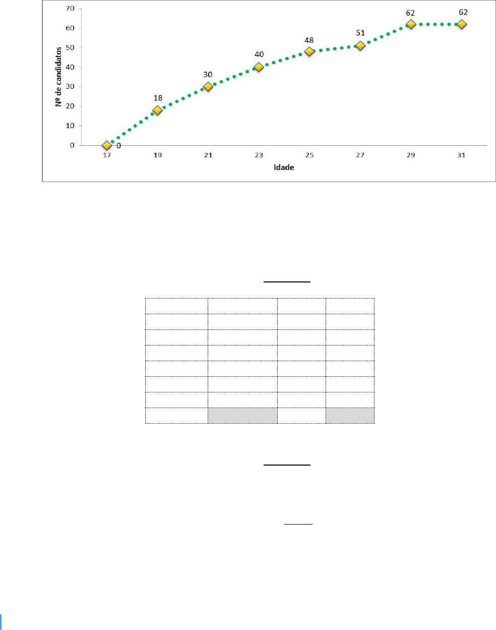 Colectânea de Exercícios Resolvidos de Estatística 7 Filipe Mahaluça 6. A idade média dos candidatos a um determinado curso de aperfeiçoamento oferecido por uma empresa foi sempre baixa, da ordem de 24 anos. Como esse curso foi preparado para todas as idades, decidiu-se fazer uma campanha de divulgação. Para verificar se a campanha foi ou não eficiente, fez-se um levantamento da idade dos candidatos à última promoção, obtendo-se os resultados do gráfico a seguir: a) Que tipo de gráfico se trata? Resposta: Trata-se de Polígono de Frequências Acumuladas ou Ogiva b) Apresente os dados em tabela (limites da classe, ponto médio da classe, frequência absoluta simples e acumulada). Resolução classe 𝑥𝑖 𝑓𝑖 𝐹𝑖 [17-19[ 18 18 18 [19-21[ 20 12 30 [21-23[ 22 10 40 [23-25[ 24 8 48 [25-27[ 26 3 51 [27-29[ 28 11 62 Total 62 c) Baseando-se nesses resultados, você diria que a campanha surtiu o efeito desejado? Resolução Primeiro temos que determinar o valor da média. A fórmula da média para dados agrupados é: �̅� = ∑𝑥𝑖∗𝑓𝑖∑𝑓𝑖 Nota que é necessário determinar o valor de 𝒙𝒊, recorrendo a tabela temos: Colectânea de Exercícios Resolvidos de Estatística 8 Filipe Mahaluça classe 𝑥𝑖 𝑓𝑖 𝑥𝑖 ∗ 𝑓𝑖 [17-19[ 18 18 324 [19-21[ 20 12 240 [21-23[ 22 10 220 [23-25[ 24 8 192 [25-27[ 26 3 78 [27-29[ 28 11 308 Total 62 1362 �̅� = ∑ 𝑥𝑖 ∗ 𝑓𝑖𝑛 = 136262 = 21.97 ≈ 22 Interpretação: Como a 𝑥 ̅ 2∗𝑆√𝑛 pode-se concluir que a campanha surtiu efeito Primeiro vamos determinar o valor de desvio padrão, recorrendo a seguinte fórmula: 𝑆 = √∑(𝑥𝑖 − �̅�)2 ∗ 𝑓𝑖𝑛 − 1 Pela tabela temos: classe 𝑥𝑖 𝑓𝑖 (𝑥𝑖 − �̅�)2 ∗ 𝑓𝑖 [17-19[ 18 18 288 [19-21[ 20 12 48 [21-23[ 22 10 0 [23-25[ 24 8 32 [25-27[ 26 3 48 [27-29[ 28 11 396 Total 62 812 𝑆 = √∑(𝑥𝑖−�̅�)2∗𝑓𝑖𝑛−1 =√81261 =√13.31148 = 3.648 24 − �̅� = 2 > 2 ∗ 3.648√62 = 0.927 Conclusão: A campanha foi efectiva. e) Determine a idade mediana e modal dos candidatos. Resolução Mediana