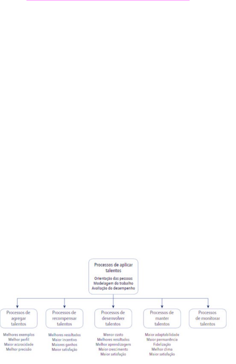 Processo de Aplicar pessoas, talentos e competências Pondo talentos e competências em ação Uma vez recrutadas e selecionadas, as pessoas deverão ser integradas à organização, posicionadas em seus respectivos cargos e tarefas e avaliadas quanto ao seu desempenho. As organizações funcionam adequadamente quando as pessoas estão em seus postos de trabalho e são capazes de desempenhar os papéis para os quais foram selecionadas, admitidas e preparadas. O processo de aplicar talentos e competências nas organizações · Envolvem a interação dos novos membros na organização, o desenho do trabalho a ser executado, o seu desempenho, a sua avaliação e feedback no decorrer de sua execução. · Orientado para o futuro e para a construção e sustentação do destino da organização, fundamentados em uma visão sistêmica e abrangente · Modelo orgânico acentuado à adaptabilidade e a flexibilidade. · Enfatizam a eficácia e exigem que as pessoas foquem mais nas metas a alcançar e nos objetivos a cumprir. · Privilegiam a mudança, a melhoria constante e o desenvolvimento das atividades, pois tudo precisa e deve mudar constantemente para assegurar a competitividade da organização em um mundo caracterizado por intensas transformações. · Incentivam a desenvolver com certa liberdade de escolhas as suas atividades, obedecendo às normas genéricas da organização. · importância aos aspectos do trabalho e valorização dos fatores motivacionais. Influência dos processos de aplicar talentos nos demais processos Modelo para aplicar pessoas na organização Enquanto os processos de agregar talentos e competências cuidam de localizar candidatos no mercado, selecioná-los e incorporar talentos para manter a continuidade da organização, o passo seguinte é sua integração e aplicação como força de trabalho no negócio. O trabalho organizacional não é feito ao acaso, a Modelagem do Trabalho determina as maneiras de desenhar e estruturar o trabalho dos talentos dentro da organização, dando-lhes significado e sentido. Modelagem do trabalho · Conceito de cargo; · Desenho de cargo; · Modelos de desenho de cargos; · Descrição e análise de cargos; · Natureza do trabalho; · Métodos de colheita de dados sobre cargos; · Gestão da carreira. Gestão do desempenho humano Como em todos os aspectos da vida, as organizações também possuem a necessidade de avaliar os mais diferentes desempenhos e principalmente, como está o desenvolvimento humano, isso porque são as pessoas que dão vida, dinâmica e inteligência às organizações. Para sobreviver e competir com sucesso em mercados cada vez mais dinâmicos, mutáveis, exigentes e competitivos, as organizações precisam se reinventar continuamente, a fim de se manterem sustentáveis. Avaliação do desempenho como integradora das práticas de gestão de pessoas image5.png image1.png image4.png image2.png image3.png