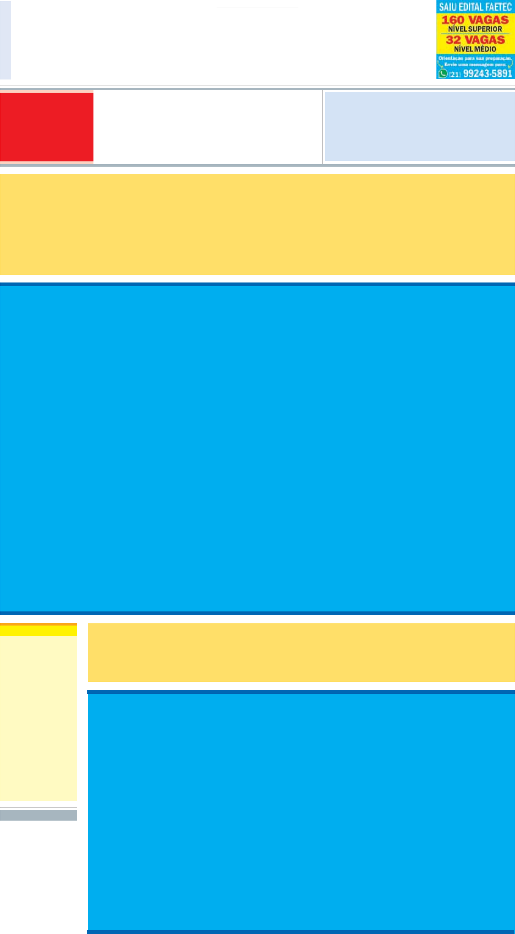FOLHA DIRIGIDA O M A I S C O M P L E T O J O R N A L E S P E C I A L I Z A D O E M E D U C A Ç Ã O , T R A B A L H O E C I D A D A N I A 15 A 21 OUTUBRO DE 2019 Publicação bissemanal | Ano XXXIV | Número 2.807w w w. fo lh ad ir ig id a. co m .b r Ri o de J an ei ro | R$ 4, 00 Nova Iguaçu, Maricá, Rio das Ostras, Rio das Flores, Angra dos Reis, Codeiro, Itatiaia, Areal e Laje do Muriaé estão com inscrições abertas para um total de 1.537 vagas em diversos cargos. Saiba como concorrer. PÁGINA 12 PREFEITURAS NO RJ: INSCRIÇÕES ABERTAS PARA 1.537 VAGAS. ATÉ R$11.500 DIVERSOS CARGOS. 1º, 2º E 3º GRAUS Unilever e BRF recebem inscrições para trainee As multinacionais Unilever e BRF selecionam recém-formados de várias áreas para preencher vagas de trainee em suas unidades. Página 10 A Fundação de Apoio à Escola Técnica (Faetec), órgão do governo do Estado do Rio de Janeiro, abriu concurso para preencher, inicialmente, 209 vagas em diversos cargos níveis médio, técnico e superior. Entre os destaques estão os cargos de inspetor de alunos, agente administrativo (ambos exigindo o antigo 2º grau) e professor. Até R$3 mil mensais. Inscrições abertas. PÁGINAS 8 E 9 FAETEC: SAIU CONCURSO PARA INSPETOR DE ALUNOS, AGENTE ADMINISTRATIVO, PROFESSOR E OUTROS CARGOS SÃO 209 VAGAS EM CARGOS DE 2º E 3º GRAUS Degase: concurso para 620 vagas Degase firmará, nos próximos dias, Termo de Ajustamento de Conduta com o Ministério Público para substituir temporários. PÁGINA 6 As Lojas Renner estão com inscrições abertas para vagas de empregos no Rio de Janeiro, Volta Redonda e Nova Friburgo. Salários variam de R$1.269 a R$8.531. Rede também seleciona para programa jovem aprendiz. Página 10 Lojas Renner: vagas de empregos e jovem aprendiz EEEEE SSSSS TTTTTA D OA D OA D OA D OA D O OOOOO P I N I à OP I N I à OP I N I à OP I N I à OP I N I à O Abaixo da média Muitíssimo abaixo da média, aliás. Vergonhosamente, essa é a real situação dos cursos supe- riores brasileiros. Pelo menos de acordo com o resultado do Exa- me Nacional de Desempenho do Estudantes (Enade), feito por estudantes ao final da gradua- ção e que é utilizado pelo Ins- tituto Nacional de Estudos e Pesquisas Educacionais Anísio Teixeira (Inep) para avaliar as nossas faculdades. Apenas e tão somente 5,8% dos 8.520 cursos, ou seja, 492, tiraram a nota máxima (5). Página 6 MP-RJ: prazo só até o dia 24. 2º e 3º graus Seguem abertas só até o próximo dia 24 as inscrições do concurso para técnico administrativo, ofi- cial, analista administrativo e analista processual do Ministério Público do Estado do Rio de Janeiro (MP-RJ). Até R$8.369. Página 7 Investigador: 100 vagas para nível médio Polícia Civil do Estado do Rio de Janeiro prepara concurso para mil vagas, das quais 100 serão para investigador. Diretora da Acadepol, Renata Teixeira, con- firma que cargo exigirá mesmo o nível médio. Página 6 Maricá: saiu concurso para 200 vagas de guarda municipal. 2º grau. R$2.449 A Prefeitura de Maricá, na Região Metropolitana do Estado do Rio de Janeiro, abriu concurso para 200 vagas de guarda municipal. Podem concorrer homens e mulheres que tenham o nível médio e idade até 35 anos. Remuneração de R$2.446. Inscrições começam na quarta, 16. Veja programa. PÁGINA 9 & Empregos Estágios 2 ÁREA FEDERALFOLHA DIRIGIDA 15 a 21 de outubro de 2019 Ploa prevê 32 mil provimentos, nos poderes Executivo, Judiciário e Legislativo SSSSSINALINALINALINALINAL VERDEVERDEVERDEVERDEVERDE | Projeto de Lei de Diretrizes Orçamentárias (LDO) para 2020 foi aprovado pelo plenário do Congresso Nacional LDO prevê possibilidade de novos concursos O projeto de Lei de Diretri- zes Orçamentárias (LDO) para 2020 foi aprovado pelo plená- rio do Congresso Nacional na última quarta-feira, dia 9. Ago- ra, o texto segue para sanção do presidente Jair Bolsonaro. Um dos principais tópicos é a pos- sibilidade de provimento e cri- ação de cargos e funções caso haja orçamento disponível. Isso pode ser favorável à reali- zação de novos concursos pú- blicos. Os parlamentares também ampliaram o trecho sobre o aumento salarial dos servido- res. Agora, há a inclusão dos profissionais civis e membros dos poderes nos reajustes. O texto inicial, enviado pelo Po- der Executivo, atribuía o au- mento apenas aos militares e seus pensionistas. A Lei de Di- retrizes Orçamentárias estabe- lece as metas e as prioridades para o exercício financeiro do ano seguinte, além de orientar a elaboração da Lei Orçamen- tária Anual (LOA - PLN 22/ 2019). A LDO de 2020 deveria ter sido votada antes do recesso de julho, como prevê a Constitui- ção. Porém, os congressistas não analisaram o texto dentro do prazo esperado. Por isso, re- alizaram o chamado ‘recesso branco’ - uma espécie de reces- so informal. Em agosto, o projeto de lei foi aprovado pela Comissão Mista de Orçamento (CMO) do Congresso Nacional. E en- tre as mudanças no texto en- viado pelo Executivo, consta- vam a liberação de concursos públicos no próximo ano, a criação de cargos e o provimen- to de civis e militares. O texto aprovado pela Co- missão Mista também previa a autorização para que cargos e funções sejam criados, além do provimento de civis. Isso desde que não ultrapassem o montante das quantidades e dos limites orçamentários do ano de 2020. Tal previsão consta no artigo 93, inciso IV do tex- to. Essas prerrogativas foram mantidas pelos parlamentares do Congresso Nacional. A LDO 2020 dá base à Lei Orçamentária Anual. Com a criação de cargos e provimen- tos prevista na LDO aprovada, o governo poderá utilizar o Or- çamento para contratações previsto no Projeto de Lei Or- çamentária (Ploa) de 2020. No total, o Planalto progra- ma até 32 mil provimentos, considerando os poderes Exe- cutivo, Judiciário e Legislativo, bem como o Ministério Públi- co da União (MPU) e a Defen- soria Pública da U