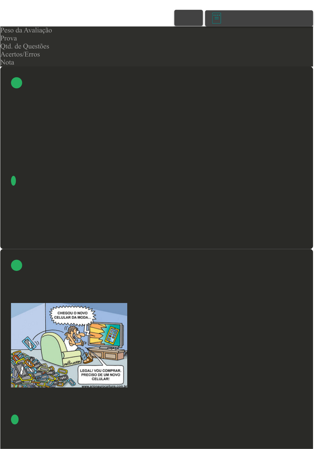 18/11/2024 17:04 Avaliação disciplina on-line about:blank 1/5 Prova Impressa GABARITO | Avaliação disciplina on-line (Cod.:983748) Peso da Avaliação 10,00 Prova 92727576 Qtd. de Questões 10 Acertos/Erros 9/1 Nota 9,00 A poluição por materiais plásticos é um grave problema ambiental e requer, para seu enfrentamento, três abordagens complementares: a drástica redução do uso, a substituição por novos materiais (com características similares ao plástico sintético) facilmente degradáveis e a destinação adequada dos resíduos, via coleta e reciclagem. Com base no exposto, assinale a alternativa CORRETA: FONTE: https://revistapesquisa.fapesp.br/2019/07/08/planeta-plastico/. Acesso em: 24 jul. 2019 (adaptado). A O consumidor é quem manda no mercado, suas escolhas influenciam as políticas ambientais e a produção de plásticos tende a aumentar com o reaproveitamento de embalagens usadas. B O cidadão pode contribuir com a redução do consumo de plásticos a partir de atitudes simples do dia a dia, como evitar o uso de materiais descartáveis, priorizar o reaproveitamento e a reciclagem. C A internet é uma rede de comunicação mundial que contribui para a disseminação de informações sobre a poluição por plásticos, o que gera melhoria ambiental direta. D A pessoa é responsável por aquilo que consome e gera de resíduos, bem como pela poluição por materiais plásticos, os quais são facilmente degradáveis e adequadamente coletados e reciclados. Os meios de comunicação que veiculam propagandas diversas, contribuem para o aumento do consumo do desnecessário. A figura anexa apresenta um exemplo de estratégia utilizada pela mídia para convencer o consumidor. Neste contexto, assinale a alternativa CORRETA: FONTE: encurtador.com.br/boxRX. Acesso em: 12 set. 2019. A A Política Nacional das Relações de Consumo visa contribuir para a divulgação de propagandas que estimulem o consumo de celulares. B Há uma incoerência entre a busca pela sustentabilidade global e as propagandas divulgadas nos meios de comunicação de massa. VOLTAR A+ Alterar modo de visualização 1 2 18/11/2024 17:04 Avaliação disciplina on-line about:blank 2/5 C O Código de Defesa do Consumidor prevê a proibição de propagandas que estimulem o consumo de produtos inovadores. D Mesmo com o aumento do consumo de celulares, a Logística Reversa garante o reaproveitamento de todos os resíduos, como já ocorre em todo território brasileiro. Quantos planetas Terra precisaríamos ter, para viver e consumir conforme os padrões médios atuais de cada continente? Dados apontam que pela média de consumo dos países da América do Norte seriam necessários 5,22 planetas; Europa 2,66; América Latina 1,11; Ásia Oriental e Oceania 0,72; e, África 0,61. Com base no exposto, assinale a alternativa CORRETA: FONTE: http://www.inpe.br/noticias/arquivos/pdf/RIO+20-web.pdf. Acesso em: 12 set. 2019 (adaptado). A Os países ricos do hemisfério norte são exemplos de sustentabilidade para os países pobres do hemisfério sul. B Na América Latin, os padrões de consumo estão no limite de capacidade de o planeta suportar a exploração, enquanto na África esse limiar já foi ultrapassado. C As nações que mais consomem recursos naturais estão concentradas no hemisfério norte e se os seus hábitos de consumo fossem universalizados, a vida no planeta seria insustentável. D A sustentabilidade do planeta Terra depende dos padrões médios de consumo da humanidade, e se todas as pessoas consumissem como os africanos o planeta estaria condenado à exaustão. Quando escolhemos um produto, por exemplo, na prateleira de um supermercado, espera-se que as informações constantes no rótulo sejam suficientes para tomar a decisão entre uma opção e outra. Esse direito à informação está previsto na Política Nacional de Relações de Consumo. Onde consta esta política? A Código de Defesa do Meio Ambiente. B Código de Defesa do Idoso. C Código de Defesa do Trabalhador. D Código de Defesa do Consumidor. Considerando as informações da figura anexa, analise as sentenças a seguir: I- O consumidor é levado a adquirir produtos que não necessita para viver, mas que agrada o seu ego. II- Pelo excesso de consumo muitos se endividam, chegando ao ponto de ter seu nome em listas de inadimplentes. III- A figura expressa a ideia de consumo sustentável. IV- Fica evidente a importância do nome nas embalagens para promover a sustentabilidade. Assinale a alternativa CORRETA: 3 4 5 18/11/2024 17:04 Avaliação disciplina on-line about:blank 3/5 FONTE: http://marianomarinho.blogspot.com/2015/09/humor.html. Acesso em: 12 set. 2019. A As sentenças III e IV estão corretas. B As sentenças I e II estão corretas. C As sentenças I, II e III estão corretas. D As sentenças I, III e IV estão corretas. O conceito de sustentabilidade remete ao equilíbrio entre o tripé social, ambiental e econômico, de modo a garantir que as gerações futuras desfrutem dos recursos naturais que dispomos hoje. Na figura apresentada, demonstra-se uma das possibilidades para compreender o conceito de sustentabilidade. Com base no exposto, assinale a alternativa CORRETA: FONTE: SANTOS, K.R.S. Estudos Transversais: Relações de Consumo e Sustentabilidade. Editora UNIASSELVI, Indaial, 2019, 62 p. A O uso do termo sustentabilidade é recente, bem como as ideias que essa palavra inovadora trouxe para a humanidade promover o equilíbrio planetário. B A partir do conhecimento, consciência e atitude se chega à sustentabilidade, um conceito estável e permanente, de fácil compreensão e impraticável para as pessoas. C A sustentabilidade é o conceito científico mais amplo, que engloba o conhecimento, a consciência e as atitudes das pessoas em prol da produção industrial. D A sustentabilidade é um termo amplo e integrador dos diversos ramos do conhecimento e sua aplicação requer consciência e atitudes responsáveis. Dentre os d