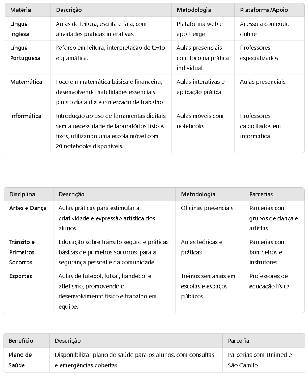 Projeto de Educação e Desenvolvimento Social Introdução Este projeto tem como objetivo proporcionar uma educação mais completa e integrada, com foco em aulas complementares, esportes e saúde, visando o desenvolvimento integral dos alunos da rede pública municipal. Através de uma abordagem inovadora e de parcerias estratégicas, o projeto abrange tanto a área educacional quanto o bem- estar social, promovendo a inclusão e o suporte a todos os estudantes, inclusive à comunidade venezuelana. 1. Educação 1.1. Aulas Extras e Reforço Escolar 1.2. Aulas de Artes, Cultura e Saúde 2. Saúde • Objetivo: Garantir o acesso à saúde para os alunos atendidos pelo projeto, assegurando cuidados preventivos e emergenciais. 3. Inclusão Social: Comunidade Venezuelana • Objetivo: Facilitar a integração dos venezuelanos através de um programa de aulas especiais com professores nativos, visando à compreensão e absorção do conteúdo em português e outras disciplinas essenciais. 4. Mídia e Divulgação • Objetivo: Fortalecer a imagem do projeto e garantir que sua atuação seja amplamente conhecida pela comunidade. 5. Profissionais Todos os professores envolvidos neste projeto são profissionais formados e altamente capacitados, com anos de experiência em sala de aula. Eles foram cuidadosamente selecionados para garantir a máxima qualidade no ensino, tanto nas disciplinas acadêmicas quanto nas áreas artísticas e esportivas. Esses educadores possuem a expertise necessária para atender às demandas dos alunos, oferecendo suporte individualizado e estratégias pedagógicas eficazes, de forma a promover o desenvolvimento integral de cada estudante. 6. Conclusão Este projeto tem um impacto significativo na comunidade ao promover uma educação de qualidade, acessível e integrada a outras áreas fundamentais como esporte e saúde. O apoio da prefeitura, por meio dessa parceria, será crucial para garantir o sucesso da iniciativa, trazendo benefícios imediatos para a população, especialmente para aqueles que mais necessitam.