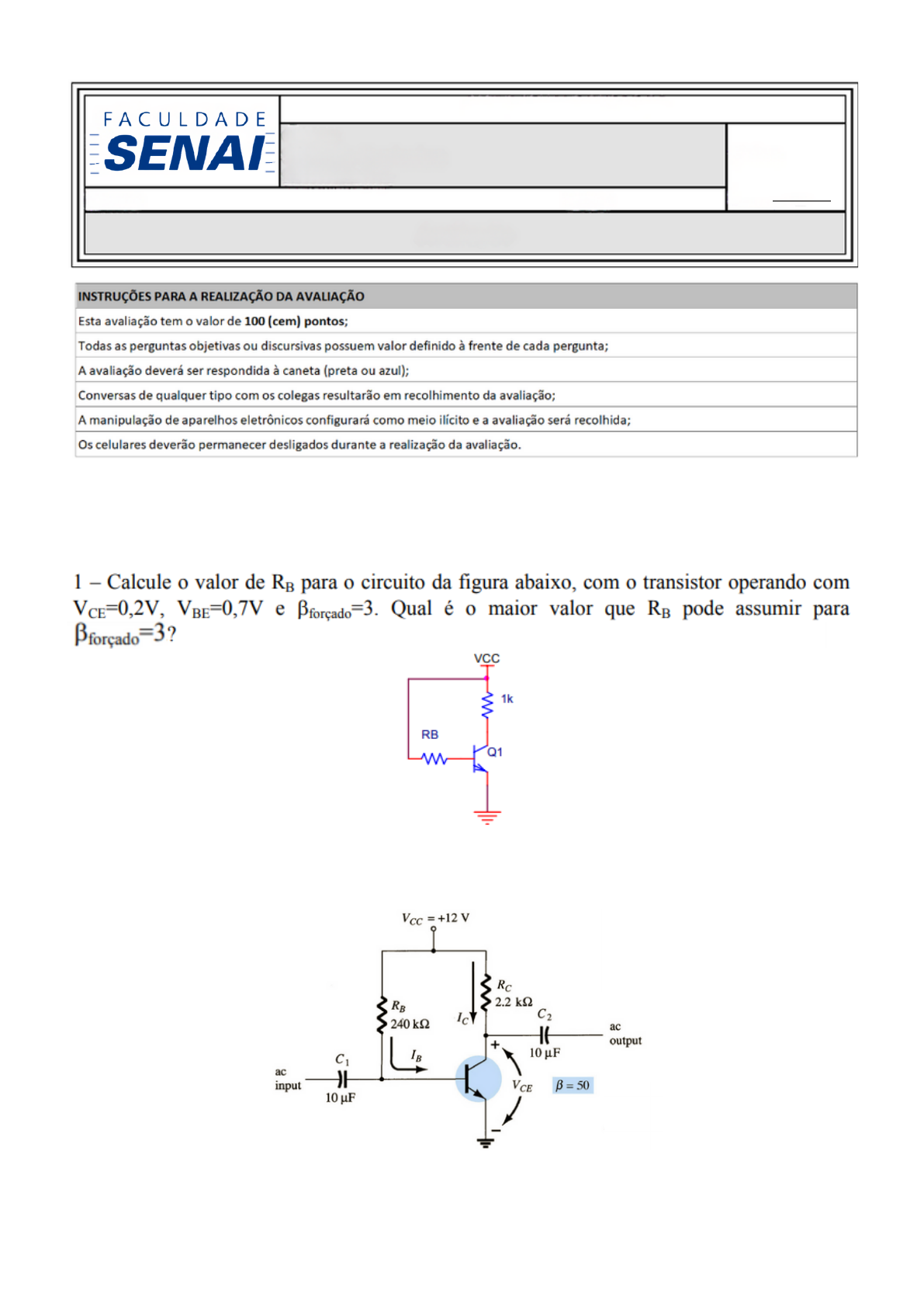 2 - Para o Circuito abaixo calcule I , I , V , V , V , V e V .B C CB BC BE CE Nome: Professora: Unidade Curricular: Curso: FATEC SENAI DOURADOS Valor: Nota:Data: Avaliação ELETRÔNICA II Valor:20 Valor:30 P x V x I = 20mW Potência máxima dissipada no Transistor,Cmáx CCE Rc RE 3 - Determinar R , R , V e V para a polarização do transistor de Si, do circuito abaixo: C E CE CC Dados: PD = 32mW PD = 8mW ≥100 I = 4 mAC 4 - Determinar R , R e R para a polarização do transistor de Si, abaixo:C E B 5 - Para transistores PNP e NPN, como devemos polarizar a base dos mesmos. E entre base e coletor, qual apresenta maior corrente e menor corrente? Valor:15 Valor:20 Valor:15 2. 3. RESOLUÇÃO R: sendo 1.10 = o resistor de 1k 3 1. 4.