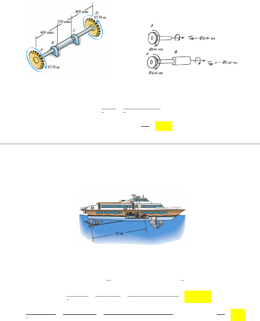 Torção 206 Resolução: Steven Róger Duarte *5.48. O eixo de aço A-36 é composto pelos tubos AB e CD e uma seção maciça BC. Está apoiado em mancais lisos que permitem que ele gire livremente. Se as engrenagens, presas às extremidades do eixo, forem submetidas a torques de 85 N.m, determine o ângulo de torção da extremidade B da seção maciça em relação à extremidade C. Os tubos têm diâmetro externo de 30 mm e diâmetro interno de 20 mm. A seção maciça tem diâmetro de 40 mm. Figura 5.48 = 0,001127347 rad x = 0,0646° 5.49. O eixo da hélice do hidrofólio é de aço A-36 e tem 30 m de comprimento. Está acoplado a um motor diesel em linha, o qual transmite uma potência máxima de 2.000 kW e provoca rotação de 1.700 rpm no eixo. Se o diâmetro externo do eixo for 200 mm e a espessura da parede for 10 mm, determine a tensão de cisalhamento máxima desenvolvida no eixo. Determine também o ângulo de torção no eixo à potência total. Figura 5.49 ci = c0 – t = 100 – 10 = 90 mm = 178,0236 rad/s ; ( ) ( ) ( ) = 20,797 MPa ( ) ( ) ( )( ) = (0,083188 rad) x = 4,766° Torção 207 Resolução: Steven Róger Duarte 5.50. As extremidades estriadas e engrenagens acopladas ao eixo de aço A-36 estão sujeitas aos torques mostrados. Determine o ângulo de torção da engrenagem C em relação à engrenagem D. O eixo tem diâmetro de 40 mm. Figura 5.50 ; = (0,004244 rad) x = 0,243° 5.51. O eixo de aço A-36 de 20 mm de diâmetro é submetido aos torques mostrados. Determine o ângulo de torção da extremidade B. Figura 5.51 TBC = 80 N.m TCD = 80 – 20 = 60 N.m TDA = 60 + 30 = 90 N.m = (0,1 rad) x = 5,74° Torção 208 Resolução: Steven Róger Duarte *5.52. O parafuso de aço A-36 com 8 mm de diâmetro está parafusado firmemente ao bloco em A. Determine as forças conjugadas F que devem ser aplicadas à chave de torque de modo que a tensão de cisalhamento máxima no parafuso seja de 18 MPa. Calcule também o deslocamento correspondente de cada força F necessário para causar essa tensão. Considere que a chave de torque seja rígida. Figura 5.52 T = 2 x 150F = 300F ; ( )( ) F = 6,03 N ; = 0,720 mm 5.53. A turbina desenvolve 150 kW de potência, que é transmitida às engrenagens de tal modo que C recebe 70% e D recebe 30%. Se a rotação do eixo de aço A-36 de 100 mm de diâmetro for = 800 rev/minuto, determine a tensão de cisalhamento máxima absoluta no eixo e o ângulo de torção da extremidade E do eixo em relação a B. O mancal em E permite que o eixo gire livremente em torno de seu eixo. Figura 5.53 Dados: P = 150 kW ; c = 50 mm ; ; Gaço = 75 GPa = 83,776 rad/s ; = 1790,493 N.m PC = 70% x 150 = 105 kW ; = 1253,342 N.m PD = 30% x 150 = 45 kW ; = 537,147 N.m = 9,12 MPa ; = (0,01021317 rad) x = 0,585° Torção 209 Resolução: Steven Róger Duarte 5.54. A turbina desenvolve 150 kW de potência, que é transmitida às engrenagens de tal modo que C e D recebem quantidades iguais. Se a rotação do eixo de aço A-36 de 100 mm de diâmetro for = 500 rev/minuto, determine a tensão de cisalhamento máxima absoluta no eixo e a rotação da extremidade B do eixo em relação a E. O mancal em C permite que o eixo gire livremente em torno de seu eixo. Figura 5.54 Dados: P = 150 kW ; c = 50 mm ; Gaço = 75 GPa = 52,36 rad/s = 2864,789 N.m ; = 14,6 MPa ; = 75 kW = 1432,394 N.m ; = (0,019454 rad) x = 1,11° 5.55. O motor transmite 33 kW ao eixo de aço inoxidável 304 quando gira a 20 Hz. O eixo é apoiado em mancais lisos em A e B, que permite a livre rotação do eixo. As engrenagens C e D presas ao eixo absorvem 20 kW e 12 kW, respectivamente. Determine o diâmetro do eixo com aproximação de mm se a tensão de cisalhamento admissível for τadm = 56 MPa e o ângulo de torção admissível de C em relação a D for 0,2º. Figura 5.55 Dados: Pm = 33 kW ; f = 20 Hz ; PD = 12 kW ; PC = 20 kW ; LCD = 200 mm ; Gaço = 75 GPa ; = 0,2° = 3,491 rad Tm = = 262,6056 N.m ; √ = 14,4 mm TCD = = 95,493 N.m ; ( ) √ = 14,68 mm d = 2c = 2 x 14,4 = 28,8 mm 30 mm