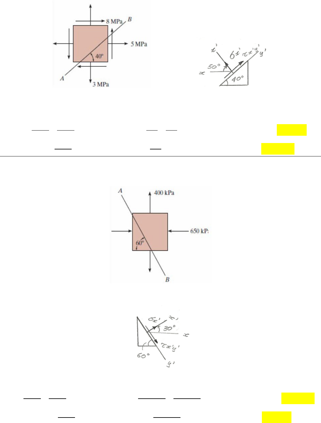 Transformação da Tensão 514 Resolução: Steven Róger Duarte 9.7. Resolva o Problema 9.2 usando as equações de transformação de tensão desenvolvidas na Seção 9.2. Figura 9.7 ( ) ( ) ( ) ( ) = - 4,05 MPa ( ) ( ) ( ) ( ) = - 0,404 MPa *9.8. Resolva o Problema 9.4 usando as equações de transformação de tensão desenvolvidas na Seção 9.2. Figura 9.8 ( ) ( ) ( ) = - 387,5 kPa = - 0,387 MPa ( ) ( ) ( ) = 454,66 kPa = 0,455 MPa Transformação da Tensão 515 Resolução: Steven Róger Duarte 9.9. Resolva o Problema 9.6 usando as equações de transformação de tensão desenvolvidas na Seção 9.2. Mostre o resultado em um desenho. Figura 9.9 ( ) ( ) ( ) ( ) = 49,7 MPa ( ) ( ) ( ) ( ) = - 34,8 MPa 9.10. Determine o estado de tensão equivalente em um elemento, se ele estiver orientado a 30º em sentido anti-horário em relação ao elemento mostrado. Use as equações de transformação de tensão. Figura 9.10 ( ) ( ) ( ) ( ) 0,748 MPa ( ) ( ) ( ) ( ) - 1,048 MPa ( ) ( ) ( ) ( ) = 345,096 kPa = 0,345 MPa Transformação da Tensão 516 Resolução: Steven Róger Duarte 9.11. Determine o estado de tensão equivalente em um elemento, se ele estiver orientado a 60º em sentido horário em relação ao elemento mostrado. Figura 9.11 ( ) ( ) ( ) ( ) - 0,0289 MPa ( ) ( ) ( ) ( ) 0,329 MPa ( ) ( ) ( ) ( ) = 69,90 kPa = 0,0699 MPa *9.12. Resolva o Problema 9.6 usando as equações de transformação de tensão. Figura 9.12 ; ( ) ( ) ( ) ( ) 49,7 MPa ( ) ( ) ( ) ( ) = - 34,8 MPa Transformação da Tensão 517 Resolução: Steven Róger Duarte 9.13. O estado de tensão em um ponto é mostrado no elemento. Determine (a) as tensões principais e (b) a tensão de cisalhamento máxima no plano e a tensão normal média no ponto. Especifique a orientação do elemento em cada caso. Figura 9.13 (a) As tensões principais: √. / √. , - / = - 7,5 MPa 60,467 MPa ; ( ) ( ) ⁄ ( , -) ⁄ ; ( ) ( ) , - , - ( ) ( ) 53 MPa (b) A tensão de cisalhamento máxima no plano e a tensão normal média no ponto: √. / √. , - / = 60,5 MPa = - 7,50 MPa ( ) , - ; ( ) ( ) , - ( ) ( ) = 60,5 MPa