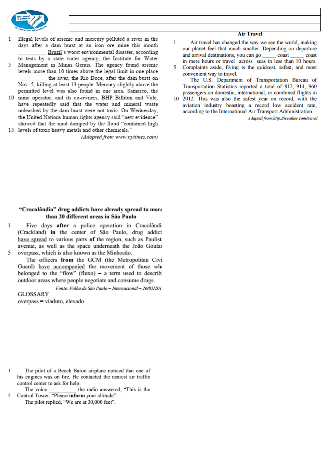 1.EEAR2018 Fill in the blanks with the option that best completes the text. a over / in b in / along c at / along d on / across 2. EEAR 2018The words “after”, “in”, “of” and “from”, in bold in the text, are __________. a articles b adverbs c pronouns d prepositions 3. EEAR 2017Choose the best alternative to complete the blank in the text. a on b for c into d until 4. Fill in the blank with the suitable prepositions. a from / from b from / to c at / from d to / from Read the text and answer question. Part of New Bicycle Path Collapses in Rio de Janeiro Leaving Two Deaths The Rio Fire Department says two people died __ Thursday, April 21, after a part __ the recently inaugurated bicycle path on Niemeyer avenue, __ the south zone of Rio de Janeiro. The path was named after Brazilian singer Tim Maia and is located between Niemeyer avenue and a cliff, hanging over the sea The path is a connection between Leblon beach and São Conrado, both in the city’s south zone. The bike path was inaugurated earlier this year, on January 17, and cost R$ 44,7 million. Glossary Hanging over – suspenso sobre 5. EEAR2016Fill in the blanks with the appropriate prepositions to complete the text. a in – on – of b on – of – in c of – in – on d in – of – o 6. EEAR2016 Choose the alternative that best completes the sentence below. I stayed in London ___ a few days during my vacation. I came back to Brazil ___ May 1st a in – at b for – in c in – on d for – on Disciplina: Inglês Professor: Elaine Ramos Assunto: Prepositions 7. EEAR 2015 Fill in the blanks, in the text, with the appropriate preposition, respectively: a of / from b from / to c of / for d at / of 8. 2014 EEAR Fill in The blanks with the suitable option a for – to – on – in b on – in – from – to c to – from – in – for d since – for – from – to 9. The correct prepositions to fill in the blanks are, respectively: a of/ to/ in/ from b in/ of/ from/ to c from/ in/ to/ of d to/ from/ of/ in 10. EEAR 2013 Fill in the blank with a suitable option: a In b For c Since d During 11. Fill in the blanks with the suitable options, respectively: a by - by b to - to c for - for d from - from Man on the Moon ___ July 21, 1969, ___ 2:56 a.m. (Greenwich Mean Time) the American astronaut Neil Armstrong left the lunar module of Apollo 11 and put his left foot on the surface of the moon. (Adapted from Password English Book) 12. EEAR 2012 The correct prepositions to fill in the blanks are, respectively: a In / at b In / on c On / on d On / at 13.EEAR 2012 Fill in the blank with the appropriate word to complete the text: a One b Among c Between d Considering 14. Complete the sentence below with the correct prepositions, respectively. Choose the CORRECT answer. “I'm flying to Spain ______ 8 o'clock _____ the morning _______the 22nd of April." a) in / on / at b) at / in / on c) on / at / in d) at / on / in . 15. EEAR 2011 The correct prepositions to fill in the blanks are, respectively: a for / by b till / with c from / by d from / on Observe the city map. 16.lt’s correct to say that the A.grocery store is in front of the high school. B.library is behind the hospital. C.drugstore is next to the café. D.barbershop is across from the sports center. E.the bank is between the shopping center. 17.Choose the correct option to complete the text below. International Congress Join us _______our 2016 International Education Conference _______ Orlando, at the Disney's BoardWalk Inn! The BoardWalk is located within the Walt Disney World Resort and 10 minutes away _______ the Epcot Theme Park. In addition to the Education Conference, we are also hosting a Business Conference that will be held on the same days, at the same venue. (Abridged from http://www, cluteinstitute.com/education-conferences/) A. in/in/at B. on/in/under C. at/at/under D. at/in/from E. in/at/from 18. Choose the correct option to complete the blanks. “My name is Tyler Benson and I work _______ an office in New York City. During the week, I get up _______ six-thirty. I go _______ work _______ train, but _______ Fridays I drive my car so I can visit my mother _______ the afternoon. I start work _______ a quarter to nine and I have lunch _______ work. _______ the summer, I work different hours because _______ June 15th, we change to the summer timetable. It`s very hot in New York City _______ August, so most people go on vacation.” a to – at – for – to – on – at – to – on – On – in - on b for – at – for – by – in – on – on – at – At – on - at c by – at – to – on – in – in – at – in – In – on – in d in – at – to – by – on – in – at – at – In – on – in
