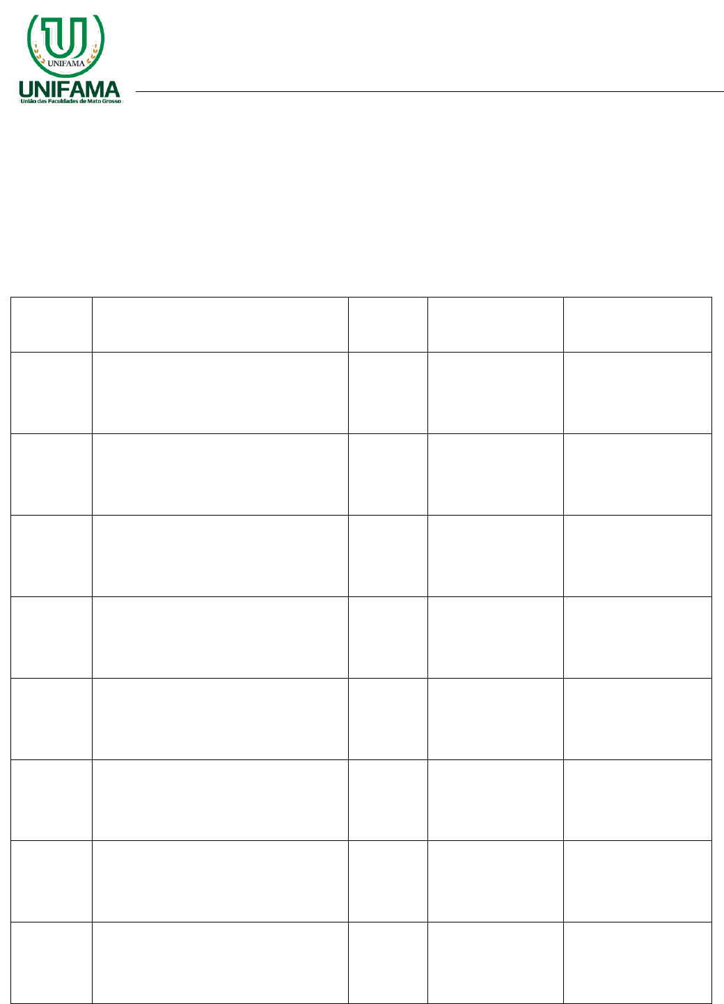 Faculdade de Guarantã do Norte - UNIFAMA Mantida pela UNIFAMA – União das Faculdades de Mato Grosso Curso de Farmácia FORMULÁRIO DE CONTROLE DO ESTÁGIO Acadêmico (a): Alicy Caroline Rodrigues Prado Professor (a): Pablo Junior Pereira Estabelecimento: Laboratório Municipal de Peixoto de Azevedo Data Atividades Desenvolvidas Carga Horária Estagiário Supervisor Responsável Faculdade de Guarantã do Norte - UNIFAMA Mantida pela UNIFAMA – União das Faculdades de Mato Grosso Curso de Farmácia ASSINATURAS Acadêmico: ___________________________________________________________ Supervisor (a) de estágio: ________________________________________________ Professor (a) de estágio: _________________________________________________ Coordenador (a): _______________________________________________________