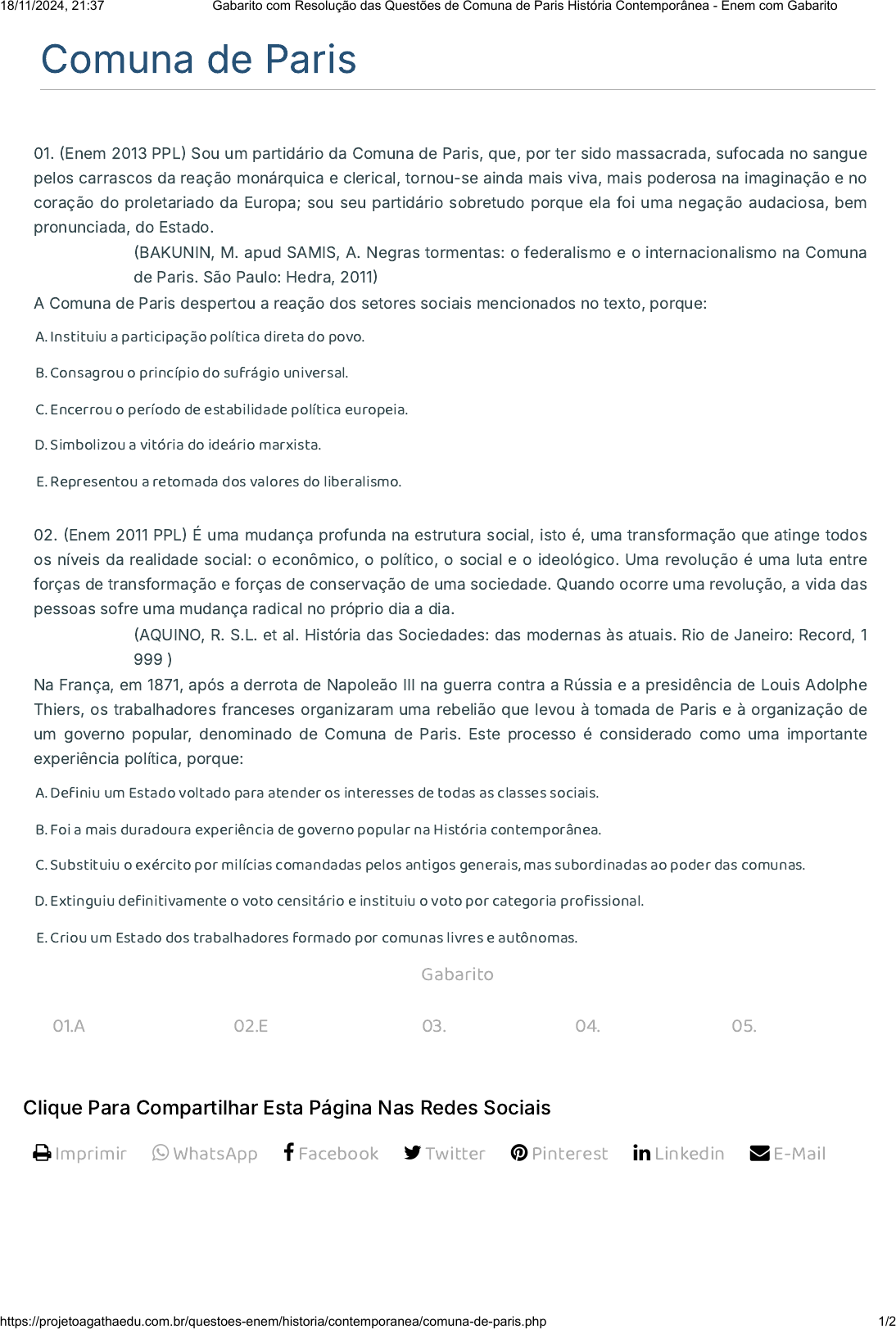 Comuna de Paris 01. �Enem 2013 PPL� Sou um partidário da Comuna de Paris, que, por ter sido massacrada, sufocada no sangue pelos carrascos da reação monárquica e clerical, tornou-se ainda mais viva, mais poderosa na imaginação e no coração do proletariado da Europa; sou seu partidário sobretudo porque ela foi uma negação audaciosa, bem pronunciada, do Estado. �BAKUNIN, M. apud SAMIS, A. Negras tormentas: o federalismo e o internacionalismo na Comuna de Paris. São Paulo: Hedra, 2011� A Comuna de Paris despertou a reação dos setores sociais mencionados no texto, porque: A. Instituiu a participação política direta do povo. B. Consagrou o princípio do sufrágio universal. C. Encerrou o período de estabilidade política europeia. D. Simbolizou a vitória do ideário marxista. E. Representou a retomada dos valores do liberalismo. 02. �Enem 2011 PPL� É uma mudança profunda na estrutura social, isto é, uma transformação que atinge todos os níveis da realidade social: o econômico, o político, o social e o ideológico. Uma revolução é uma luta entre forças de transformação e forças de conservação de uma sociedade. Quando ocorre uma revolução, a vida das pessoas sofre uma mudança radical no próprio dia a dia. �AQUINO, R. S.L. et al. História das Sociedades: das modernas às atuais. Rio de Janeiro: Record, 1 999 ) Na França, em 1871, após a derrota de Napoleão III na guerra contra a Rússia e a presidência de Louis Adolphe Thiers, os trabalhadores franceses organizaram uma rebelião que levou à tomada de Paris e à organização de um governo popular, denominado de Comuna de Paris. Este processo é considerado como uma importante experiência política, porque: A. De�niu um Estado voltado para atender os interesses de todas as classes sociais. B. Foi a mais duradoura experiência de governo popular na História contemporânea. C. Substituiu o exército por milícias comandadas pelos antigos generais, mas subordinadas ao poder das comunas. D. Extinguiu de�nitivamente o voto censitário e instituiu o voto por categoria pro�ssional. E. Criou um Estado dos trabalhadores formado por comunas livres e autônomas. Gabarito 01.A 02.E 03. 04. 05. Clique Para Compartilhar Esta Página Nas Redes Sociais Imprimir WhatsApp Facebook Twitter Pinterest Linkedin E-Mail 18/11/2024, 21:37 Gabarito com Resolução das Questões de Comuna de Paris História Contemporânea - Enem com Gabarito https://projetoagathaedu.com.br/questoes-enem/historia/contemporanea/comuna-de-paris.php 1/2 https://projetoagathaedu.com.br/questoes-enem/historia/contemporanea/comuna-de-paris.php https://projetoagathaedu.com.br/questoes-enem/historia/contemporanea/comuna-de-paris.php https://api.whatsapp.com/send?text=Gabarito%20com%20Resolu%C3%A7%C3%A3o%20das%20Quest%C3%B5es%20de%20Comuna%20de%20Paris%20Hist%C3%B3ria%20Contempor%C3%A2nea%20-%20Enem%20com%20Gabarito%20https%3A%2F%2Fprojetoagathaedu.com.br%2Fquestoes-enem%2Fhistoria%2Fcontemporanea%2Fcomuna-de-paris.php https://api.whatsapp.com/send?text=Gabarito%20com%20Resolu%C3%A7%C3%A3o%20das%20Quest%C3%B5es%20de%20Comuna%20de%20Paris%20Hist%C3%B3ria%20Contempor%C3%A2nea%20-%20Enem%20com%20Gabarito%20https%3A%2F%2Fprojetoagathaedu.com.br%2Fquestoes-enem%2Fhistoria%2Fcontemporanea%2Fcomuna-de-paris.php https://www.facebook.com/sharer/sharer.php?u=https%3A%2F%2Fprojetoagathaedu.com.br%2Fquestoes-enem%2Fhistoria%2Fcontemporanea%2Fcomuna-de-paris.php https://www.facebook.com/sharer/sharer.php?u=https%3A%2F%2Fprojetoagathaedu.com.br%2Fquestoes-enem%2Fhistoria%2Fcontemporanea%2Fcomuna-de-paris.php https://twitter.com/intent/tweet?url=https%3A%2F%2Fprojetoagathaedu.com.br%2Fquestoes-enem%2Fhistoria%2Fcontemporanea%2Fcomuna-de-paris.php&text=Gabarito%20com%20Resolu%C3%A7%C3%A3o%20das%20Quest%C3%B5es%20de%20Comuna%20de%20Paris%20Hist%C3%B3ria%20Contempor%C3%A2nea%20-%20Enem%20com%20Gabarito https://twitter.com/intent/tweet?url=https%3A%2F%2Fprojetoagathaedu.com.br%2Fquestoes-enem%2Fhistoria%2Fcontemporanea%2Fcomuna-de-paris.php&text=Gabarito%20com%20Resolu%C3%A7%C3%A3o%20das%20Quest%C3%B5es%20de%20Comuna%20de%20Paris%20Hist%C3%B3ria%20Contempor%C3%A2nea%20-%20Enem%20com%20Gabarito https://www.pinterest.com/pin/create/button/?url=https%3A%2F%2Fprojetoagathaedu.com.br%2Fquestoes-enem%2Fhistoria%2Fcontemporanea%2Fcomuna-de-paris.php&description=Resolu%C3%A7%C3%A3o%20das%20Quest%C3%B5es%20de%20Comuna%20de%20Paris%3A%20Hist%C3%B3ria%20Contempor%C3%A2nea%20-%20Enem%20com%20Gabarito https://www.pinterest.com/pin/create/button/?url=https%3A%2F%2Fprojetoagathaedu.com.br%2Fquestoes-enem%2Fhistoria%2Fcontemporanea%2Fcomuna-de-paris.php&description=Resolu%C3%A7%C3%A3o%20das%20Quest%C3%B5es%20de%20Comuna%20de%20Paris%3A%20Hist%C3%B3ria%20Contempor%C3%A2nea%20-%20Enem%20com%20Gabarito https://www.linkedin.com/shareArticle?mini=true&url=https%3A%2F%2Fprojetoagathaedu.com.br%2Fquestoes-enem%2Fhistoria%2Fcontemporanea%2Fcomuna-de-paris.php&title=Gabarito%20com%20Resolu%C3%A7%C3%A3o%20das%20Quest%C3%B5es%20de%20Comuna%20de%20Paris%20Hist%C3%B3ria%20Contempor%C3%A2nea%20-%20Enem%20com%20Gabarito&summary=Resolu%C3%A7%C3%A3o%20das%20Quest%C3%B5es%20de%20Comuna%20de%20Paris%3A%20Hist%C3%B3ria%20Contempor%C3%A2nea%20-%20Enem%20com%20Gabarito https://www.linkedin.com/shareArticle?mini=true&url=https%3A%2F%2Fprojetoagathaedu.com.br%2Fquestoes-enem%2Fhistoria%2Fcontemporanea%2Fcomuna-de-paris.php&title=Gabarito%20com%20Resolu%C3%A7%C3%A3o%20das%20Quest%C3%B5es%20de%20Comuna%20de%20Paris%20Hist%C3%B3ria%20Contempor%C3%A2nea%20-%20Enem%20com%20Gabarito&summary=Resolu%C3%A7%C3%A3o%20das%20Quest%C3%B5es%20de%20Comuna%20de%20Paris%3A%20Hist%C3%B3ria%20Contempor%C3%A2nea%20-%20Enem%20com%20Gabarito mailto:?subject=Gabarito%20com%20Resolu%C3%A7%C3%A3o%20das%20Quest%C3%B5es%20de%20Comuna%20de%20Paris%20Hist%C3%B3ria%20Contempor%C3%A2nea%20-%20Enem%20com%20Gabarito&body=Resolu%C3%A7%C3%A3o%20das%20Quest%C3%B5es%20de%20Comuna%20de%20Paris%3A%20Hist%C3%B3ria%20Contempor%C3%A