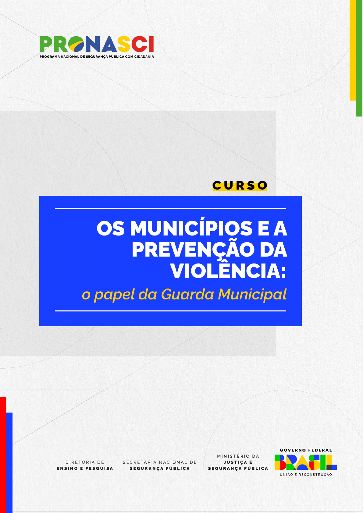 Presidência da República Luiz Inácio Lula da Silva Ministério da Jus�ça e Segurança Pública Flávio Dino de Castro e Costa Secretaria Nacional de Segurança Pública Francisco Tadeu Barbosa de Alencar Diretoria de Ensino e Pesquisa Michele Gonçalves dos Ramos Coordenação-Geral de Ensino Ana Claudia Bernardes Vilarinho de Oliveira Coordenação Pedagógica Joyce Cris�ne da Silva Carvalho Coordenação de Ensino a Distância Renata Guilhões Barros Santos Gerente de Curso Maria Derli Silva dos Santos Luciana Costa Jatahy de Castro Conteudistas Juliana Teixeira de Souza Mar�ns Nedson Moreira Gonçalves Rômulo Reis de Almeida Revisão Técnica Franciane Aparecida da Silva Revisão Pedagógica Ardmon dos Santos Barbosa Evania Santos Assunção Mota Revisão Textual Wener Vieira dos Santos Programação e Edição Renato Antunes dos Santos Fábio Nevis dos Santos Design Instrucional Anne Caroline Bogarin Manzolli Schumacher Sumário APRESENTAÇÃO DO CURSO ......................................................................................... 7 2. OBJETIVO DO CURSO ......................................................................................... 10 2.1 Obje�vo Geral .......................................................................................................... 10 2.2 Obje�vos Específicos ............................................................................................... 10 3. ESTRUTURA DO CURSO ..................................................................................... 11 MÓDULO 1 – O MUNICÍPIO E A SEGURANÇA PÚBLICA: COMPETÊNCIAS E DESAFIOS .. 12 Apresentação ................................................................................................................. 12 Obje�vos do módulo ..................................................................................................... 14 Estrutura do módulo ...................................................................................................... 14 AULA 1 - VIOLÊNCIA URBANA E PREVENÇÃO ................................................................ 15 1.1 Violência urbana como fenômeno social ............................................................ 15 1.2 Tendências recentes da criminalidade urbana no Brasil ..................................... 18 1.3 Violência urbana e prevenção ............................................................................. 28 AULA 2 – O PAPEL DO MUNICÍPIO NA SEGURANÇA PÚBLICA ....................................... 37 2.1 Histórico da par�cipação dos municípios na segurança pública ......................... 37 2.2. Conselhos Municipais de Segurança Pública ...................................................... 40 2.3. Gabinetes de Gestão Integrada Municipal (GGIMs) ........................................... 42 2.4. Observatórios de Segurança Municipais ............................................................ 44 2.5. Por que o município deve atuar na gestão de segurança pública? .................... 45 2.7. O município como agente estratégico na segurança pública ............................. 46 2.3 Indicadores de engajamento dos municípios na segurança pública ................... 50 AULA 3 – GESTÃO DA SEGURANÇA EM ÂMBITO MUNICIPAL ........................................ 53 3.1 Tipos de polí�cas de segurança cidadã ............................................................... 53 3.2 Exemplos de polí�cas e ações municipais ........................................................... 54 3.3 Dificuldades na execução de polí�cas municipais de segurança ........................ 71 MÓDULO II – AS GUARDAS MUNICIPAIS NO SISTEMA ÚNICO DE SEGURANÇA PÚBLICA 74 Apresentação do módulo .............................................................................................. 74 Obje�vo do módulo ....................................................................................................... 75 Estrutura do módulo ...................................................................................................... 76 AULA 1 – COMPETÊNCIAS DAS GUARDAS MUNICIPAIS (LEI Nº 13.022/2014) .............. 77 1.1 Introdução ao tema ............................................................................................. 77 1.2 Abordagem legal das competências das Guardas Municipais............................. 80 1.3 Atuação preven�va das guardas como polícias cidadãs e comunitárias em espaços de desordem social .................................................................................................... 87 Aula 2 – Introdução ao Sistema Único de Segurança Pública ....................................... 94 2.1 O que é o Susp? ................................................................................................... 96 2.2 Polí�ca Nacional de Segurança Pública e Defesa Social (PNSPDS) ...................... 97 2.3 Obje�vos do Plano Nacional de Segurança Pública e Defesa Pessoal (PNSP) ..... 97 Aula 3 - O papel das Guardas Municipais no Susp ........................................................ 99 3.1 Aspectos introdutórios: Preparação das Guardas para integrar o Susp ............. 99 3.2 O papel das Guardas Municipais no Susp: Propostas de Polí�cas Públicas Municipais................................................................................................................ 100 3.3 Preparação das Guardas Municipais para integrar o Susp ................................ 103 3.4 Ordem Pública ................................................................................................... 107 3.5 Cadastrar junto à Secretaria Nacional de Segurança Pública - SENASP. ............ 109 Aula 4 - O Plano Nacional de Segurança Pública ......................................................... 111 4.1 Ciclos de implementação previstos no Plano Nacional de Segurança Pública (PNSP