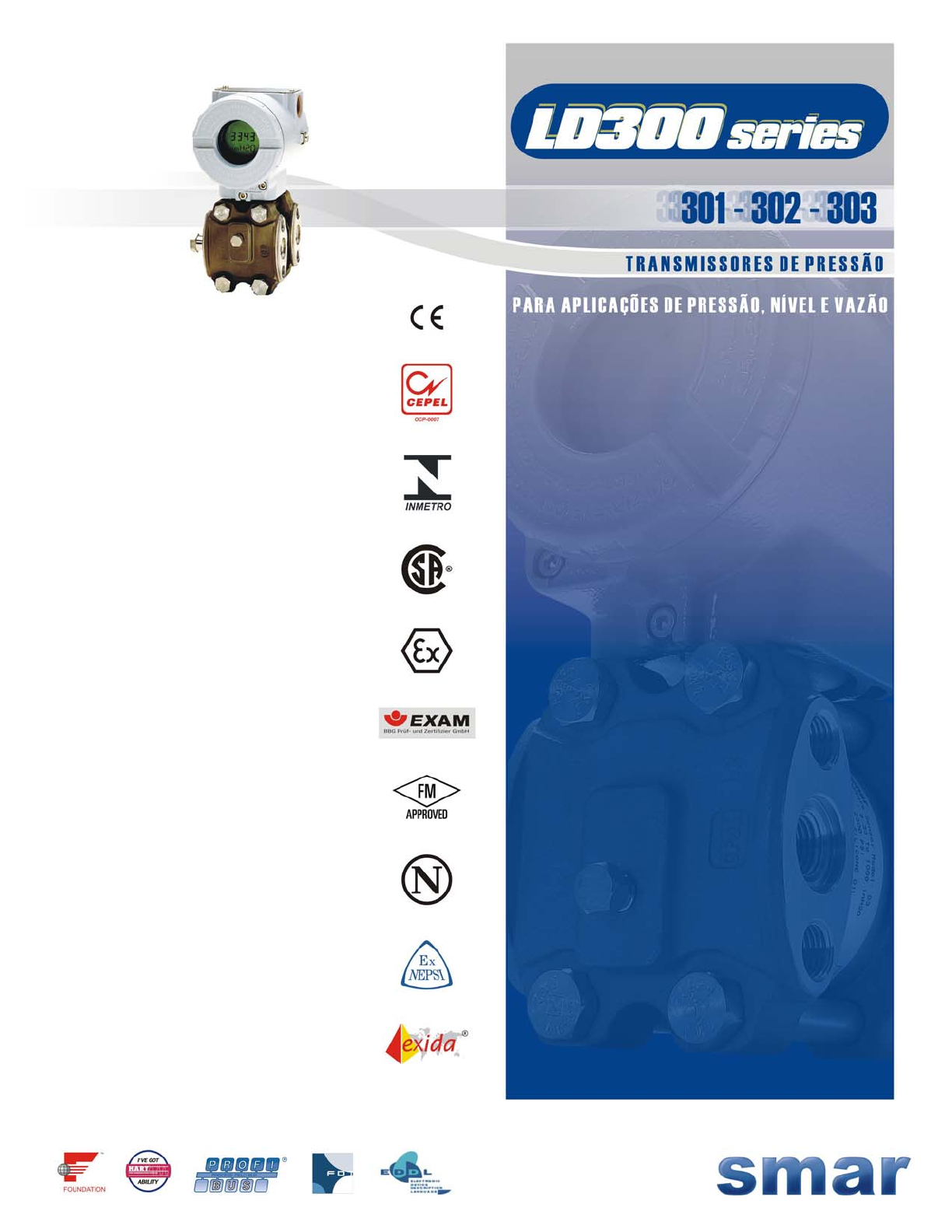 smar • Exatidão de ±0,04% • Estabilidade de ±0,2% do URL - Garantia de 12 Anos • Rangeabilidade de 120:1 • Totalização Não-volátil • Linearização para Tanque • Tempo de Resposta de 100ms • Função de Controle PID • Medição de Vazão Bidirecional • Diagnóstico Avançado • Ampla Biblioteca de Blocos Funcionais • Maior Capacidade de Execução de Blocos Funcionais • Blocos Funcionais Instanciáveis • Suporta DD, EDDL e FDT/DTM • Três Opções de Tecnologia 2 Características Exatidão de ± 0,04%; Estabilidade de ± 0,2% do URL - Garantia de 12 anos; Rangeabilidade de 120:1; Span mín. de 50 Pa (0,2 inH2O) até um limite de faixa de 0 a 40 MPa (0 a 5800 psi); Pressão estática de até 52 MPa (7500 psi); Medição digital direta de capacitância; Zero e Span não interativos; Ajuste local de zero e span; Parametrização e calibração remota; Funções de saída: linear, V x, V x3 e V x5 ; Linearização para tanque; Indicação digital alfanumérica; Leve e compacto; Invólucro à prova de explosão e de tempo (IP67); Intrinsecamente seguro; Simulação de sinal para testes de malha; Totalização persistente; Unidade do usuário configurável; Ajuste local configurável; Compatibilidade eletromagnética de acordo com IEC 61000-6-2:1999, IEC 61000-6-4:1997 e IEC 61326:2002; Proteção da configuração por senha; Três opções de tecnologia: HART®, FOUNDATION fieldbusTM e PROFIBUS PA. Corrente de saída atualizada em 100 ms com 0,75 µA de resolução; Performance melhorada devido ao co-processador matemático dedicado; Modo de operação multidrop; Função de controle PID; Suporta DTM e EDDL; Medição de vazão; Análise de FMEDA e MTBF de 244 anos. 17 tipos diferentes de blocos funcionais para estratégias de controle e diagnósticos avançados; Instanciação de até 20 blocos funcionais; Execução de até 29 links externos; Corrente de consumo de 12 mA; Instanciação dinâmica de blocos; Registrado pela FOUNDATION fieldbusTM e aprovado pela ITK; Habilitado por MVC (Multivariable Container); MTBF de 186 anos. Corrente de consumo de 12mA; Blocos de função para entradas analógicas e totalização; Integração ao Simatic PDM; Suporta DTM e EDDL; Perfil 3.0 facilita intercambiabilidade; MTBF de186 anos. HART® - 4 a 20 mA FOUNDATION fieldbusTM PROFIBUS PA 3 Descrição Funcional Superfície Metalizada (4) Vidro Cerâmica Fluido de Enchimento (3) Diafragma Isolador (2) Diafragma Sensor (1) Aço A Série LD300 oferece: Exatidão de 0,04% para opção de alta performance; Rangeabilidade de 120:1; Leve e compacto; Múltiplas opções de protocolo. A série LD300 utiliza a comprovada técnica de medição de pressão por leitura capacitiva. Um esquema da célula capacitiva é mostrado na figura acima. No centro da célula está o diafragma sensor (1). Este diafragma flexiona-se em função da diferença de pressões aplicadas ao lado direito e esquerdo da célula. Essas pressões são aplicadas diretamente aos diafragmas isoladores (2), os quais fornecem resistência contra corrosão provocada por fluidos de processos. A pressão é diretamente transmitida ao diafragma sensor através do fluido de enchimento (3), provocando a sua deflexão. O diafragma sensor é um eletrodo móvel. As duas superfícies metalizadas (4) são eletrodos fixos. A deflexão do diafragma sensor é percebida através da variação da capacitância entre os dois eletrodos fixos e o móvel. O circuito eletrônico ressonante lê a variação da capacitância entre a placa móvel e a fixa. A CPU condiciona o sinal e comunica de acordo com o protocolo do transmissor. Como não há conversão A/D, os erros e desvios são eliminados durante a conversão. O sensor de temperatura fornece a compensação da temperatura que, combinada com a precisão do sensor de pressão, resulta em uma alta exatidão e rangeabilidade para a Série LD300. A variável de processo, assim como a monitoração e a informação de diagnóstico, são fornecidas através do protocolo de comunicação digital. As opções de protocolos de comunicação disponíveis são: HART®, FOUNDATION fieldbusTM e PROFIBUS PA. Esses protocolos podem ser facilmente modificados substituindo-se a placa eletrônica interna ou fazendo o download do firmware. Trocando-se a placa interna, o transmissor HART® pode se tornar um instrumento FOUNDATION fieldbusTM / PROFIBUS PA e vice-versa. Um instrumento FOUNDATION fieldbusTM pode se tornar um PROFIBUS PA, apenas fazendo o download do firmware do equipamento. Placa PrincipalSensor 4 Transmissores Sanitários Transmissor Diferencial - LD300D e LD300H A medição da pressão diferencial é obtida através da aplicação de pressão aos lados de alta e de baixa do transmissor. Os modelos LD300H foram projetados para trabalhos com altas pressões estáticas. Vazão - LD300D e LD300H A pressão diferencial é gerada por um elemento de vazão primário e a medida da vazão é obtida pela função raíz quadrada. Pressão Absoluta - LD300A A pressão absoluta é aplicada no lado de alta do transmissor e no lado de baixa existe uma câmara de vácuo, que é a referência de zero absoluto para a célula capacitiva. Pressão Manométrica - LD300M A medição da pressão manométrica é obtida através da aplicação da pressão no lado de alta do transmissor e o lado de baixa é aberto à atmosfera, fornecendo, assim, uma referência de pressão atmosférica local. Nível - LD300L O transmissor permite uma conexão flangeada direta em vasos e tanques. Está disponível também com extensão. Para tanque fechado o lado de baixa pode compensar a pressão interna. Tipos de Transmissores O SR301 é um selo remoto projetado para isolação química e térmica da célula capacitiva. A série LD300 pode ser montada com selos tanto em um como em ambos os lados do sensor. Opções de SR301 incluem: flange "T", conexão flush, roscado, sanitário e flangeado com extensão. A conexão flush pe