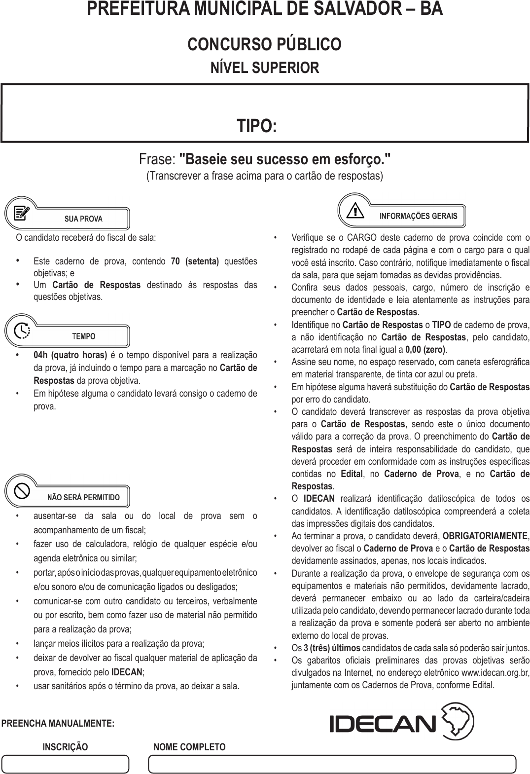 Frase: "Baseie seu sucesso em esforço." (Transcrever a frase acima para o cartão de respostas) • Verifique se o CARGO deste caderno de prova coincide com o registrado no rodapé de cada página e com o cargo para o qual você está inscrito. Caso contrário, notifique imediatamente o fiscal da sala, para que sejam tomadas as devidas providências. • Confira seus dados pessoais, cargo, número de inscrição e documento de identidade e leia atentamente as instruções para preencher o Cartão de Respostas. • Identifique no Cartão de Respostas o TIPO de caderno de prova, a não identificação no Cartão de Respostas, pelo candidato, acarretará em nota final igual a 0,00 (zero). • Assine seu nome, no espaço reservado, com caneta esferográfica em material transparente, de tinta cor azul ou preta. • Em hipótese alguma haverá substituição do Cartão de Respostas por erro do candidato. • O candidato deverá transcrever as respostas da prova objetiva para o Cartão de Respostas, sendo este o único documento válido para a correção da prova. O preenchimento do Cartão de Respostas será de inteira responsabilidade do candidato, que deverá proceder em conformidade com as instruções específicas contidas no Edital, no Caderno de Prova, e no Cartão de Respostas. • O IDECAN realizará identificação datiloscópica de todos os candidatos. A identificação datiloscópica compreenderá a coleta das impressões digitais dos candidatos. • Ao terminar a prova, o candidato deverá, OBRIGATORIAMENTE, devolver ao fiscal o Caderno de Prova e o Cartão de Respostas devidamente assinados, apenas, nos locais indicados. • Durante a realização da prova, o envelope de segurança com os equipamentos e materiais não permitidos, devidamente lacrado, deverá permanecer embaixo ou ao lado da carteira/cadeira utilizada pelo candidato, devendo permanecer lacrado durante toda a realização da prova e somente poderá ser aberto no ambiente externo do local de provas. • Os 3 (três) últimos candidatos de cada sala só poderão sair juntos. • Os gabaritos oficiais preliminares das provas objetivas serão divulgados na Internet, no endereço eletrônico www.idecan.org.br, juntamente com os Cadernos de Prova, conforme Edital. O candidato receberá do fiscal de sala: • Este caderno de prova, contendo 70 (setenta) questões objetivas; e • Um Cartão de Respostas destinado às respostas das questões objetivas. • 04h (quatro horas) é o tempo disponível para a realização da prova, já incluindo o tempo para a marcação no Cartão de Respostas da prova objetiva. • Em hipótese alguma o candidato levará consigo o caderno de prova. • ausentar-se da sala ou do local de prova sem o acompanhamento de um fiscal; • fazer uso de calculadora, relógio de qualquer espécie e/ou agenda eletrônica ou similar; • portar, após o início das provas, qualquer equipamento eletrônico e/ou sonoro e/ou de comunicação ligados ou desligados; • comunicar-se com outro candidato ou terceiros, verbalmente ou por escrito, bem como fazer uso de material não permitido para a realização da prova; • lançar meios ilícitos para a realização da prova; • deixar de devolver ao fiscal qualquer material de aplicação da prova, fornecido pelo IDECAN; • usar sanitários após o término da prova, ao deixar a sala. PREFEITURA MUNICIPAL DE SALVADOR – BA CONCURSO PÚBLICO NÍVEL SUPERIOR PREENCHA MANUALMENTE: INSCRIÇÃO NOME COMPLETO TIPO: 107 - Fisioterapeuta (SMS) B Língua Portuguesa O texto seguinte servirá de base para responder às questões de 1 a 10. Uma em quatro pessoas já vive em países que atingiram pico populacional As estimativas atualizadas da divisão de população das Nações Unidas aumentaram as chances de que o mundo chegue ao pico demográfico ainda neste século, um cenário ainda mais pronunciado de declínio agregado da população mundial. Uma em cada quatro pessoas já vive em países que atingiram o ápice do tamanho de suas populações, como China, Alemanha, Japão e Rússia. O Brasil está no grupo de países que devem atingir seu pico demográfico entre 2024 e 2054 − o bloco inclui, entre outros, Irã, Turquia e Vietnã. A chance de que a humanidade atinja seu pico populacional ainda neste século e, em seguida, entre em um processo gradual de declínio ficou maior: a ONU fala em 80% de chances de que isso ocorra, contra 30% de probabilidade há dez anos. Isso deve ocorrer em meados de 2080, quando seremos 10,3 bilhões. A partir daí, a humanidade deve entrar em declínio demográfico e terminar o século 21 com 10,2 bilhões − 700 milhões a menos do que o estimado há uma década. Os resultados das estimativas divulgados nesta quinta-feira (11) fazem parte das projeções anuais produzidas pela ONU desde 1950, calculadas com base nos censos nacionais e em estatísticas vitais de todos os países, além de centenas de pesquisas amostrais com representatividade nacional. As projeções tratam de informações gerais relativas aos grandes fatores que influenciam tamanho e composição das populações: natalidade, fecundidade, mortalidade, migração, idade média ao ter filhos, entre outros. "O cenário demográfico evoluiu muito nos últimos anos. Em alguns países, a taxa de natalidade agora é ainda mais baixa do que anteriormente previsto, e também estamos vendo declínios ligeiramente mais rápidos em algumas regiões de alta fecundidade", diz Li Junhua, subsecretário-geral de Assuntos Econômicos e Sociais da ONU, em comunicado. Um dos principais fatores foi a fecundidade ainda menor do que a estimada na China, que já vem há décadas em trajetória de redução das taxas de fecundidade e viu seu primeiro declínio populacional em 62 anos em 2022.do servidor, sendo necessária a apresentação de defesa em caso de recomendação de exoneração. (D) A avaliação especial de desempenho, obrigatória e periódica, conforme descrita no art. 
