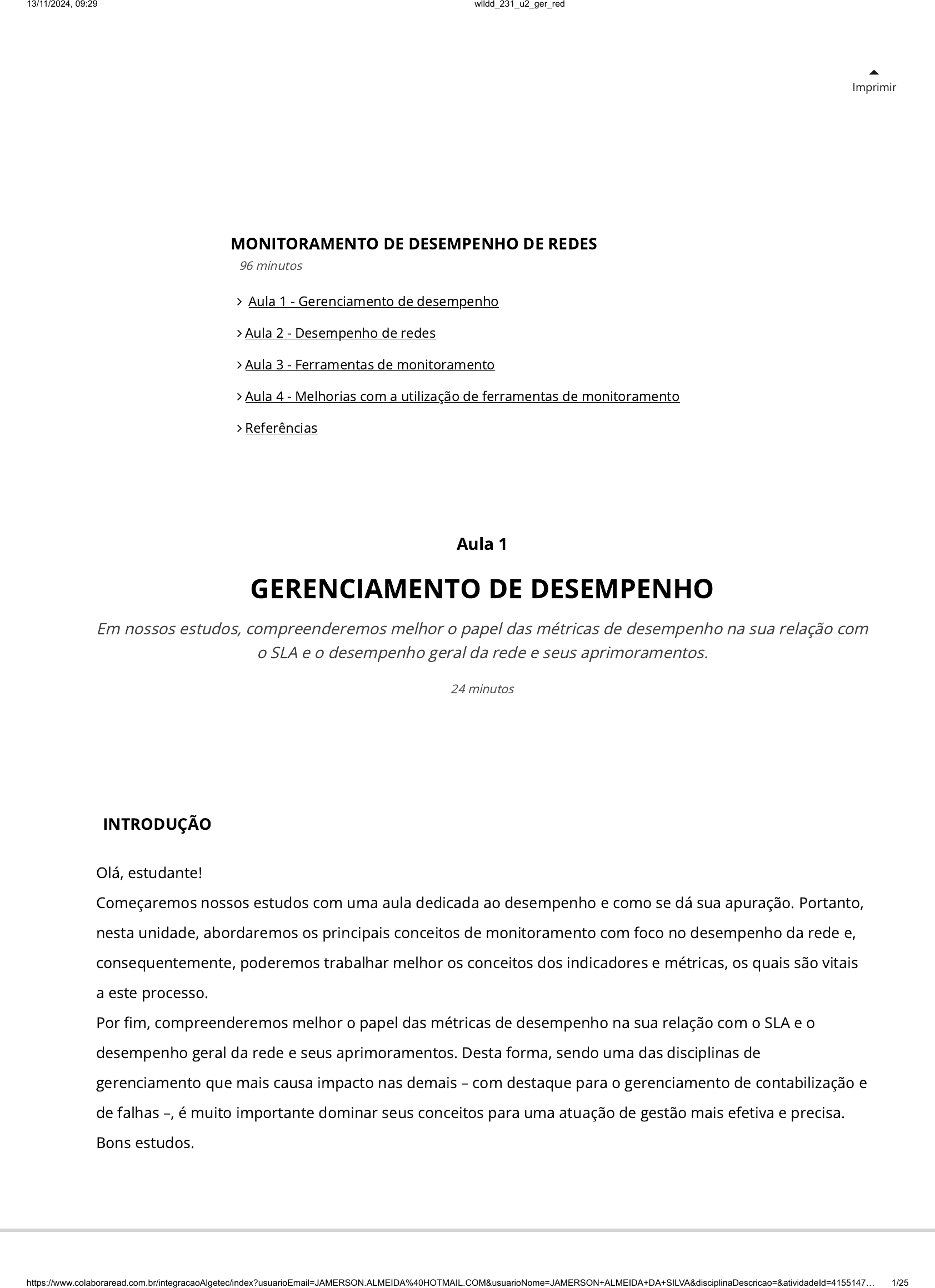 Imprimir INTRODUÇÃO Olá, estudante! Começaremos nossos estudos com uma aula dedicada ao desempenho e como se dá sua apuração. Portanto, nesta unidade, abordaremos os principais conceitos de monitoramento com foco no desempenho da rede e, consequentemente, poderemos trabalhar melhor os conceitos dos indicadores e métricas, os quais são vitais a este processo. Por �m, compreenderemos melhor o papel das métricas de desempenho na sua relação com o SLA e o desempenho geral da rede e seus aprimoramentos. Desta forma, sendo uma das disciplinas de gerenciamento que mais causa impacto nas demais – com destaque para o gerenciamento de contabilização e de falhas –, é muito importante dominar seus conceitos para uma atuação de gestão mais efetiva e precisa. Bons estudos. Aula 1 GERENCIAMENTO DE DESEMPENHO Em nossos estudos, compreenderemos melhor o papel das métricas de desempenho na sua relação com o SLA e o desempenho geral da rede e seus aprimoramentos. 24 minutos MONITORAMENTO DE DESEMPENHO DE REDES Aula 1 - Gerenciamento de desempenho Aula 2 - Desempenho de redes Aula 3 - Ferramentas de monitoramento Aula 4 - Melhorias com a utilização de ferramentas de monitoramento Referências 96 minutos 13/11/2024, 09:29 wlldd_231_u2_ger_red https://www.colaboraread.com.br/integracaoAlgetec/index?usuarioEmail=JAMERSON.ALMEIDA%40HOTMAIL.COM&usuarioNome=JAMERSON+ALMEIDA+DA+SILVA&disciplinaDescricao=&atividadeId=4155147… 1/25 GERENCIAMENTO DE DESEMPENHO Parte do processo de gerenciamento de uma rede de computadores tem relação direta com seu desempenho. O projeto de uma rede é desenhado para atender às necessidades de desempenho, ou seja, diversos requisitos dos sistemas que cada usuário demanda. Portanto, é preciso elencar o hardware certo para tais propósitos. Desta forma, para que a rede entregue e mantenha este desempenho, é desenhado um processo de gestão especí�co. São diversos os fatores que podem trazer o desempenho de uma rede para níveis inaceitáveis, os quais começam a promover a desativação de algum recurso importante, como a própria internet e, até mesmo, a indisponibilidade temporária da própria rede. Desta forma, conforme complementa Forouzan (2007, p. 876 apud ANDREOLI 2016, p. 18), existe uma ligação direta entre o gerenciamento de falhas e o gerenciamento de desempenho, pois, quando este segundo tipo de gerenciamento é negligenciado, causa a possibilidade de existência de erros na rede, além de falhas diversas. Embora, no projeto, a rede seja criada com desempenho su�ciente, a distribuição física dos seus componentes e de seu hardware farão com que existam momentos em que partes desta rede terão uma demanda superior ao que lhe foi alocado, de forma que ocorram lentidões, maiores tempos de resposta e eventos de banda estrangulada pelo uso exagerado por parte de um ou outro host. Com relação aos processos, o gerenciamento de desempenho atua nos recursos de rede para sua aferição e análise, de forma a oferecer à gestão uma série de relatórios que permitirão uma rápida tomada de decisão quanto ao eventual deslocamento de recursos para áreas que tenham problemas por algum motivo. Figura 1 | Fluxo do Gerenciamento do Desempenho 13/11/2024, 09:29 wlldd_231_u2_ger_red https://www.colaboraread.com.br/integracaoAlgetec/index?usuarioEmail=JAMERSON.ALMEIDA%40HOTMAIL.COM&usuarioNome=JAMERSON+ALMEIDA+DA+SILVA&disciplinaDescricao=&atividadeId=4155147… 2/25 Jamerson Almeida Realce Fonte: elaborada pelo autor. O processo de gestão do desempenho depende de vários elementos, como o hardware, sua implementação e uso, mas este processo começa pelo estabelecimento dos objetivos e métricas que serão monitorados e que, somados, geram os indicadores e relatórios, de forma que os objetivos da rede sejam alcançados. Para Souza et al. (2021), os indicadores de desempenho mais comumente utilizados são a largura de banda e a latência. A largura de banda representa quantos bits podem circular pela rede em um determinado período, e a latência informa sobre a quantidade de tempo que um determinado pacote leva para sair do dispositivo que o envia até seu receptor. Neste tipo de gerenciamento, existe um termo muito utilizado: “threshold”, pois é necessário que sejam de�nidos valores aceitáveis, mínimos e máximos, que devem ativar alertas, pois sua ocorrência (por exemplo: uma latência muito alta) pode ocasionar falhas na comunicação e na resposta de diversas aplicações. Desta forma, podemos de�nir três modelos distintos para o monitoramento dos recursos de uma rede, conforme Reis Júnior (2012): Modelo de Utilização: monitora recursos de forma instantânea. Modelo de Taxa de Rejeição: monitora as rejeições dos pedidos de serviço. Modelo de Taxa de Pedido de Recursos: monitora os pedidos por uso de recursos e deve ser utilizado como forma de: Apoio na detecção de falhas. Auxílio na determinação das alterações de con�guração da rede. 13/11/2024, 09:29 wlldd_231_u2_ger_red https://www.colaboraread.com.br/integracaoAlgetec/index?usuarioEmail=JAMERSON.ALMEIDA%40HOTMAIL.COM&usuarioNome=JAMERSON+ALMEIDA+DA+SILVA&disciplinaDescricao=&atividadeId=4155147… 3/25 Jamerson Almeida Realce Jamerson Almeida Realce Jamerson Almeida Realce Jamerson Almeida Realce Jamerson Almeida Realce Jamerson Almeida Realce Apoio na detecção de falhas. Auxílio na determinação das alterações de con�guração da rede. Desta forma, devemos pensar no gerenciamento de desempenho como o componente do gerenciamento geral da rede capaz de oferecer a segurança de que seus recursos estarão sempre su�cientes e que as ocorrências, como o alcance do limite da disponibilidade de recursos, sejam tratadas com agilidade. DADOS DE DESEMPENHO E QUALIDADE Cada componente da rede é escolhido dentro de um projeto pelas suas especi�cações. Desta forma, existem informações, como sua con�guração e capacidade, que farão parte