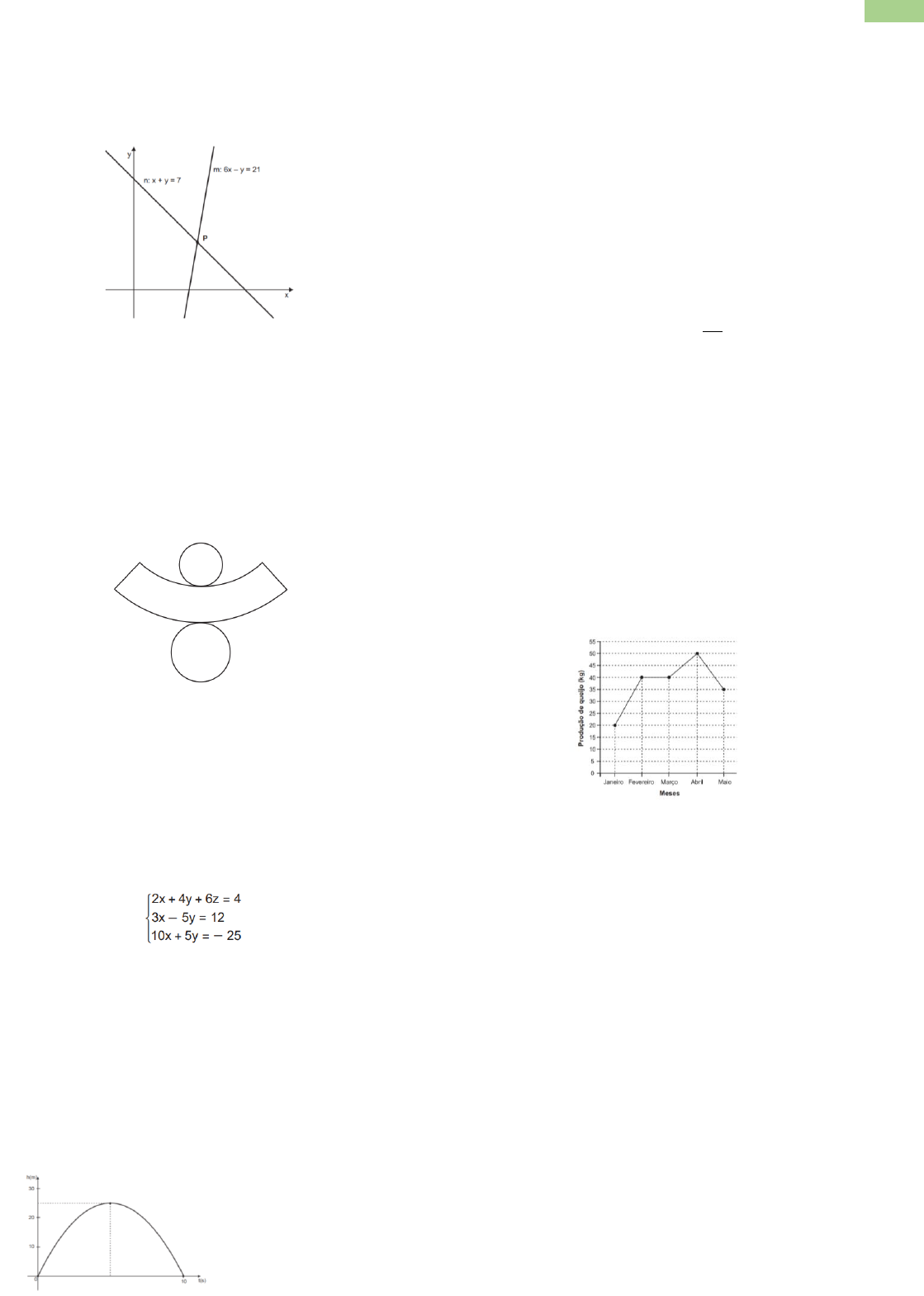 1 Estudo Dirigido – Matemática 𝑺𝑨𝑬𝑷𝑬 − 𝟐𝟎𝟏𝟔 1. No plano cartesiano abaixo estão representadas as retas 𝑚 e 𝑛 e suas respectivas equações. As coordenadas do ponto P, intersecção dessas retas, são: a) (1, 1) b) (4, 3) c) (5, −2) d) (7, 0) e) (6, −1) 2. Observe abaixo a planificação de um sólido geométrico. Essa planificação corresponde a qual sólido geométrico? a) Cilindro b) Cone c) Pirâmide d) Tronco de cone e) Tronco de pirâmide 3. Observe o sistema linear abaixo. Qual é a solução desse sistema? a) (2, 4, 6) b) (-1, -3, 3) c) (15, 24, 6) d) (4, 12, -25) e) (13, 65, 390) 4. Uma pedra é atirada para cima e sua altura (h), em metros, é descrita pelo gráfico abaixo, que está em função do tempo t, dado em segundos. Qual foi o instante em que essa pedra atingiu a altura máxima? a) 25 s b) 20 s c) 10 s d) 5 s e) 4 s 5. Em uma experiência em um laboratório, uma população de ratazanas apresentou um crescimento exponencial por um determinado período. Durante esse tempo, o número de ratazanas podia ser calculado por meio da função 𝑁(𝑡) = 9 . 3 4𝑡 300, onde 𝑡 é o tempo dado em dias. Ao final desse período, a população de ratazanas era de 27 indivíduos. Por quanto tempo essa população de ratazanas apresentou esse crescimento exponencial? a) 10 dias b) 27 dias c) 75 dias d) 150 dias e) 375 dias 6. No gráfico abaixo está representada a produção de queijo em uma fazenda nos cinco primeiros meses de um ano. De acordo com esse gráfico, a produção de queijo nessa fazenda diminuiu no período de: a) Janeiro a fevereiro b) Fevereiro a março c) Março a abril d) Abril a maio e) Fevereiro a abril 7. Em um jantar, Ana acendeu uma vela decorativa de 10 cm de altura na mesa e observou que, passados 36 minutos, a medida da altura dessa vela era 4 cm. Considerando que a queima dessa vela tem o mesmo ritmo do início até o final, o tempo total que essa vela permanecerá acesa sem nenhuma intervenção será de: a) 60 minutos b) 90 minutos c) 134 minutos d) 144 minutos e) 360 minutos 2 Estudo Dirigido – Matemática 8. O desenho abaixo é formado por dois círculos concêntricos. Qual é a medida da área da parte colorida de cinza? a) 34𝜋 𝑐𝑚² b) 25𝜋 𝑐𝑚² c) 21𝜋 𝑐𝑚² d) 16𝜋 𝑐𝑚² e) 13𝜋 𝑐𝑚² 9. O gráfico que representa a função exponencial definida por 𝑦 = 2𝑥 − 1, com 𝑥 ∈ ℝ, é: 10. Um concurso teve a participação de 800 candidatos. Desses candidatos, 320 eram mulheres. A porcentagem de mulheres que participou desse concurso foi: a) 80% b) 48% c) 40% d) 32% e) 20% 11. No logotipo de uma competição náutica ilustrado abaixo, o triângulo retângulo EFG representa a vela de um barco, sendo EF = 5 m, EG = 3 m e EM o comprimento do barco, que coincide com o diâmetro da circunferência. A medida do comprimento aproximado desse barco é: a) 3,9 m b) 4 m c) 5,8 m d) 8 m e) 8,3 m 12. Ana desenhou o polígono de vértices L, M, N e P no plano cartesiano abaixo. Os pares ordenados que representam os pontos L, M, N e P, nessa ordem, são: 13. O dono de um estacionamento calcula o valor V, em reais, que seus clientes pagam em função do tempo t, em minutos, para utilizar o estacionamento, através da expressão 𝑉 = 0,1 . 𝑡 . Devido ao horário de funcionamento do estabelecimento, 𝑡 varia de 0 a 480 minutos. O gráfico que representa o valor V, em função do tempo 𝑡, em minutos, é: 3 Estudo Dirigido – Matemática 14. A função polinomial do 1° grau 𝑓: ℝ → ℝ possui coeficientes angular e linear igual a 2. A representação gráfica dessa função 𝑓é: 15. Júlia iniciou um programa de exercícios físicos no primeiro dia de agosto de 2015 e perdeu 200 gramas ao final do primeiro mês. A cada mês subsequente, ela perdeu 300 gramas a mais que a quantidade perdida no mês anterior. Ela seguiu esse programa até conseguir perder 2 000 gramas durante um mês. Dessa forma, em qual mês Júlia perdeu 2 000 gramas? a) novembro de 2015 b) janeiro de 2016 c) fevereiro de 2016 d) abril de 2016 e) maio de 2016 16. As raízes de um polinômio 𝑞(𝑥) de terceiro grau são −3, −1 𝑒 2. A expressão que pode representar a forma fatorada desse polinômio é: 17. Alberto realizou um mergulho no mar, onde a pressão P, em Pascal, varia linearmente de acordo com a profundidade x, em metros. Ao nível do mar, antes de mergulhar, a pressão exercida em Alberto era de 100 000 Pascal e, ao alcançar uma profundidade de 10 metros, a pressão passou a ser 200 000 Pascal. Qual é o gráfico que representa a pressão P, exercida em Alberto em função da profundidade x nesse mergulho? 18. Um técnico agrícola recebe mensalmente um salário fixo de R$ 500,00, mais R$ 20,00 por hora extra trabalhada. Quanto recebeu esse técnico no mês em que fez 15 horas extras? a) R$ 500,00 b) R$ 520,00 c) R$ 535,00 d) R$ 600,00 e) R$ 800,00 19. A equação que representa uma circunferência é: 20. Em um projeto social, 500 crianças foram cadastradas para praticarem vôlei, futebol ou essas duas modalidades esportivas. Para o vôlei, foram cadastradas 200 crianças; 400 foram cadastradas para o futebol e 100 optaram pelas duas modalidades. Entre todas essas crianças, uma foi sorteada e ganhou um uniforme completo para o treino. Sabendo que a criança sorteada está cadastrada no vôlei, qual é a probabilidade de ela também estar cadastrada no futebol? a) 1 5 b) 1 6 c) 3 5 d) 1 2 e) 6 5 21. Observe a reta no plano cartesiano abaixo. Essa reta pode ser representada por uma equação da forma 𝑦 = 𝑝𝑥 + 𝑞. 4 Estudo Dirigido – Matemática Os valores de 𝑝 e 𝑞, nessa ordem, são: a) 0 e 1 b) 1 e 0 c) 1 e 1 d) 0 e 45 e) 45 e 0 22. No gráfico abaixo, está representada a função 𝑓: ℝ → ℝ, definida por 𝑓(𝑥) = 3𝑥 e sua inversa. A função inversa de 𝑓(𝑥) = 3𝑥 representada no gráfico por 𝑓−1(𝑥) = 𝑦 é: 23. Um