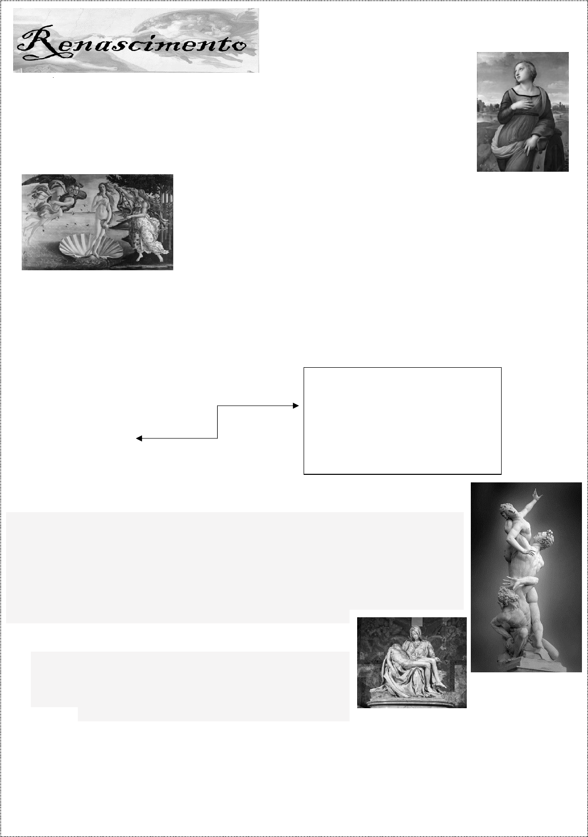 O movimento artístico que chamamos “Renascimento” nasceu na Itália, em Florença, nas primeiras décadas do século XV. Nos finais de 1400, tinha-se espalhado por toda a Itália. Na primeira metade do século seguinte, quando Roma se sobrepunha a Florença como principal centro artístico, tinha alcançado os resultados mais clássicos. Diferentemente da arte medieval, o renascimento artístico esteve inspirado na antiguidade clássica, ou seja, nas artes greco-romana, que haviam sido esquecidas durante séculos. Para os artistas do renascimento, o contexto associado ao período medieval impossibilitou a evolução da arte em diversos aspectos. Isso porque, o medievo esteve intimamente relacionado a uma cultura religiosa, donde o teocentrismo (Deus no centro do Universo) regia a vida das pessoas. Foi a partir do avanço científico, social e cultural que surge o movimento do renascimento, o qual foi marcado sobretudo pelo caráter humanista. A grande contribuição da arte renascentista foi a descoberta da perspectiva e da profundidade. Assim, do plano reto e bidimensional da arte medieval, a arte da renascença promoveu um outro olhar. Outros aspectos, não menos importantes, explorados pelos artistas do renascimento, foram o equilíbrio das formas e a busca da harmonia, fundamentadas na arte clássica. Vale lembrar que o renascimento artístico incluiu a evolução da pintura, escultura, arquitetura e literatura, valorizando aspectos humanos e da natureza. Ainda que muitos temas explorados pelos artistas do renascimento estejam associados ao plano religioso e espiritual, a mudança de mentalidade da época proporcionou incluir uma variedade de temáticas. Os assuntos abordados variavam desde os costumes, a mitologia, as paisagens, dentre outros. Características gerais: Racionalidade; Dignidade do Ser Humano; Rigor Científico; Ideal Humanista; Reutilização das artes greco-romana. Escultura A escultura no Renascimento tomou como base e modelo as obras da antiguidade clássica e a sua mitologia, com uma nova visão do pensamento humanista e da função da escultura na arte. Como na escultura grega, procurou-se a representação naturalista do corpo humano nu com uma técnica aperfeiçoada, graças ao estudo meticuloso da anatomia humana. A escultura do Renascimento usou todo tipo de materiais, principalmente do mármore, bronze e madeira. O bronze competiu com o mármore, principalmente em monumentos funerários, fontes e pequenas esculturas para decoração de interiores, assim como em estátuas equestres. Características gerais: Buscavam representar o homem tal como ele é na realidade; Proporção da figura mantendo a sua relação com a realidade; Profundidade e perspectiva; Estudo do corpo e do caráter humano. Principais artistas: Leonardo da Vinci, Sandro Botticelli, Rafael Sanzio, Donatello, Ticiano, Michelangelo e Andrea del Verrocchio. O humanismo foi um movimento que marcou o modo de pensar do ser humano, que a partir daí, começaram a se importar com coisas diferentes além do teocentrismo. Como o foco era o valor do ser humano, ele teve destaque com as produções artísticas em massa, como fundamento a valorização do ser humano. A escultura no Renascimento tomou como base e modelo as obras da antiguidade clássica e a sua mitologia, com uma nova visão do pensamento humanista e da função da escultura na arte. Como na escultura grega, procurou-se a representação naturalista do c... A escultura do Renascimento usou todo tipo de materiais, principalmente do mármore, bronze e madeira. O bronze competiu com o mármore, principalmente em monumentos funerários, fontes e pequenas esculturas para decoração de interiores, assim como em es... Buscavam representar o homem tal como ele é na realidade; Proporção da figura mantendo a sua relação com a realidade; Profundidade e perspectiva; Estudo do corpo e do caráter humano.