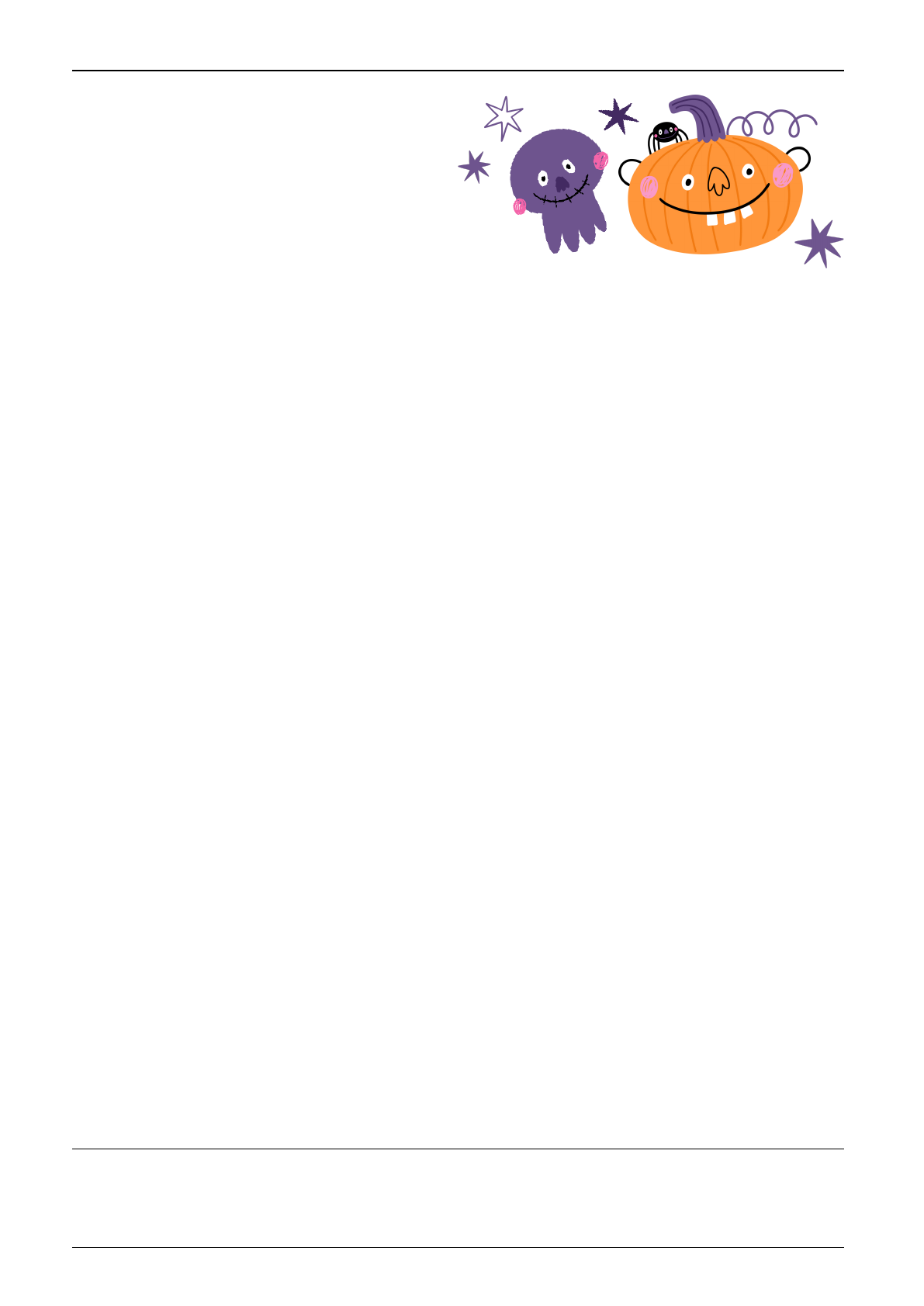 Read the text and pay attention to details and important facts about Halloween. Read the sentences carefully and and decide wether they are true or false Answer the following questions using information from the text 1. 2. 5. 1. 2. 3. 4. HALLOWEEN READING COMPREHENSION Halloween started with the Celts over 2,000 years ago. True/False True/False True/False True/False True/False Halloween is celebrated on December 31st. People wear costumes to scare away ghosts on Halloween. Jack-o’-lanterns are made from apples. What do children say when they want candy on Halloween? (O que as crianças dizem quando querem doces no Halloween?) Name two Halloween activities people enjoy today. (Cite duas atividades de Halloween que as pessoas gostam hoje.) Samhain was the name of the festival that inspired Halloween. Halloween is celebrated every year on October 31st, but did you know it started a long time ago? Halloween comes from an ancient festival called Samhain celebrated by the Celts over 2,000 years ago in what is now Ireland and the UK. They believed that on this day, the spirits of the dead could visit the living. To keep the spirits happy, people would light bonfires and wear costumes made from animal skins to scare away ghosts. Today, Halloween is a fun holiday where people like to dress up in costumes and go trick-or-treating. Children walk from house to house, knock on doors, and say "Trick or Treat!" to get candy from their neighbors. Many people carve faces into pumpkins to make jack-o'-lanterns. They scoop out the seeds, carve a face, and put a candle inside to make it glow. Houses are often decorated with spooky things like ghosts, skeletons, and spiders. Some people even visit haunted houses for a fun scare! On Halloween night, people like to tell scary stories, watch spooky movies, and play games. It's a time to have fun with friends, dress up, and enjoy some delicious treats! Name: Date:Grade: 1- Where is Thanksgiving celebrated? (onde é celebrada o dia de Ação de Graças) 2- When is Thanksgiving celebrated in the United States? (Quando é celebrada nos EUA) 3- What are some common dishes people eat on Thanksgiving?( pratos típicos) 4- What are the other activities people do on Thanksgiving?(outras atividades) 5- What does Thanksgiving remind people to do? O que Ação de Graças lembra as pessoas de fazer? 6- What do you like to do on Thanksgiving? (o que te agrada na ação de graças?) Read the text and answer the questions below. Thanksgiving is a special holiday celebrated in the United States and Canada. It is a day to give thanks for all the good things in life, like family, friends, and food. In the United States, Thanksgiving is celebrated on the fourth Thursday in November, while in Canada, it is on the second Monday in October. On Thanksgiving Day, families and friends come together for a big meal. They usually eat turkey, mashed potatoes, stuffing, and pumpkin pie. Many people also watch parades and football games on this day. Some people volunteer to help those in need by serving food in their communities or donating to local food banks. Thanksgiving is not only about food. It is also a time to be grateful and think about all the things we have. This holiday reminds everyone to be kind, help others, and appreciate what they have. THANKSGIVING READING COMPREHENSION