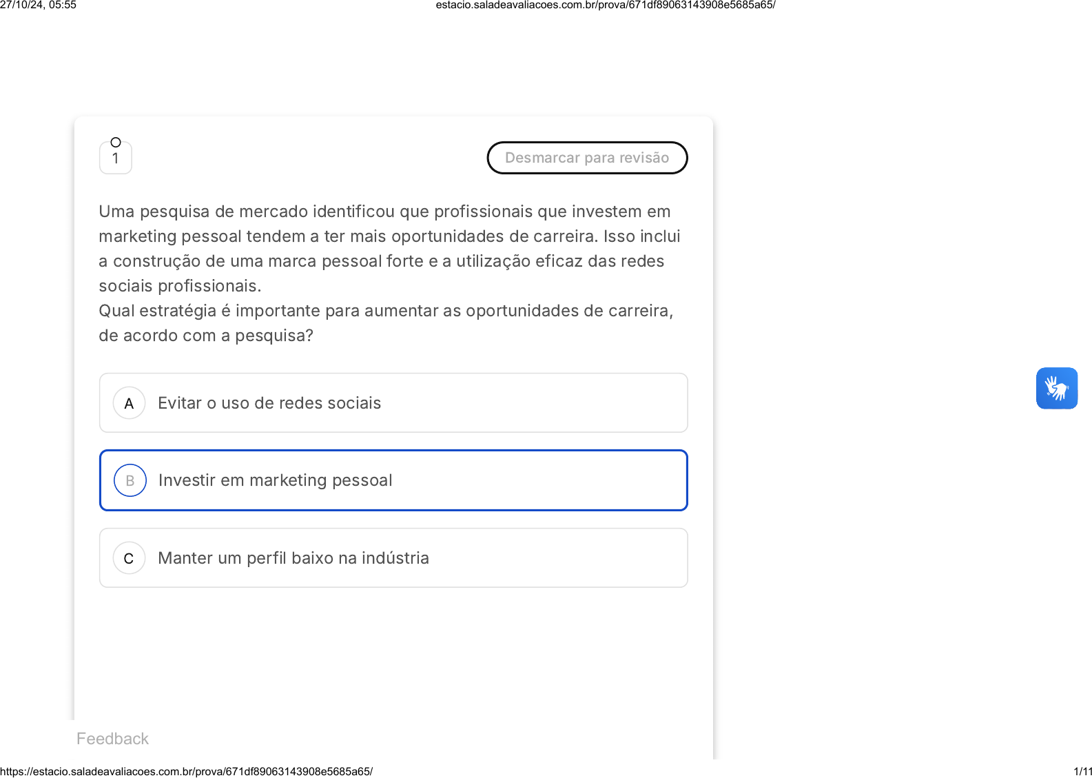 A B C 1 Desmarcar para revisão Uma pesquisa de mercado identificou que profissionais que investem em marketing pessoal tendem a ter mais oportunidades de carreira. Isso inclui a construção de uma marca pessoal forte e a utilização eficaz das redes sociais profissionais. Qual estratégia é importante para aumentar as oportunidades de carreira, de acordo com a pesquisa? Evitar o uso de redes sociais Investir em marketing pessoal Manter um perfil baixo na indústria Feedback 27/10/24, 05:55 estacio.saladeavaliacoes.com.br/prova/671df89063143908e5685a65/ https://estacio.saladeavaliacoes.com.br/prova/671df89063143908e5685a65/ 1/11 D E A B C Focar exclusivamente em habilidades técnicas Evitar a construção de uma marca pessoal 2 Desmarcar para revisão O marketing pessoal engloba um conjunto de atitudes e ações associadas ao conhecimento, às habilidades e às competências que contribuem para o sucesso e para o alcance dos objetivos pessoais e profissionais. Dentre as opções abaixo, assinale a opção que não contribui para a construção de uma imagem positiva ao profissional de escritório: Ser gentil, educado e simpático somente com as pessoas do seu convívio social; Demonstrar postura proativa; Desempenhar um trabalho de qualidade; 27/10/24, 05:55 estacio.saladeavaliacoes.com.br/prova/671df89063143908e5685a65/ https://estacio.saladeavaliacoes.com.br/prova/671df89063143908e5685a65/ 2/11 D E A B C Ter conhecimento sobre o negócio da empresa; Ser pontual; 3 Desmarcar para revisão Um estudo recente mostrou que profissionais que compreendem as demandas do mercado e se adaptam a elas têm mais chances de avançar em suas carreiras. Isso inclui a capacidade de prever tendências de mercado e de desenvolver habilidades relevantes. Qual habilidade é essencial para o avanço na carreira, conforme o estudo? Ignorar as tendências de mercado Focar apenas em habilidades antigas Compreensão e adaptação às demandas do mercado 27/10/24, 05:55 estacio.saladeavaliacoes.com.br/prova/671df89063143908e5685a65/ https://estacio.saladeavaliacoes.com.br/prova/671df89063143908e5685a65/ 3/11 D E A B C Evitar o desenvolvimento de novas habilidades Concentração exclusiva em habilidades acadêmicas 4 Desmarcar para revisão Em uma empresa de tecnologia, a equipe de RH observou que os funcionários mais bem-sucedidos são aqueles que demonstram adaptabilidade e aprendizado contínuo. Isso reflete a importância de se adaptar às mudanças tecnológicas rápidas no mercado de trabalho atual. Qual característica é crucial para o sucesso profissional no mercado de trabalho atual, segundo o estudo de caso? Especialização em uma única habilidade técnica Foco em habilidades de comunicação interpessoal Capacidade de adaptação e aprendizado contínuo 27/10/24, 05:55 estacio.saladeavaliacoes.com.br/prova/671df89063143908e5685a65/ https://estacio.saladeavaliacoes.com.br/prova/671df89063143908e5685a65/ 4/11 D E A B C Priorização de metas de curto prazo Ênfase em experiência profissional anterior 5 Desmarcar para revisão O Modelo VRIO tem como principal função indicar se determinado recurso ou capacidade é vantajoso de ser explorado. Na área de RH, digamos que você desenvolveu um processo de treinamento para gerentes que aumentou a produtividade da organização em 50%, sendo um sucesso em toda a empresa, sendo considerado pelo setor de estratégia um recurso valioso, raro, difícil de imitar e que está sendo explorado pela organização. A seguir defina qual o tipo de vantagem/desvantagem competitiva desse treinamento: Desvantagem Competitiva Paridade Competitiva Temporária Vantagem Competitiva Temporária 27/10/24, 05:55 estacio.saladeavaliacoes.com.br/prova/671df89063143908e5685a65/ https://estacio.saladeavaliacoes.com.br/prova/671df89063143908e5685a65/ 5/11 D E A B Vantagem Competitiva Sustentável Vantagem Competitiva indeterminada 6 Desmarcar para revisão Luiz está acompanhando certo gerente para avaliação de possíveis fontes de recrutamento para a empresa. A empresa cresceu nos últimos anos e o volume de trabalho alcançou o máximo da capacidade produtiva e de atendimento que a atual estrutura suporta. Esse gerente está pensando em anunciar as novas vagas de emprego em jornal, agência especializada em recrutamento e também na internet, em sites e redes sociais. Desse modo, é correto afirmar que Luiz está auxiliando o gerente a selecionar meios e canais de comunicação para: Divulgar os novos serviços da empresa. Encontrar novos fornecedores de materiais e produtos. 27/10/24, 05:55 estacio.saladeavaliacoes.com.br/prova/671df89063143908e5685a65/ https://estacio.saladeavaliacoes.com.br/prova/671df89063143908e5685a65/ 6/11 C D E A B Atrair candidatos para a nova realidade da empresa e novas vagas de emprego. Selecionar as mídias de maior alcance e de valor mais acessível para a criação do site da empresa. Buscar novos clientes para a empresa. 7 Desmarcar para revisão Aos Recursos Humanos Estratégico foram atribuídas novas atividades, entre elas a administração da transformação e mudança. Essa etapa consiste em gerenciar a mudança na organização, realizando todas suas etapas, desde o planejamento até sua implementação. Sobre gestão da mudança, assinale a alternativa que melhor justifica sua implementação na organização Mercado pouco competitivo Fazer a Reengenharia 27/10/24, 05:55 estacio.saladeavaliacoes.com.br/prova/671df89063143908e5685a65/ https://estacio.saladeavaliacoes.com.br/prova/671df89063143908e5685a65/ 7/11 C D E A B Responder ao ambiente mutável Defender interesses institucionais Aumentar o Lucro 8 Desmarcar para revisão Na empresa XPTO foi desenvolvido, pela área de RH, um complexo sistema de avaliação de desempenho, com a função de melhorar o processo de mensuração do desempenho dos funcionários. Esse recurso foi considerado valioso para a organização, já que é pouco utilizado em empresas do seu ramo, sendo um diferen