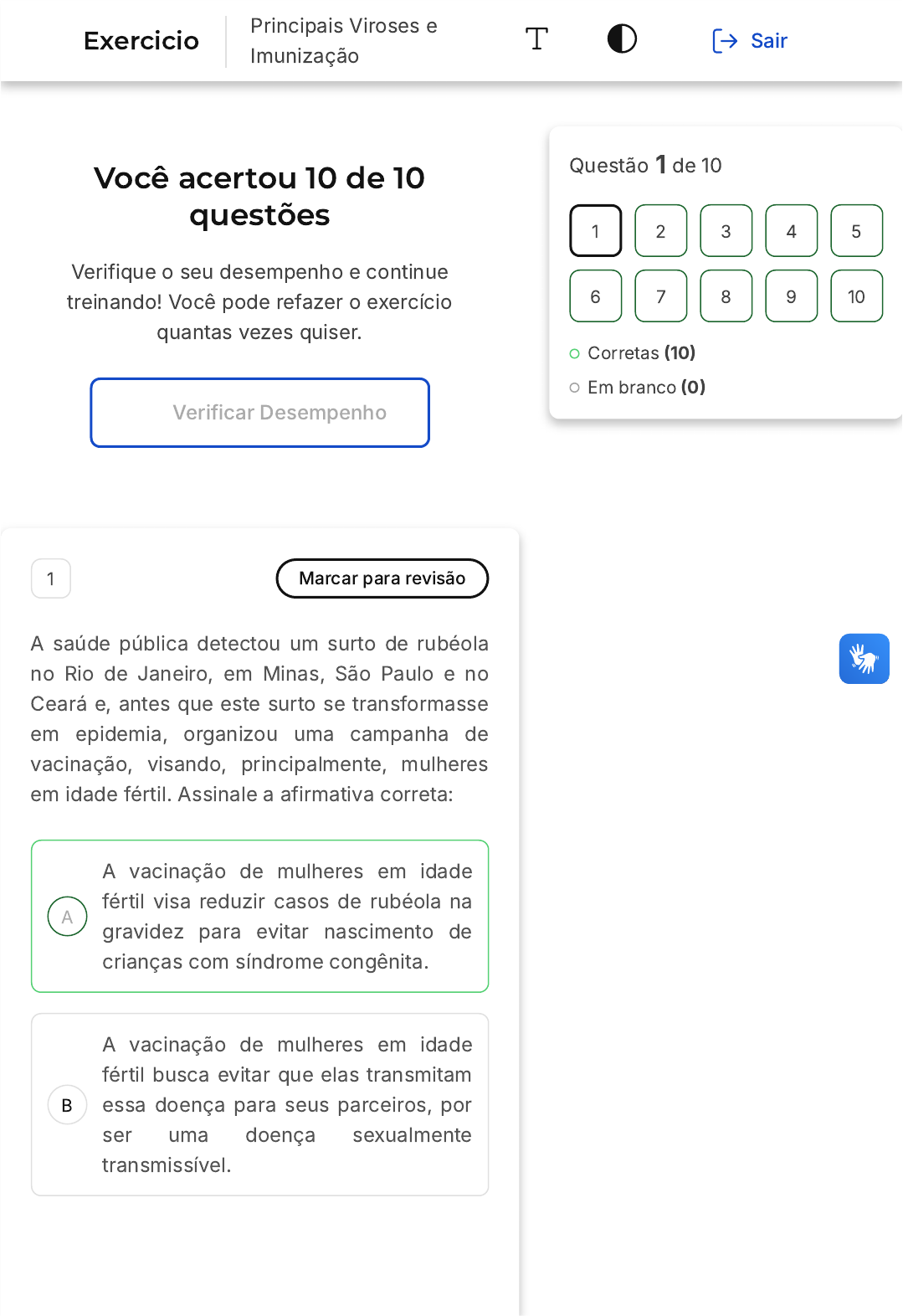 Você acertou 10 de 10 questões Verifique o seu desempenho e continue treinando! Você pode refazer o exercício quantas vezes quiser. Verificar Desempenho A B 1 Marcar para revisão A saúde pública detectou um surto de rubéola no Rio de Janeiro, em Minas, São Paulo e no Ceará e, antes que este surto se transformasse em epidemia, organizou uma campanha de vacinação, visando, principalmente, mulheres em idade fértil. Assinale a afirmativa correta: A vacinação de mulheres em idade fértil visa reduzir casos de rubéola na gravidez para evitar nascimento de crianças com síndrome congênita. A vacinação de mulheres em idade fértil busca evitar que elas transmitam essa doença para seus parceiros, por ser uma doença sexualmente transmissível. Questão 1 de 10 Corretas �10� Em branco �0� 1 2 3 4 5 6 7 8 9 10 Exercicio Principais Viroses e Imunização Sair C D E O governo, ao investigar a situação vacinal, notou que as mulheres em idade fértil não são vacinadas nunca. Não há motivos para a vacinação em massa de mulheres em idade fértil. A rubéola é uma doença grave que causa a síndrome de Guillain-Barré em mulheres em idade fértil. Resposta correta Parabéns, você selecionou a alternativa correta. Confira o gabarito comentado! Gabarito Comentado A resposta correta é: A vacinação de mulheres em idade fértil visa reduzir casos de rubéola na gravidez para evitar nascimento de crianças com síndrome congênita. A rubéola é uma doença infecciosa causada por um vírus que pode ser transmitido de pessoa para pessoa através do contato com secreções respiratórias, como gotículas de saliva ou espirro. A doença é mais comum em crianças, mas também pode afetar adultos. A rubéola é geralmente uma doença leve, mas pode causar complicações graves, como a síndrome da rubéola congênita, se uma mulher grávida for infectada. A síndrome da rubéola congênita é uma doença que pode causar problemas de saúde graves em bebês, como problemas cardíacos, problemas de visão e surdez. A vacinação contra a rubéola é a melhor maneira de prevenir a doença e suas complicações. A A B C D E vacinação é recomendada para todas as crianças a partir dos 12 meses de idade. As mulheres em idade fértil também devem ser vacinadas, especialmente se não tiverem certeza se foram vacinadas anteriormente. A vacinação contra a rubéola é segura e eficaz. 2 Marcar para revisão A transmissão de algumas doenças virais ocorre por meio da picada da fêmea do mosquito infectado, sendo ele o vetor da doença. Os vírus que são transmitidos por artrópodes, como, por exemplo, o mosquito, são chamados de arbovírus. Assinale a opção que contém somente as arboviroses. Hepatite A, rubéola, influenza e dengue. Malária, sarampo, zika e chikungunya. Febre amarela, dengue, zika e chikungunya. Varicela-zóoster, HPV, hepatite C e caxumba. Esquistossomose, West Nile Virus, vírus Rocio e sarampo. Resposta correta Parabéns, você selecionou a alternativa correta. Confira o A B C gabarito comentado! Gabarito Comentado A alternativa correta lista as doenças Febre amarela, dengue, zika e chikungunya. Todas essas doenças são arboviroses, ou seja, são transmitidas por artrópodes, neste caso, mosquitos. As demais alternativas listam doenças que não são todas transmitidas por artrópodes, portanto, não são todas arboviroses. 3 Marcar para revisão A vacina tetraviral foi introduzida em 2013 no Calendário Básico de Vacinação da Criança e entra em substituição à segunda dose da já conhecida tríplice viral. A novidade é que a criança vacinada com a tetraviral também está protegida contra a catapora. A respeito da vacina tríplice viral, marca a alternativa correta: Indicadas para gestantes, para proteção das doenças virais. Vacina produzida de vírus inativado. Protege do vírus do sarampo, da caxumba, rubéola e catapora. D E Protege do vírus do sarampo, da caxumba e rubéola. A partir dos 30 anos não é preciso mais doses. Resposta correta Parabéns, você selecionou a alternativa correta. Confira o gabarito comentado! Gabarito Comentado Protege do vírus do sarampo, da caxumba e rubéola. Essas vacinas são contraindicadas para mulheres durante a gravidez, por serem feitas com vírus atenuado. Se até os 29 anos tomou apenas uma dose da vacina, é necessário tomar mais uma dose. Se tiver entre 30 e 59 anos, é preciso apenas uma dose. 4 Marcar para revisão O sarampo é uma doença viral exantemática aguda, pertencente à família Paramyxoviridae, e altamente contagiosa. Em relação ao sarampo, podemos afirmar que: A B C D E A infecção por sarampo não gera imunidade para toda a vida, por isso é impossível o desenvolvimento de vacina. Para o tratamento do sarampo, é muito utilizado o antiviral Tamiflu, que é administrado não só para o paciente, mas também para os parentes próximos. O sarampo é uma doença transmitida por água e alimentos contaminados. O indivíduo infectado sintomático pode apresentar febre, tosse, coriza, conjuntivite, manchas de Koplik e exantema maculopapular eritematoso. O sarampo pode causar síndrome congênita quando ocorre na gravidez. Resposta correta Parabéns, você selecionou a alternativa correta. Confira o gabarito comentado! Gabarito Comentado O sarampo é uma doença viral exantemática aguda, pertencente à família Paramyxoviridae, e altamente contagiosa. Os sintomas do sarampo incluem febre, tosse, coriza, conjuntivite, manchas de Koplik e exantema maculopapular eritematoso. O sarampo é uma doença grave e pode levar à morte. A vacina contra A B C D E o sarampo é segura e eficaz e deve ser administrada a todas as crianças. 5 Marcar para revisão O Papilomavírus humano �HPV) é um vírus que pertencente à família Papillomaviridae. Existem mais de 100 diferentes tipos de HPVs, sendo os genótipos mais frequentes classificados como alto risco e baixo risco. Qual é a forma de 