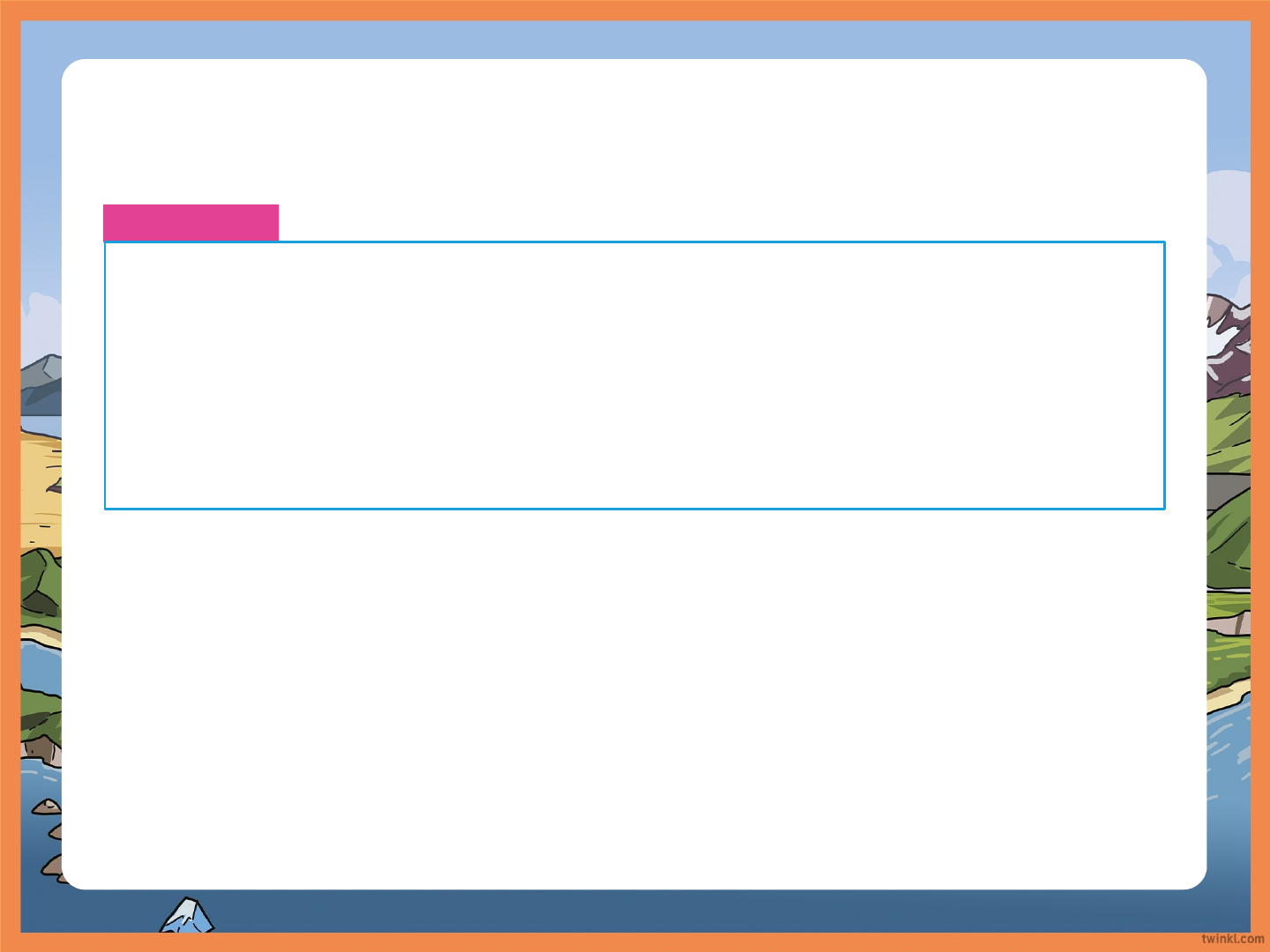 Aviso de responsabilidade Animações Esperamos que as informações em nosso site e recursos sejam úteis. Este recurso foi projetado com animações em cada slide para torná-lo o mais divertido e envolvente possível. Para visualizar o conteúdo na formatação correta, veja a apresentação de slides no 'modo de apresentação'. Se você visualizar os slides sem selecionar o 'modo de apresentação', poderá descobrir que alguns textos e imagens se sobrepõem ou são difíceis de ler. Critérios de sucesso: Objetivo: Aprender sobre os diferentes tipos de formações terrestres Eu posso definir diferentes formações terrestres e nomear formações no meu país, estado ou área local. Converse com os seus colegas! Pense: O que é um relevo? O que é um relevo? Os relevos geralmente ocorrem acima do nível do mar, mas algumas podem se formar abaixo do oceano. Os relevos são formações terrestres com características naturais que podem ser encontradas na superfície da Terra. Muitas delas são criadas por forças naturais, como o mar ou o vento. O que é um relevo? Existem muitos tipos diferentes de relevo. Quantos você consegue lembrar? Qualquer formação menor que 300 metros é conhecido como colina. Montanhas são partes da superfície da Terra que se elevam 300 metros ou mais acima do nível do mar. Elas frequentemente têm encostas muito íngremes e uma superfície rochosa. Montanhas Vales são áreas baixas que são encontradas entre montanhas ou colinas. Muitas vezes há um riacho ou um rio correndo através de um vale. Vales Um cânion é semelhante a um vale, mas geralmente é mais profundo e tem lados mais estreitos. A maioria dos cânions tende a se formar após muitos anos de rios cortando camadas de rocha. Cânions Planícies são áreas de terra planas que têm poucas inclinações, colinas ou outros tipos de formações terrestres. Elas são frequentemente encontradas em regiões de baixa altitudes e próximas do nível do mar. Planícies Um planalto é uma planície que está elevada em relação à área ao redor. Planaltos têm penhascos muito íngremes ao longo de suas bordas. Planaltos Desertos são áreas de terra onde há pouca água. Como resultado, há poucos animais e plantas na região. Sem plantas para sustentar o solo, o vento erosiona a terra, criando dunas de areia. Desertos Pense em um lugar que você conhece bem: pode ser qualquer lugar do Brasil, seu estado ou sua área local. Quais relevos você pode encontrar lá? Encontrando Relevos image2.jpg image5.jpeg image6.jpeg image7.jpg image8.jpeg image9.jpeg image10.jpg image11.jpeg image12.jpg image13.tiff image4.jpg image1.jpg
