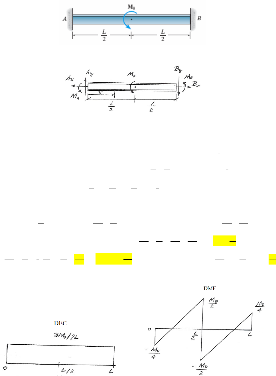 Deflexão em Vigas e Eixos Resolução: Steven Róger Duarte 822 *12.120. Determine as reações ao momento nos apoios A e B; a seguir, trace os diagramas de força cortante e momento fletor. EI é constante. Figura 12.120 ∑ ; [1] ∑ ; [2] ∑ ; ( ) ( ) Condições de contorno: para x = 0 ; v = 0 e Para x = L; [3] ; Para x = L; [4] Igualando as equações [3] e [4], obtemos: . / ; ; . / Deflexão em Vigas e Eixos Resolução: Steven Róger Duarte 823 12.7 – PROBLEMAS 12.121. Determine as reações nos apoios A e B. EI é constante. Figura 12.121 ∑ ; . / . / ∑ ; ; ∑ ; ; ; ; 12.122. Determine as reações nos apoios de mancal A, B e C do eixo; a seguir, trace os diagramas de força cortante e momento fletor. EI é constante. Cada mancal exerce somente reações verticais sobre o eixo. Figura 12.122 Deflexão em Vigas e Eixos Resolução: Steven Róger Duarte 824 ∑ ; ∑ ; ( ) ( ) ; ( ) . / ; Deflexão em Vigas e Eixos Resolução: Steven Róger Duarte 825 12.123. A viga e a haste de aço A-36 são usadas para suportar a carga de 40 kN. Se for exigido que a tensão normal admissível para o aço seja e a deflexão máxima não ultrapasse 1,25 mm, determine o menor diâmetro da haste a ser usado. A viga é retangular, com 125 mm de altura e 75 mm de espessura. Figura 12.123 ( )( ) ( * , sabendo que: = 125 MPa, logo: ( )( ) ( * F = 36,03 kN ( )( ) ; ( )( ) ( * = 24,4 MPa