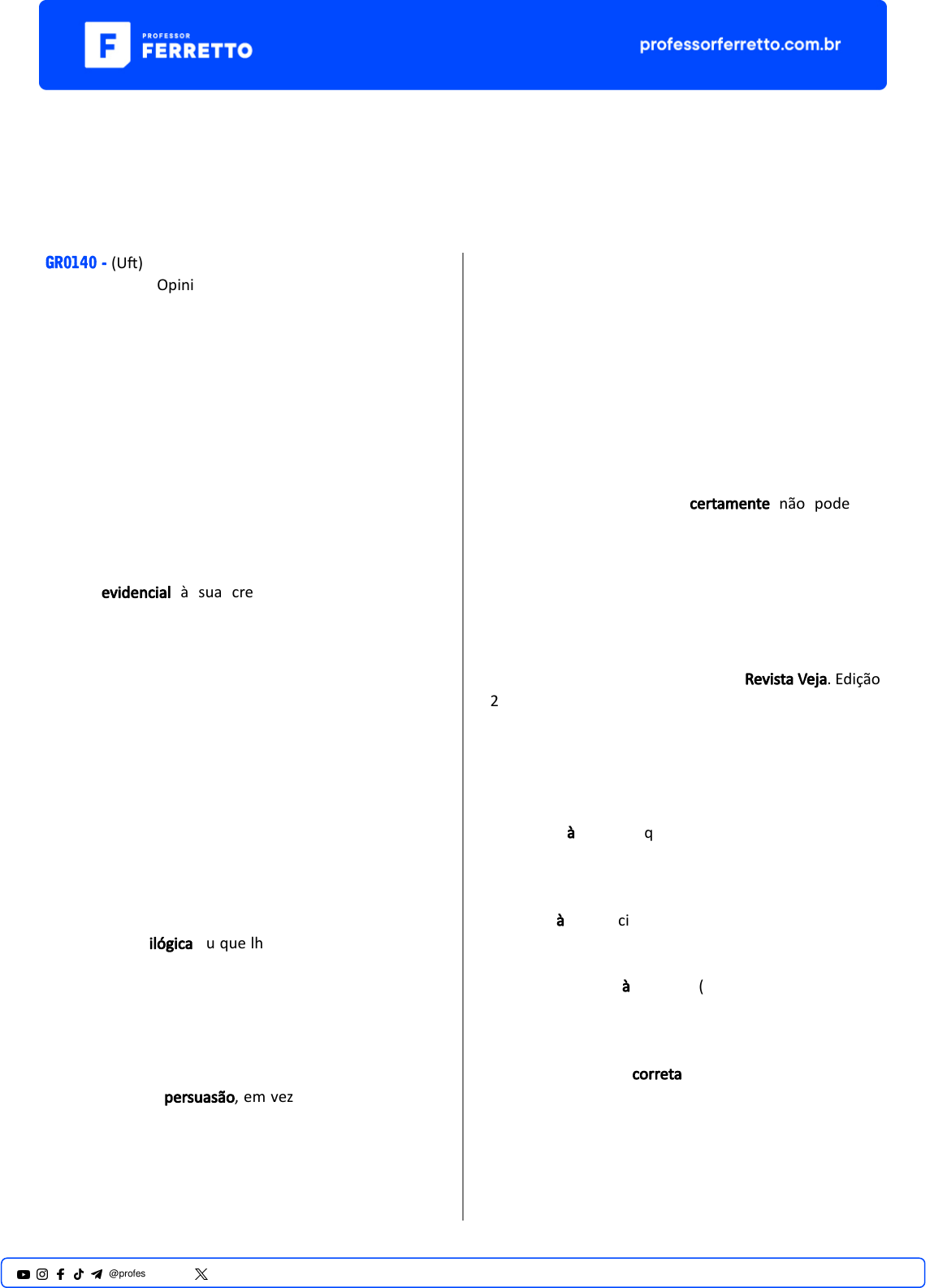 Não respondidas Vestibulares Regência e Crase GR0140 - (U�) Opinião não é argumento Aqui está uma história que pode ser verdadeira no contexto atual do Brasil. Um jovem professor de Filosofia, instruindo seus alunos à Filosofia da Religião, introduz, à maneira que a Filosofia opera há séculos, argumentos favoráveis e contrários à existência de Deus. Um dos alunos se queixa, para o diretor e também nas onipresentes redes sociais, de que suas crenças religiosas estão sendo atacadas. “Eu tenho direito às minhas crenças”. O diretor concorda com o aluno e força o professor a desis�r de ensinar Filosofia da Religião. Mas o que é exatamente um “direito às minhas crenças"? [...] O direito à crença, nesse caso, poderia ser visto como o “direito evidencial”. Alguém tem um direito evidencial à sua crença se es�ver disposto a fornecer evidências apropriadas em apoio a ela. Mas o que o estudante e o diretor estão reivindicando e promovendo não parece ser esse direito, pois isso implicaria precisamente a necessidade de pôr as evidencias à prova. Parece que o estudante está reivindicando outra coisa, um certo ”direito moral” à sua crença, como avaliado pelo filósofo americano Joel Feinberg, que trabalhou temas da É�ca, Teoria da Ação e Filosofia Polí�ca. O estudante está afirmando que tem o direito moral de acreditar no que quiser, mesmo em crenças falsas. Muitas pessoas acham que, se têm um direito moral a uma crença, todo mundo tem o dever de não as privar dessa crença, o que envolve não cri�cá-la, não mostrar que é ilógica ou que lhe falta apoio evidencial. O problema é que essa é uma maneira cada vez mais comum de pensar sobre o direito de acreditar. E as grandes perdedoras são a liberdade de expressão e a democracia. [...] A defesa de uma crença está restrita ao uso de métodos que pertence ao espaço das razões — argumentação e persuasão, em vez de força. Você tem o direito de avançar sua crença na arena pública usando os mesmos métodos de que seus oponentes dispõem para dissuadi-lo. O pior acontece quando crenças se materializam em opinião, e são usadas como subs�tutas de argumentos, quando o “Eu tenho direito às minhas crenças” se transforma em ”Eu tenho direito à minha opinião”. Crenças e opiniões não são argumentos. Mais precisamente, crenças diferem de opinião, que diferem de fatos, que diferem de argumentos. Um fato é algo que pode ser comprovado verdadeiro. Por exemplo, é um fato que Júpiter é o maior planeta do sistema solar tanto em diâmetro quanto em massa. Esse fato pode ser provado pela observação ou pela consulta a uma fonte fidedigna. Uma crença é uma ideia ou convicção que alguém aceita como verdade, como ”passar debaixo de uma escada dá azar”. Isso certamente não pode ser provado (ou pelo menos nunca foi). Mas a pessoa ainda pode manter sua crença, como vimos, se não pelo ”direito evidencial”, apelando para o “direito moral”. Ou ainda, pelo mesmo ”direito moral”, deixar de acreditar no que ela própria pensa ser evidência, como no caso do famoso dito (atribuído a Sancho Pança): “Não creio em bruxas, ainda que existam”. [...] CARNIELLI, Walter. Página Aberta. In: Revista Veja. Edição 2578, ano 51, nº 16. São Paulo: Editora Abril, 2018, p. 64 (fragmento adaptado). Quanto à u�lização de indica�vos de crase, analise as afirma�vas. I- Em: “[...] à maneira que a filosofia opera há séculos” (1º parágrafo), a crase é de uso faculta�vo, pois “a maneira” indica locução verbal II- Em: “[...] argumentos favoráveis e contrários à existência de Deus” (1º parágrafo), a crase é faculta�va, pois há contração da preposição “a” com o ar�go feminino “a”. III- Em: “O direito à crença” (2º parágrafo), a crase é obrigatória, devido à contração da preposição “a” com o ar�go feminino “a”. Assinale a alterna�va correta. 1@professorferretto @prof_ferretto a) Apenas a afirma�va I está correta. b) Apenas as afirma�vas I e II estão corretas. c) Apenas a afirma�va III está correta. d) Todas as afirma�vas estão corretas. GR0136 - (Fgv) Convivas de boa memória Há dessas reminiscências que não descansam antes que a pena ou a língua as publique. Um an�go dizia arrenegar de conviva que tem boa memória. A vida é cheia de tais convivas, e eu sou acaso um deles, conquanto a prova de ter a memória fraca seja exatamente não me acudir agora o nome de tal an�go; mas era um an�go, e basta. Não, não, a minha memória não é boa. Ao contrário, é comparável a alguém que �vesse vivido por hospedarias, sem guardar delas nem caras nem nomes, e somente raras circunstâncias. A quem passe a vida na mesma casa de família, com os seus eternos móveis e costumes, pessoas e afeições, é que se lhe grava tudo pela con�nuidade e repe�ção. Como eu invejo os que não esqueceram a cor das primeiras calças que ves�ram! Eu não a�no com a das que enfiei ontem. Juro só que não eram amarelas porque execro essa cor; mas isso mesmo pode ser olvido e confusão. E antes seja olvido que confusão; explico-me. Nada se emenda bem nos livros confusos, mas tudo se pode meter nos livros omissos. Eu, quando leio algum desta outra casta, não me aflijo nunca. O que faço, em chegando ao fim, é cerrar os olhos e evocar todas as coisas que não achei nele. Quantas ideias finas me acodem então! Que de reflexões profundas! Os rios, as montanhas, as igrejas que não vi nas folhas lidas, todos me aparecem agora com as suas águas, as suas árvores, os seus altares, e os generais sacam das espadas que �nham ficado na bainha, e os clarins soltam as notas que dormiam no metal, e tudo marcha com uma alma imprevista. É que tudo se acha fora de um livro falho, leitor amigo. Assim preencho as lacunas alheias; assim podes também preencher as minhas. (Assis, de Machad