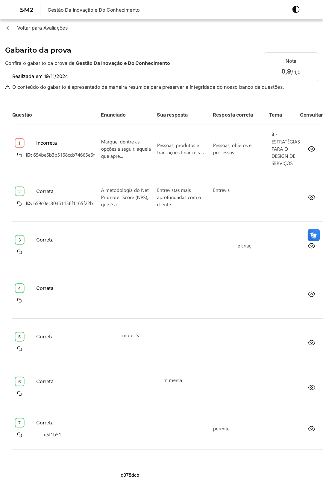 Voltar para Avaliações Gabarito da prova Confira o gabarito da prova de Gestão Da Inovação e Do Conhecimento Realizada em 19/11/2024 Nota 0,9/ 1,0 O conteúdo do gabarito é apresentado de maneira resumida para preservar a integridade do nosso banco de questões. Questão Enunciado Sua resposta Resposta correta Tema Consultar Incorreta ID: 654be5b3b5168ccb74665e6f Marque, dentre as opções a seguir, aquela que apre... Pessoas, produtos e transações financeiras. Pessoas, objetos e processos. 3 - ESTRATÉGIAS PARA O DESIGN DE SERVIÇOS Correta ID: 659c0ec30351156f1165f22b A metodologia do Net Promoter Score (NPS), que é a... Entrevistas mais aprofundadas com o cliente. ... Entrevistas mais aprofundadas com o cliente. ... 3 - ESTRATÉGIAS PARA O DESIGN DE SERVIÇOS Correta ID: 654be5b3b5168ccb74665ebd Dentre as opções a seguir, indique aquela que apre... Exploração e criação. Exploração e criação. 3 - ESTRATÉGIAS PARA O DESIGN DE SERVIÇOS Correta ID: 654be5b3b5168ccb74665eab Há uma startup brasileira que revolucionou o merca... Nubank. Nubank. 3 - ESTRATÉGIAS PARA O DESIGN DE SERVIÇOS Correta ID: 659c0ec30351156f1165f189 O Net Promoter Score (NPS) é uma metodologia ampla... 75 75 3 - ESTRATÉGIAS PARA O DESIGN DE SERVIÇOS Correta ID: 654be5f1b5168ccb7466c283 Assinale a alternativa correta sobre o mecanismo d... É um mercado de dois lados, pois atende quem quer ... É um mercado de dois lados, pois atende quem quer ... 4 - CANVAS (Business Model Canvas) Correta ID: 654be5f1b5168ccb7466c2d1 Sobre o modelo de negócios conhecido como franquia... É um modelo que permite rápido crescimento. É um modelo que permite rápido crescimento. 4 - CANVAS (Business Model Canvas) 1 2 3 4 5 6 7 SM2 Gestão Da Inovação e Do Conhecimento Feedback 20/11/2024, 11:49 estacio.saladeavaliacoes.com.br/prova/673ced747fd078dcb9ab7f65/gabarito/reduzido/ https://estacio.saladeavaliacoes.com.br/prova/673ced747fd078dcb9ab7f65/gabarito/reduzido/ 1/2 https://estacio.saladeavaliacoes.com.br/avaliacoes/ Correta ID: 654be5f1b5168ccb7466c2e3 Sobre a relação entre cultura, estratégia e ferram... Ao se definir a estratégia, ela não toma corpo ime... Ao se definir a estratégia, ela não toma corpo ime... 4 - CANVAS (Business Model Canvas) Correta ID: 654be5f1b5168ccb7466c2d7 Sobre o modelo de negócios isca e anzol, aponte a ... O principal risco é um competidor oferecer o compl... O principal risco é um competidor oferecer o compl... 4 - CANVAS (Business Model Canvas) Correta ID: 654be5f1b5168ccb7466c277 Indique a alternativa com a melhor definição de mo... A forma como uma organização cria, distribui e cap... A forma como uma organização cria, distribui e cap... 4 - CANVAS (Business Model Canvas) 8 9 10 Encontrou algum problema? Você pode copiar o ID da questão e abrir um requerimento. Na tela inicial do Campus Virtual �SIA�, acesse "Atendimento > Requerimento > Novo > Currículo/Aula/horário > Analisar ambiente de avaliação/exercícios" 20/11/2024, 11:49 estacio.saladeavaliacoes.com.br/prova/673ced747fd078dcb9ab7f65/gabarito/reduzido/ https://estacio.saladeavaliacoes.com.br/prova/673ced747fd078dcb9ab7f65/gabarito/reduzido/ 2/2