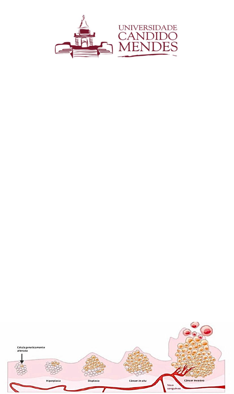 Células Cancerígenas Crescimento Celular As células normais que formam os tecidos do corpo humano são capazes de se multiplicar por meio de um processo contínuo que é natural. A maioria das células normais cresce, multiplica-se e morre de maneira ordenada, porém nem todas as células normais são iguais, algumas nunca se dividem e outras dividem-se de forma rápida e contínua. Dessa forma, a proliferação celular não implica necessariamente a presença e malignidade, podendo simplesmente responder a necessidades específicas do corpo. Crescimento desordenado de células O crescimento das células cancerígenas é diferente das células normais, em vez de morrerem, continuam crescendo incontrolavelmente, formando outras novas células anormais. Diversos organismos vivos podem apresentar em algum momento da vida anormalidades no crescimento celular. As células se dividem de forma rápida, agressiva e incontrolável, espalhando-se para outras regiões do corpo e acarretando transtornos funcionais. O câncer é um desses transtornos. Formação do Câncer O câncer é causado por alterações da estrutura genética (DNA) das células, as chamadas mutações. Cada célula sadia possui instruções e como devem proceder, ou seja, como crescer e se dividir, o período de funcionamento e sua morte. Na presença de qualquer erro nestas instruções pode surgir uma célula alterada que venha a se tornar cancerosa. Processo de Carcinogênese Em geral, o processo de carcinogênese (formação de câncer), ocorre lentamente, podendo levar vários anos para que uma célula cancerígena se prolifere e dê origem a um tumor visível. Esse processo é composto por três estágios: Estágio de Iniciação: É o primeiro estágio da carcinogênese. Nele, as células sofrem o efeito dos agentes cancerígenos que provocam modificações em alguns de seus genes. Nesta fase, as células se encontram geneticamente alteradas, porém, clinicamente, ainda não é possível se detectar um tumor. Estágio de Promoção: Nessa etapa, as células geneticamente alteradas sofrem o efeito dos agentes cancerígenos, classificados como oncopromotores. A célula “iniciada” é transformada em célula maligna de forma lenta e gradual. Para que ocorra essa transformação, é necessário um longo e contínuo contato com o agente cancerígeno promotor. A suspensão do contato com agentes promotores muitas vezes interrompe o processo nesse estágio. Estágio de Progressão: É o terceiro e último estágio e se caracteriza pela multiplicação descontrolada e irreversível das células alteradas. Nessa fase, o câncer está deflagrado e evoluindo até o surgimento das primeiras manifestações clínicas da doença. OBS: Os fatores que promovem a iniciação ou progressão da carcinogênese são chamados agentes oncoaceleradores ou carcinógenos. O fumo, por exemplo, é um agente carcinógeno completo, pois possui componentes que atuam nos três estágios da carcinogênese. Câncer invasivo No câncer invasivo, as células cancerosas invadem outras camadas celulares do órgão, ganham a corrente sanguínea ou linfática e têm a capacidade de se disseminar para outras partes do corpo. Essa capacidade de invasão e disseminação que os tumores malignos apresentam de produzir outros tumores, em outras partes do corpo, a partir de um já existente, é a principal característica do câncer. Esses novos focos de doença são chamados de metástases. Causas do Câncer As causas do câncer são variadas, podendo ser externas ou internas ao organismo, estando ambas relacionadas. Causas Externas: As causas externas, como substâncias químicas, irradiação, vírus e fatores comportamentais, estão relacionadas ao meio ambiente, ou seja, constituem os fatores de risco ambientais. De todos os casos de câncer, 80% a 90% estão associados a fatores ambientais. Alguns desses fatores são bem conhecidos, como: O cigarro que pode causar câncer de pulmão; O uso de bebidas alcoólicas pode causas câncer de boca, osofaringe, laringe, esôfago e fígado; A exposição excessiva ao sol pode causar câncer de pele; alguns vírus também podem causar câncer (exemplo: leucemia, câncer do colo do útero e câncer de fígado). Existem outros fatores causais de câncer que ainda estão sendo estudados. Alguns componentes dos alimentos que ingerimos são motivo de diversos estudos que vêm sendo realizados, mas existem outros fatores causais que são ainda completamente desconhecidos. O envelhecimento natural do ser humano traz mudanças nas células, que aumentam a sua suscetibilidade à transformação maligna. Isso, somado ao fato de as células das pessoas idosas terem sido expostas por mais tempo aos diferentes fatores de risco para o câncer, explica, em parte, o porquê de o câncer ser mais frequente nessa fase da vida. Causas Internas: As causas internas, como os hormônios, condições imunológicas e mutações genéticas são, na maioria das vezes geneticamente predeterminadas e estão ligadas à capacidade do organismo de se defender das agressões externas. Apesas de o fator genético exercer um importante papel na formação dos tumores (carcinogênese), são raros os casos de câncer que se devem exclusivamente a fatores hereditários, familiares e étnicos. Alguns tipos de câncer, como, por exemplo, os cânceres de mama, estômago e intestino, parecem ter um forte componente familiar, embora não se possa afastar a hipótese de exposição dos membros da família a uma causa comum. Principais formas de tratamento As principais metas do tratamento são: cura, prolongamento da vida útil e melhora da qualidade de vida. Existem tratamentos curativos para um terço dos casos de câncer, particularmente para os cânceres de mama, colo do útero, cavidade oral e cólon, quando são detectados precocemente e tratados de acordo com as melhores práticas clínicas. Existem três formas principais de tratamento do câncer: q