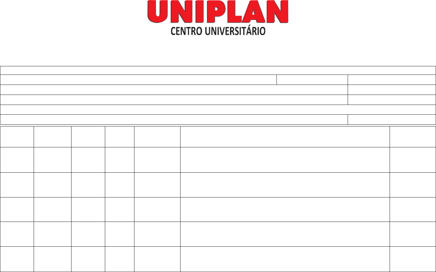 FICHA-MEIO DE ESTÁGIO SUPERVISIONADO “IN LOCO” Instituição: CENTRO UNIVERSITÁRIO PLANALTO DO DISTRITO FEDERAL - UNIPLAN Curso: Bacharelado em Educação Física Semestre: 5° Ano:2024 Aluno (a): Kacia de Souza Reis Matrícula:UL21105853 Supervisor (a) Orientador (a) do Estágio (IES): William Santos Pereira CREF: 007221-G/MA Concedente: Rancho Fitness Eireli Supervisor (a) de Campo: Leandro Salazar Costa Lima CREF: 006770-G/MA DATA ENTRADA SAÍDA HORAS DISCIPLINAS DESCRIÇÃO SUMÁRIA DA ATIVIDADE ASS. DO ALUNO(A) _________________________________________________________________________ _________________________________________________________________________ Supervisor Estágio/CONCEDENTE (Ass. E Carimbo/CREF) Prof. Orientador de Estágio/UNIPLAN (Ass. e Carimbo/CREF)