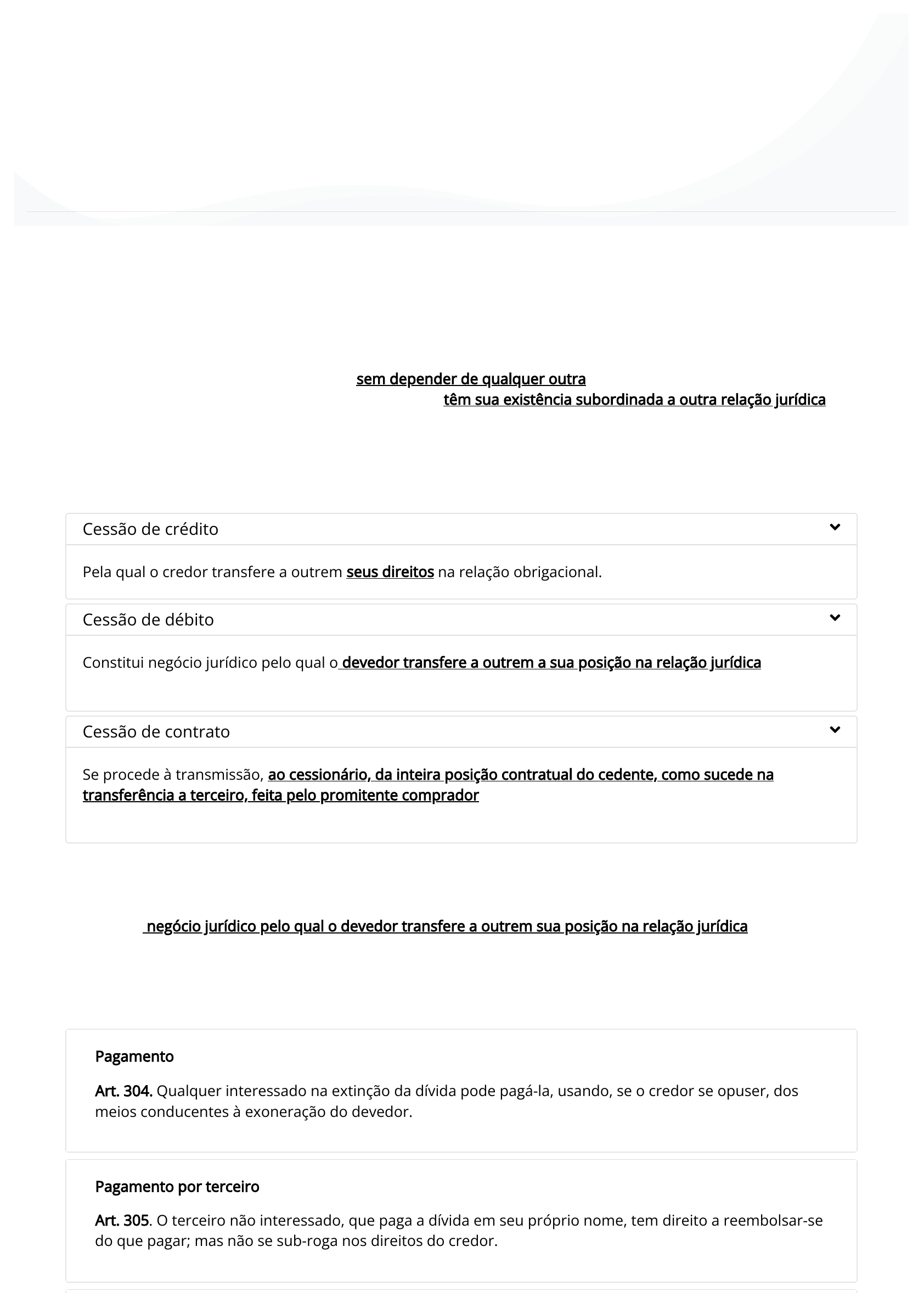 Nesta webaula será apresentado algumas características sobre dívidas e pagamento. Dependência das obrigações Obrigações principais e acessórias As obrigações principais subsistem por si, sem depender de qualquer outra, como a de entregar a coisa, no contrato de compra e venda. As obrigações acessórias têm sua existência subordinada a outra relação jurídica, ou seja, dependem da obrigação principal. Transmissão das obrigações As obrigações podem ser transmitidas através das cessões: Cessão de crédito Pela qual o credor transfere a outrem seus direitos na relação obrigacional. Cessão de débito Constitui negócio jurídico pelo qual o devedor transfere a outrem a sua posição na relação jurídica, sem novar, ou seja, sem acarretar a criação de obrigação nova e a extinção da anterior. Cessão de contrato Se procede à transmissão, ao cessionário, da inteira posição contratual do cedente, como sucede na transferência a terceiro, feita pelo promitente comprador, por exemplo, de sua posição no compromisso de compra e venda de imóvel loteado, sem anuência do credor. Assunção da dívida Trata-se de negócio jurídico pelo qual o devedor transfere a outrem sua posição na relação jurídica. Pagamento Vamos conhecer algumas características sobre o pagamento. Pagamento Art. 304. Qualquer interessado na extinção da dívida pode pagá-la, usando, se o credor se opuser, dos meios conducentes à exoneração do devedor. Pagamento por terceiro Art. 305. O terceiro não interessado, que paga a dívida em seu próprio nome, tem direito a reembolsar-se do que pagar; mas não se sub-roga nos direitos do credor. Direito civil Transmissão das obrigações Você sabia que seu material didático é interativo e multimídia? Isso signi�ca que você pode interagir com o conteúdo de diversas formas, a qualquer hora e lugar. Na versão impressa, porém, alguns conteúdos interativos �cam desabilitados. Por essa razão, �que atento: sempre que possível, opte pela versão digital. Bons estudos! Pagamento por terceiro antes do vencimento Se o terceiro pagar antes de vencida a dívida, só terá direito ao reembolso no vencimento. Pagamento em consignação Considera-se pagamento, e extingue a obrigação, o depósito judicial ou em estabelecimento bancário da coisa devida, nos casos e forma legais. Credor putativo Art. 309. O pagamento feito de boa-fé ao credor putativo é válido, ainda provado depois que não era credor. Objeto do pagamento Art. 313. O credor não é obrigado a receber prestação diversa da que lhe é devida, ainda que mais valiosa. Pagamento parcial Art. 314. Ainda que a obrigação tenha por objeto prestação divisível, não pode o credor ser obrigado a receber, nem o devedor a pagar, por partes, se assim não se ajustou. Tempo de pagamento Art. 331. Salvo disposição legal em contrário, não tendo sido ajustada época para o pagamento, pode o credor exigi-lo imediatamente. Cobrança antecipada No caso de falência do devedor, ou de concurso de credores; Se os bens, hipotecados ou empenhados, forem penhorados em execução por outro credor; Imputação do pagamento A imputação do pagamento consiste, pois, na indicação ou determinação da dívida a ser quitada, quando uma pessoa se encontra obrigada, por dois ou mais débitos da mesma natureza, a um só credor, e efetua pagamento não su�ciente para saldar todas elas. Código civil Art. 352. A pessoa obrigada por dois ou mais débitos da mesma natureza, a um só credor, tem o direito de indicar a qual deles oferece pagamento, se todos forem líquidos e vencidos. Art. 353. Não tendo o devedor declarado em qual das dívidas líquidas e vencidas quer imputar o pagamento, se aceitar a quitação de uma delas, não terá direito a reclamar contra a imputação feita pelo credor, salvo provando haver ele cometido violência ou dolo. Adimplemento e extinção das obrigações Dação em pagamento A dação em pagamento é um acordo de vontades entre credor e devedor, por meio do qual o primeiro concorda em receber do segundo, para exonerá-lo da dívida, prestação diversa da que lhe é devida. Novação É a criação de obrigação nova, para extinguir uma anterior. É a substituição de uma dívida por outra, extinguindo- se a primeira. Hipóteses de Novação Art. 360. Dá-se a novação: I. quando o devedor contrai com o credor nova dívida para extinguir e substituir a anterior; II. quando novo devedor sucede ao antigo, �cando este quite com o credor; III. quando, em virtude de obrigação nova, outro credor é substituído ao antigo, �cando o devedor quite com este. Fonte da imagem Exoneração do minerador Art. 366. Importa exoneração do �ador a novação feita sem seu consenso com o devedor principal. Compensação Art. 368. Se duas pessoas forem ao mesmo tempo credor e devedor uma da outra , as duas obrigações extinguem- se, até onde se compensarem. Confusão A obrigação pressupõe a existência de dois sujeitos: o ativo e o passivo. Credor e devedor devem ser pessoas diferentes. Se essas duas qualidades, por alguma circunstância, encontrarem-se em uma só pessoa, extingue-se a obrigação. Remissão de dívidas Remissão é a liberalidade efetuada pelo credor, consistente em exonerar o devedor do cumprimento da obrigação.