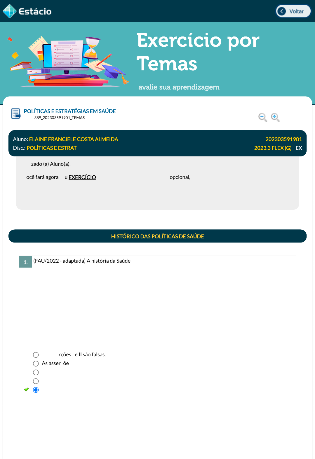 18/11/2023, 17:00 Estácio: Alunos https://simulado.estacio.br/alunos/ 1/5 Exercício por Temas avalie sua aprendizagem (FAU/2022 - adaptada) A história da Saúde Pública no Brasil foi caracterizada por sucessivas reorganizações administrativas e a�rmação de muitas normas e leis. Sobre as políticas de saúde no Brasil, analise as asserções I e II. I - Em 1900, época que corresponde ao Brasil imperial, houve a criação do Instituto Soroterápico Federal, com o objetivo de fabricar soros e vacinas contra a leptospirose para população em geral e manter a higienização no Rio de Janeiro. Porque, II - No Brasil imperial houve algumas tentativas de tentar resolver a questão sanitárias, tais como a regulamentação da lei que cunhou a Junta Central de Higiene Pública, subordinada ao Ministro do Império. Marque a alternativa que apresenta a relação entre as asserções I e II. POLÍTICAS E ESTRATÉGIAS EM SAÚDE Lupa DGT0389_202303591901_TEMAS Aluno: ELAINE FRANCIELE COSTA ALMEIDA Matr.: 202303591901 Disc.: POLÍTICAS E ESTRAT 2023.3 FLEX (G) / EX Prezado (a) Aluno(a), Você fará agora seu EXERCÍCIO! Lembre-se que este exercício é opcional, mas não valerá ponto para sua avaliação. O mesmo será composto de questões de múltipla escolha. Após responde cada questão, você terá acesso ao gabarito comentado e/ou à explicação da mesma. Aproveite para se familiarizar com este modelo de questões que será usado na sua AV e AVS. HISTÓRICO DAS POLÍTICAS DE SAÚDE 1. As asserções I e II são falsas. As asserções I e II são verdadeiras e a asserção II é uma justi�cativa para a asserção I. As asserções I e II são verdadeiras, mas a asserção II não é uma justi�cativa para a asserção I. A asserção I é verdadeira e a asserção II é falsa. A asserção I é falsa e a asserção II é verdadeira. Data Resp.: 18/11/2023 16:51:31 Explicação: No Brasil imperial foi o período histórico que começou com a proclamação da independência do Brasil por D. Pedro I em 1822 e foi até 1889, quando aconteceu a proclamação da república. As ações limitavam-se a manter certa higienização no Rio de Janeiro, a capital do Império, em função da grande disseminação de doenças e condições precárias de vida e da proteção da nobreza portuguesa. É importante reforçar que pouco se tem para relatar sobre avanços ou mudanças na área da saúde. Algumas tentativas foram feitas como a criação da Junta javascript:voltar(); javascript:voltar(); javascript:voltar(); javascript:voltar(); javascript:diminui(); javascript:diminui(); javascript:aumenta(); javascript:aumenta(); 18/11/2023, 17:00 Estácio: Alunos https://simulado.estacio.br/alunos/ 2/5 O movimento de Reforma Sanitária trouxe grandes avanços ao campo da saúde do Brasil. Em relação ao sistema de saúde que existia anteriormente à Reforma sanitária, marque a opção correta: (CESGRANRIO/2013 - adaptada) O período de 1968 a 1973 é muitas vezes referido, na história econômica do Brasil, como o período de "milagre econômico". O termo milagre decorre de que, nesse período, houve uma combinação de: Utilizava o modelo campanhista de intervenção, com foco em ações higienistas na saúde pública brasileira. Um fato marcante na época de sua atuação, foi a Revolta da Vacina. Marque a opção que traz o sanitarista que tem relação com a a�rmativa feita: de Higiene Pública para uni�car os serviços sanitários do império a partir do surgimento de casos de febre amarela. Mesmo com essa criação, alguns anos depois a situação sanitária do país ainda continuava muito frágil; posteriormente foi instituído o Conselho Superior de Saúde Pública, que também não surtiu grandes efeitos práticos sobre a situação da salubridade do país. 2. A atenção primária já era bem estruturada e interdisciplinar. Houve um declínio signi�cativo do modelo hospitalocêntrico. O modelo de assistência à saúde existente era prioritariamente curativo. O modelo de assistência à saúde existente era prioritariamente preventivo. Não houve estímulo à iniciativa privada. Data Resp.: 18/11/2023 16:52:17 Explicação: A resposta correta é: O modelo de assistência à saúde existente era prioritariamente curativo. 3. redistribuição de renda e aumento de doentes. expansão econômica e aumento da divulgação de dados sobre epidemias. aumento dos índices de pobreza e diminuição do número de óbitos. aumento da produtividade do país e surgimento de epidemias. expansão econômica e diminuição de epidemias. Data Resp.: 18/11/2023 17:00:04 Explicação: O chamado "milagre econômico" conferiu aumento da produtividade do país, aumentou a carga horária dos trabalhadores e reduziu salários, constituindo um período de grande concentração de renda para poucos e de altos índices de pobreza, in�ação e desemprego para a maior parte das famílias do Brasil. Com o aumento da miséria, nossa população adoeceu mais - deu-se o surgimento de epidemias como poliomielite e meningite, e os veículos de mídia foram censurados em relação à divulgação dos dados alarmantes sobre essas epidemias. 4. Carlos Chagas. Emílio Ribas. Oswaldo Cruz. Sérgio Arouca. Getúlio Vargas. Data Resp.: 18/11/2023 16:54:24 18/11/2023, 17:00 Estácio: Alunos https://simulado.estacio.br/alunos/ 3/5 (INSTITUTO AOCP/ 2021 - adaptada) No segundo governo de Getúlio Vargas, no campo da saúde pública, uma corrente de opinião começou a se consolidar e adquiriu estatuto de orientação do Ministério da Saúde até o golpe militar de 1964. A ideia-força desse pensamento era de que o nível de saúde de uma população depende, em primeiro lugar, do grau de desenvolvimento econômico de um país. Tal corrente denomina-se sanitarismo desenvolvimentista. Sobre a saúde na Era vargas, marque a alternativa correta. As proposições do Movimento de Reforma Sanitária Brasileira eram dirigidas, basicament