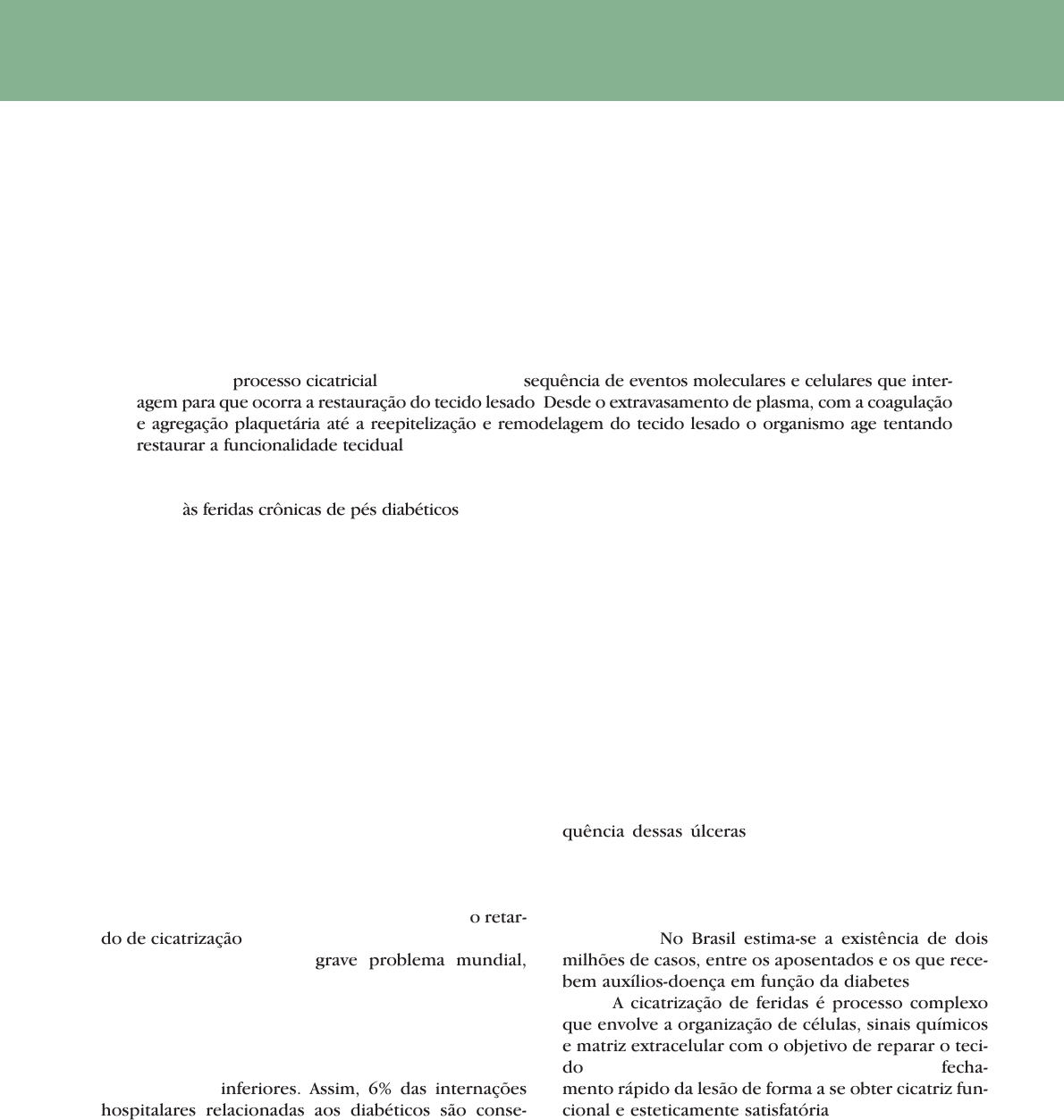 An Bras Dermatol. 2009;84(3):257-62. 257 � Aspectos celulares da cicatrização * Cellular aspects of wound healing Ricardo José de Mendonça1 Joaquim Coutinho-Netto2 Resumo: O processo cicatricial compreende uma sequência de eventos moleculares e celulares que inter- agem para que ocorra a restauração do tecido lesado. Desde o extravasamento de plasma, com a coagulação e agregação plaquetária até a reepitelização e remodelagem do tecido lesado o organismo age tentando restaurar a funcionalidade tecidual. Assim, este trabalho abrange os diversos aspectos celulares envolvidos no processo cicatricial, bem como os principais medicamentos utilizados no tratamento de patologias rela- cionadas às deficiências na cicatrização. São abordados também, os aspectos econômicos referentes, sobre- tudo, às feridas crônicas de pés diabéticos. Palavras-chave: Agentes indutores da angiogênese; Cicatrização de feridas; Permeabilidade capilar Abstract: Wound healing is a dynamic interactive process that involves a sequence of molecular and cel- lular events. Recent advances in cellular and molecular biology have greatly expanded our understanding of the biological process involved in wound repair and tissue regeneration. From plasma extravasation, with coagulation and platelet aggregation, to reepithelialization and remodeling of injured tissue, the organism acts by trying to restore functionality tissue. Thus, the present study encompasses several cellu- lar aspects involved in the wound healing process, as well as the main drugs used in treating the patholo- gy related to wound healing complications. Economic aspects are also addressed, mainly related to chron- ic wounds of diabetic feet. Keywords: Angiogenesis inducing agents; Capillary permeability; Wound healing Aprovado pelo Conselho Editorial e aceito para publicação em 08.12.2008. * Trabalho realizado no Departamento de Bioquímica e Imunologia da Faculdade de Medicina de Ribeirão Preto – Universidade de São Paulo (USP) – Ribeirão Preto (SP), Brasil. Conflito de interesse: Nenhum / Conflict of interest: None Suporte financeiro / Financial funding: Coordenação de Aperfeiçoamento de Pessoal de Nível Superior – Capes e Fundação de Apoio ao Ensino, Pesquisa e Assistência – Faepa. 1 Pós-doutorando do Departamento de Bioquímica e Imunologia da Faculdade de Medicina de Ribeirão Preto – Universidade de São Paulo (USP) – Ribeirão Preto (SP), Brasil. 2 Professor-associado do Departamento de Bioquímica e Imunologia da Faculdade de Medicina de Ribeirão Preto – Universidade de São Paulo (USP) – Ribeirão Preto (SP), Brasil. ©2009 by Anais Brasileiros de Dermatologia REVISÃO INTRODUÇÃO Os custos dos tratamentos de patologias rela- cionadas à deficiência cicatricial aumentam a impor- tância dos estudos em busca de medicamentos e cura- tivos capazes de interagir com o tecido lesado, tendo por objetivo acelerar o processo. Por exemplo, o retar- do de cicatrização, como ocorre no caso de úlceras de pés diabéticos, constitui grave problema mundial, tanto financeiro quanto social. Dados dos Estados Unidos informam que 15,5% da população mundial com idade superior a 30 anos é composta de diabéti- cos, dos quais cerca de 15% desenvolvem úlceras de difícil cicatrização ao longo da vida, principalmente, nos membros inferiores. Assim, 6% das internações hospitalares relacionadas aos diabéticos são conse- quência dessas úlceras e, em caso de amputação, o tempo médio de internação é de cerca de três sema- nas. Esses casos geram para os sistemas de saúde custo extra que varia de U$ 8.000 a U$ 12.000/pacien- te. Dos amputados vão a óbito em cinco anos cerca de 39 a 68%.1 No Brasil estima-se a existência de dois milhões de casos, entre os aposentados e os que rece- bem auxílios-doença em função da diabetes.2 A cicatrização de feridas é processo complexo que envolve a organização de células, sinais químicos e matriz extracelular com o objetivo de reparar o teci- do. Por sua vez, o tratamento de feridas busca o fecha- mento rápido da lesão de forma a se obter cicatriz fun- cional e esteticamente satisfatória. Para tanto, é indis- Gabs Realce Gabs Realce Gabs Realce Gabs Realce Gabs Realce Gabs Realce Gabs Realce Gabs Realce Gabs Realce Gabs Realce Gabs Realce 258 Mendonça RJ, Coutinho-Netto J An Bras Dermatol. 2009;84(3):257-62. pensável melhor compreensão do processo biológico envolvido na cicatrização de feridas e regeneração tecidual.3 Com o rompimento tecidual nos animais verte- brados, logo se inicia o processo de reparo, que com- preende uma sequência de eventos moleculares obje- tivando a restauração do tecido lesado. Só durante a fase fetal o reparo de lesões se dá sem a formação de cicatriz, ocorrendo perfeita restauração do tecido pelo processo de neoformação tecidual. Após o nascimen- to, o organismo falha nesse processo, desenvadeando a formação da cicatriz após o reparo.4-5 CLASSIFICAÇÃO DOS PROCESSOS BIOLÓGICOS DA CICATRIZAÇÃO O processo de cicatrização tem sido convenien- temente dividido em três fases que se sobrepõem de forma contínua e temporal: inflamatória, proliferativa e de remodelagem.6 1- Fase inflamatória Após a ocorrência do ferimento, inicia-se o extravasamento sanguíneo que preenche a área lesada com plasma e elementos celulares, principalmente plaquetas. A agregação plaquetária e a coagulação san- guínea geram um tampão, rico em fibrina, que além de restabelecer a hemostasia e formar uma barreira contra a invasão de microrganismos, organiza matriz provisória necessária para a migração celular. Essa matriz servirá também, como reservatório de citocinas e fatores de crescimento que serão liberados durante as fases seguintes do processo cicatricial.7-8 As plaquetas, essenciais à formação desse tam- pão hemostático, também secretam múltiplos media- dores, incluindo fatores de cr