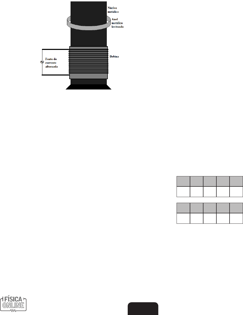 288 Fí si ca - 1. 00 0 Q ue st õe s GABARITO LEIS DE LENZ 1 2 3 4 5 A C A A B 6 7 8 9 10 C C D C C 8. O anel saltante ou anel de Thomson é uma interessante demonstração dos efeitos eletromagnéticos. Ele consiste em uma bobina, um anel metálico, normalmente de alu- mínio, e um núcleo metálico que atravessa a bobina e o anel. Quando a bobina é ligada a uma tomada de corrente alternada, o anel de alumínio salta e fica levitando em uma altura que pode ser considerada constante. A figura mostra o dispositivo. Um dos fatos que contribuem para a levitação do anel metálico, apesar de não ser o único, é a fonte de corrente elétrica ser alternada, pois o anel não levitaria se ela fosse contínua. A força sobre o anel metálico e sua consequente levitação devem-se ao fato de a bobina percorrida por corrente elétrica alternada gerar A) uma polarização elétrica variável em função do tempo no núcleo metálico que induz uma carga elétrica no anel metálico. B) um campo elétrico constante em função do tempo no núcleo metálico que induz uma diferença de potencial no anel metálico. C) uma polarização magnética constante em função do tempo no núcleo metálico que induz um polo mag- nético no anel metálico. D) um campo magnético variável em função do tempo no núcleo metálico que induz uma corrente elétrica no anel metálico. 9. Árvore derruba transformador, carros são in- cendiados e pessoas ficam ilhadas no Lourdes Nove veículos ficaram danificados após um transformador explodir ao ser atingido por uma árvore de grande porte. [...] O local foi isolado pelos bombeiros por causa do risco de choque elétrico e a Cemig foi acionada. Teste- munhas contaram que algumas pessoas ficaram presas no interior de um restaurante, aguardando a chegada dos funcionários da empresa de energia, pois um cabo energizado estaria bem em frente ao estabelecimento. Os clientes do restaurante foram retirados apenas após a energia ser cortada na região. Disponível em: . Acesso em: 22 abr. 2018. (Adaptado). A retirada dos clientes do restaurante somente após cortar a energia elétrica foi uma precaução importante, uma vez que o transformador tem a função de A) aumentar valores de corrente elétrica através da passagem de corrente alternada por uma bobina que possui mesmo número de espiras do secundário. B) reduzir valores de resistência elétrica através de indu- ção eletromagnética, que ocorre a partir da passagem de corrente alternada no primário. C) aumentar ou reduzir valores de tensão elétrica através da criação de corrente elétrica induzida a partir da variação do fluxo gerada no primário. D) aumentar ou reduzir valores de potência elétrica através da passagem de corrente elétrica pela bo- bina do primário, que possui mais espiras que a do secundário. 10. Um estudante de física decidiu variar a tensão em um circuito utilizando um transformador. Assim, ele utilizou um transformador em que o número de espiras do primá- rio é o dobro do número de espiras do secundário. Com esse transformador, ele montou dois circuitos elétricos: No primeiro, ele ligou uma bateria de 12 V no primário do transformador. No segundo, ele ligou o primário do transformador em uma tomada de 120 V de sua residência. Feito isso, ao medir a voltagem no secundário, ele obteve no primeiro e no segundo circuitos, respectivamente: A) 0 V e 240 V B) 6 V e 60 V C) 0 V e 60 V D) 24 V e 240 V 289 Fí si ca - 1. 00 0 Q ue st õe s FÓTON 1. Após muitos estudos dos cientistas, hoje sabemos que a luz é constituída por minúsculas partículas elementares, que foram denominadas como fótons. Inúmeros são os questionamentos sobre os fótons, sem dúvida essas perguntas movem o de- senvolvimento da ciência. O estudo dessas partículas vem se tornando cada vez mais comum e importante. No entanto, a luz e seu comportamento nem sempre foram tão claros. Acerca da luz sempre giraram inúmeras dúvidas para a humanidade, inicialmente e até o século XIX, a suposição era de que a luz viajava a uma velocidade infinita, ou seja, ela era instantânea. Nesse mesmo século experiências realizadas por diversos cientistas começaram a desvendar algumas suposições até então não provadas e, por exemplo, a utilização de sistemas de espelhos posicionados a grandes distâncias, foi possível permitir, demonstrar, que a luz se propagava com uma de- terminada velocidade que não era infinita, mas, sim, finita (velocidade da luz é conhecida como sendo c = 3 x 108 m/s). Finalmente, no início do século XX, em 1905, foi comprovada a dualidade onda partícula da luz, explicando satisfatoriamente o efeito, dando o nome à partícula luminosa de fóton. Assim o cientista Albert Einstein explicou o efeito fotoelétrico, que lhe rendeu um prêmio Nobel pelo feito. A respeito de fóton é correto afirmar que ele faz parte do estudo A) da hidrostática. B) da mecânica quântica. C) da gravitação universal. D) do impulso e quantidade de movimento. 2. Um fato corriqueiro ao se cozinhar arroz é o derramamento de parte da água de cozimento sobre a chama azul do fogo, mudando-a para uma chama amarela Essa mudança de cor pode suscitar interpretações diversas, relacionadas às substâncias presentes na água de cozimento Além do sal de cozinha (NaCI), nela se encontram carboidratos, proteínas e sais minerais. Cientificamente, sabe-se que essa mudança de cor da chama ocorre pela A) reação do gás de cozinha com o sal, volatilizando gás cloro. B) emissão de fótons pelo sódio, excitado por causa da chama. C) produção de derivado amarelo, pela reação com o car- boidrato. D) reação do gás de cozinha com a água, formando gás hidrogênio. E) excitação das moléculas de proteínas, com formação de luz amarela. 3. Pesquisadores conseguiram estimular a absorção de energia luminosa em plantas graças ao uso de nano- tubos de carbono. Para isso, nanotubos de carbono 