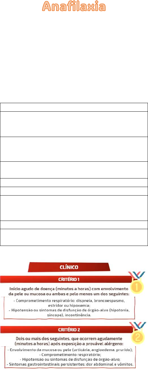 1 Helo Lima – Turma V Urgência Médica • Anafilaxia é uma reação potencialmente fatal de hipersensibilidade sistêmica grave. É uma reação de cascata mediada por mastócitos e basófilos de uma forma dependente de IgE. Critérios da anafilaxia: Um dos dois precisam ser preenchidos. Critério 1 • Início agudo de doença com envolvimento simultâneo de pele, mucosa e pelo menos um dos seguintes: Comprometimento respiratório – dispneia, broncoespasmos, estridor PFE reduzido ou hipoxemia. Hipotensão ou sintomas de disfunção órgãos alvo – hipotonia, sincope e incontinência. Sintomas gastrointestinais graves. Critério 2 • Hipotensão e broncoespasmos ou acometimento da laringe mesmo na ausência de envolvimento de pele típico: Crianças – PA baixa ou queda de 30% da sistólica Adultos – sistólica abaixo de 90 mmHg ou queda de 30% da basal do pct. • Choque anafilático : É uma reação anafilática gerando insuficiente entrega de O2 para os tecidos, causando um colapso cardiovascular e redução do fluxo sanguíneo. • Reação anafilactóide : Mesmo sentido da anafilaxia, porém não são IgE mediadas e não necessitam de exposição sensibilizadora. Ex – contraste iodado. Recorrência de anafilaxia: • Picadas de insetos 40-60%. • Agentes radiocontrates 20-40%. • Penicilina 10-20%. Fisiopatologia As reações é a degranulação de mastócitos e liberação de mediadores por basófilos. Mecanismo de hipersensibilidade tipo I (mediado por IgE), o alérgeno se liga ao segmento Fab da IgE e ativa e libera proteinoquinases presentes em mastócitos e basófilos, liberando histamina e triptase. A histamina liga-se aos receptores H1 (vasoconstritor e broncoconstritor) e H2 (vasodilatador e aumenta a permeabilidade capilar). A triptase causa efeitos de edema e distúrbios hemorrágicos. Já os mecanismos independente de IgE vão ser ativados por IgG ou por complemento. Fatores de predisposição: • Pacientes no extremos de idade; • Episódios de doença respiratória; 2 Helo Lima – Turma V • Comorbidades – asma, IRC e doença cardiovascular. • Viagem; • Ingestão de álcool; • Mastocitose e atopia grave; • Uso de betabloqueadores, IECAs e AINEs. Fatores de rico anafilaxia grave: • Asma mal controlada; • História de mastocitose; • Esforço físico extremo; • Reação anafilática anterior; • Exposição a gatilhos durante o uso concomitante de certos medicamentos. OBS: quanto mais rápida a resposta de anafilaxia, maior a chance de ser uma anafilaxia grave. Achados clínicos Tempo de contato: • 5min após injeção de droga. • 10-15min após picada de inseto. • 35min após ingestão de alimentos. O quadro clínico pode ser unifásico (mais comum) ou bifásico, sendo o bifásico que desaparecem os sintomas ou apresentam uma melhora e após 1 a 8h eles podem voltar. Existem dois tipos incomuns de anafilaxia: • Fase tardia – Só em relatos de casos. • Fase protraída – pacientes que os sintomas não foram resolvidos de forma satisfatória e precisa de intubação, infusão contínua de adrenalina. Manifestações clínicas Pele, mucosa e tecido subcutâneo (80-90%): • Urticária, angioedema, rubor facial, prurido e rash morbiliforme. Respiratório (70%): • Rinorreia, congestão nasal, espirros, estridor, disfonia, dispneia, aperto torácico, broncoespasmos e cianose. Cardiovascular (45%): • Dor torácica, taquicardia, bradicardia, hipotensão, disritmia e parada cardíaca. Gastrointestinal (45%): • Dor abdominal, náusea, vomito e diarreia. Sistema nervoso central (15%): • Sensação de morte iminente, alteração no nível de consciência, tontura confusão e cefaleia. Sinais de alarme • Rápida progressão dos sintomas • Estridor e dificuldade respiratória • Tórax silente • Hipotensão ou choque • Necessidade de droga vasoativa • Arritmias malignas • Náuseas e vômitos persistente. Exames complementares O diagnóstico é clínico. Dosagem de histamina (picadas de inseto) e triptases (reação alimentar). Tratamento O primeiro passo da abordagem é evitar o fator precipitante. Colocar o paciente em posição supina, MMII elevados e acesso calibroso. Oximetria de pulso com oferta de oxigênio de 8-10L. Em gestante a posição preferível é o decúbito lateral esquerdo. Medicamentos: Adrenalina IM vasto lateral da coxa. Doses: • 0,5 mg em adultos e criança >12 anos. 3 Helo Lima – Turma V • 0,3 mg em crianças de 6 a 12 anos. • 0,01mg/kg em criança• Acesso venoso e intraósseo e drogas. • Dispositivos de compressões mecânica. Fisiopatologia Existem três fases distintas na PCR: • Fase elétrica – período inicial de 4 a 5min. • Fase hemodinâmica – período de 4 a 10min. • Fase metabólica – período que sucede 10min. Diagnóstico Irresponsividade e ausência de pulso central. Fibrilação Ventricular (FV) Nessa situação a pedra angular do tratamento e a desfibrilação precoce. Ela é caracterizada por um tremulado grosseiro da linha de base onde não se identifica complexo QRS. Ela pode se apresentar de maneira FV grossa e FV fina. Achados do ECG: • Ritmo caótico (não tem QRS organizado) • FC >500 bpm • QRS alargado Taquicardia Ventricular (TV) Traçado eletrocardiográfico com QRS alargado. Achados do ECG: • FC>100 bpm. • Ritmos regulares. Atividade Elétrica sem pulso (AESP) AESP pode ser dividida em dis grupos: Pseudo-AESP: • É caracterisda pela ausência de pulso central, porem tem contração cardíaca visualizada no ECG. AESP verdadeira: • Não há pulos palpável e nem visualização de contração. Geralmente a AESP verdadeira produz bradicardia com QRS largo e ausência de onda P. • AESP com QRS estreito(causa mecânica) e largo (causa metabólica). Assistolia Representa completa ausência da atividade elétrica miocárdica. Assim devemos inicialmente seguir o protocolo da linha reta que consiste em: 6 Helo Lima – Turma V • Checa