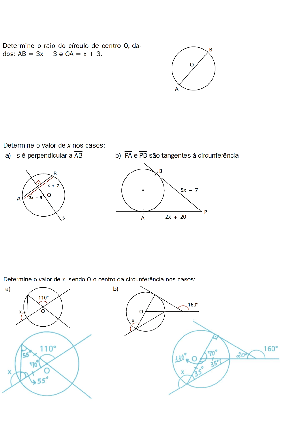 Novembro Licenciatura Plena em Matemática Graduação Módulo II EXERCÍCIO 9 01. 02. 03. RESOLUÇÕES DAS QUESTÕES DO EXERCÍCIO 9 GEOMETRIA PLANA – 2023.2 Como AB é diâmetro e OA é raio, então: 𝑑 = 2𝑟 3𝑥 − 3 = 2. (𝑥 + 3) 3𝑥 − 3 = 2𝑥 = 6 3𝑥 − 2𝑥 = 6 + 3 𝑥 = 9 Raio = x + 3 = 9 + 3 = 12 3x – 5 = x + 7 3x – x = 7 + 5 2x = 12 x = 6 5x – 7 = 2x + 20 5x – 2x = 20 + 7 3x = 27 x = 9 x + 55 = 180 x = 125° x + 35 = 180 x = 145° 04. 05. 06. a) d = 10 cm R + r = 7 cm R – r = 3 cm d > R + r 10 > 7 Circunferências externas ou exteriores b) d = 15 cm R + r = 15 cm R – r = 5 cm d = R + r 15 = 15 Circunferências tangentes externas c) d = 4 cm R + r = 10 cm R – r = 4 cm d = R – r 4 = 4 Circunferências tangentes internas d) d = 0 Circunferência s concêntricas (possuem o mesmo centro) ;;;;; e) d = 10 cm R + r = 14 cm R – r = 2 cm R + r